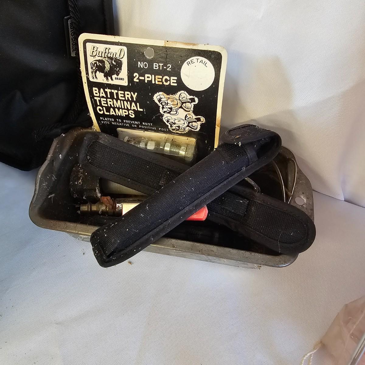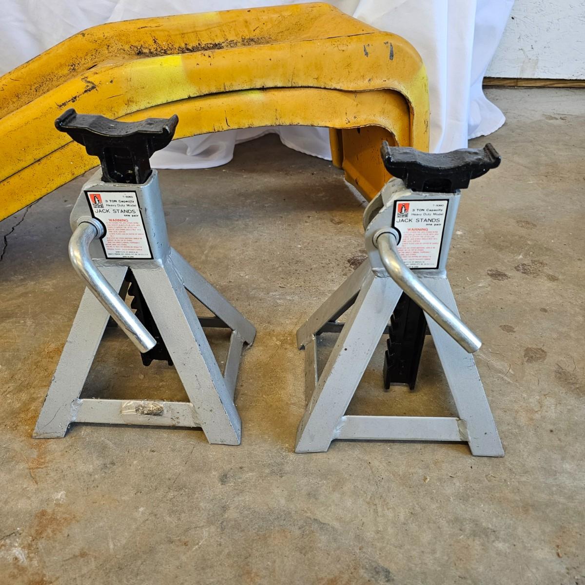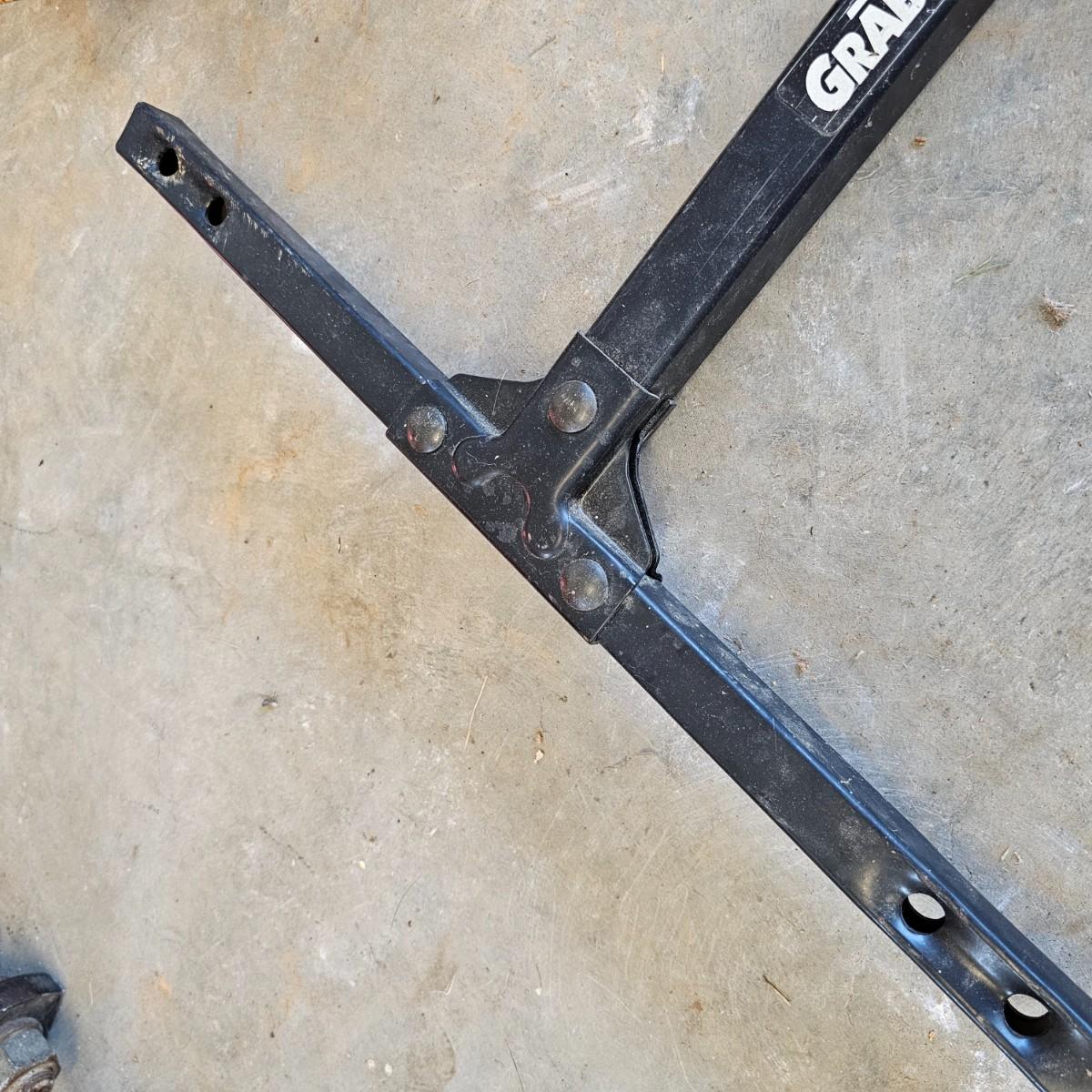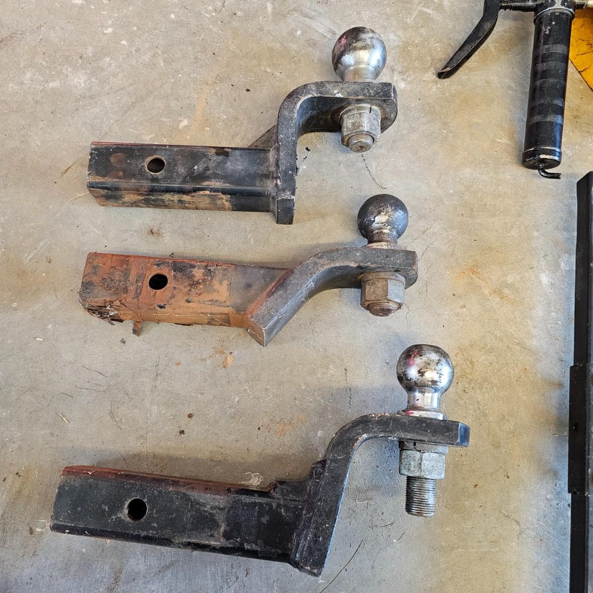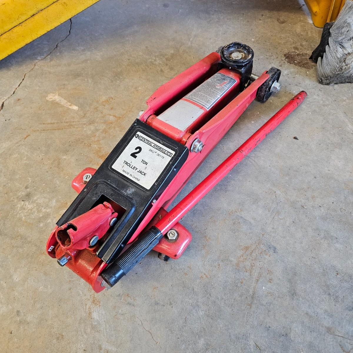 An assortment of tools and other pieces for automotive use. Car ramps, jack stands, trailer hitch pieces and pins, more. Straps, bungies, tire gauges. Generator for 2000 Honda Goldwing.. Graber tow bar setup. One Honda motorcycle rim, approximately 17"D. Grease guns, tread assists, tire repair kit. Ramps are 10" x 34" x 11"H. One steel tow chain, approximately 13' long. Red tub included. See photos for details. Local pickup only.