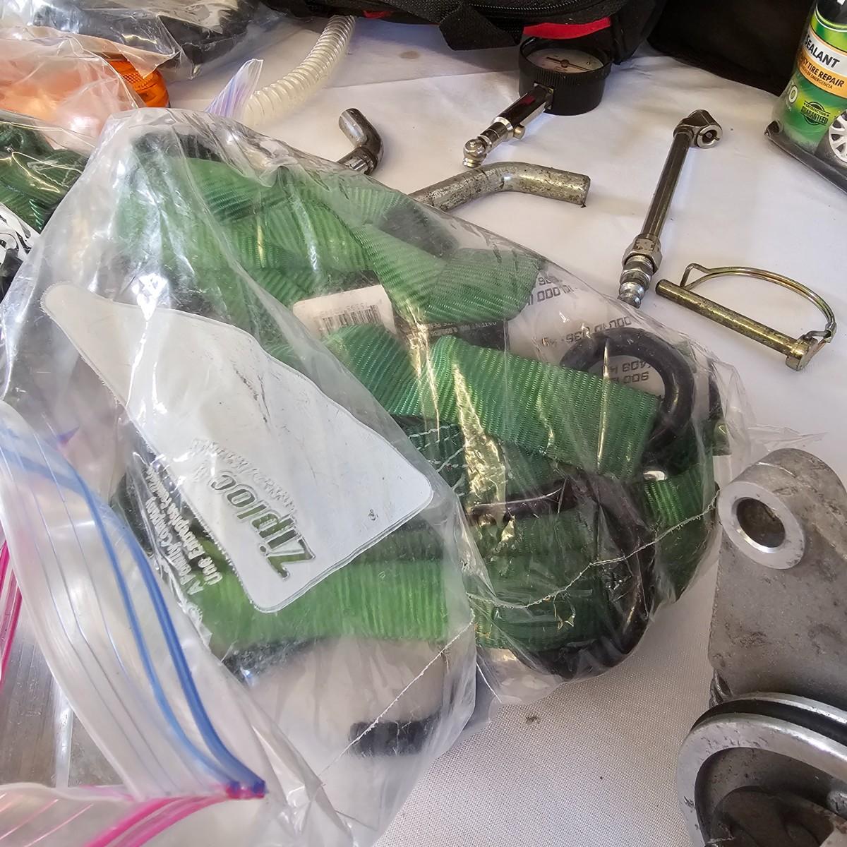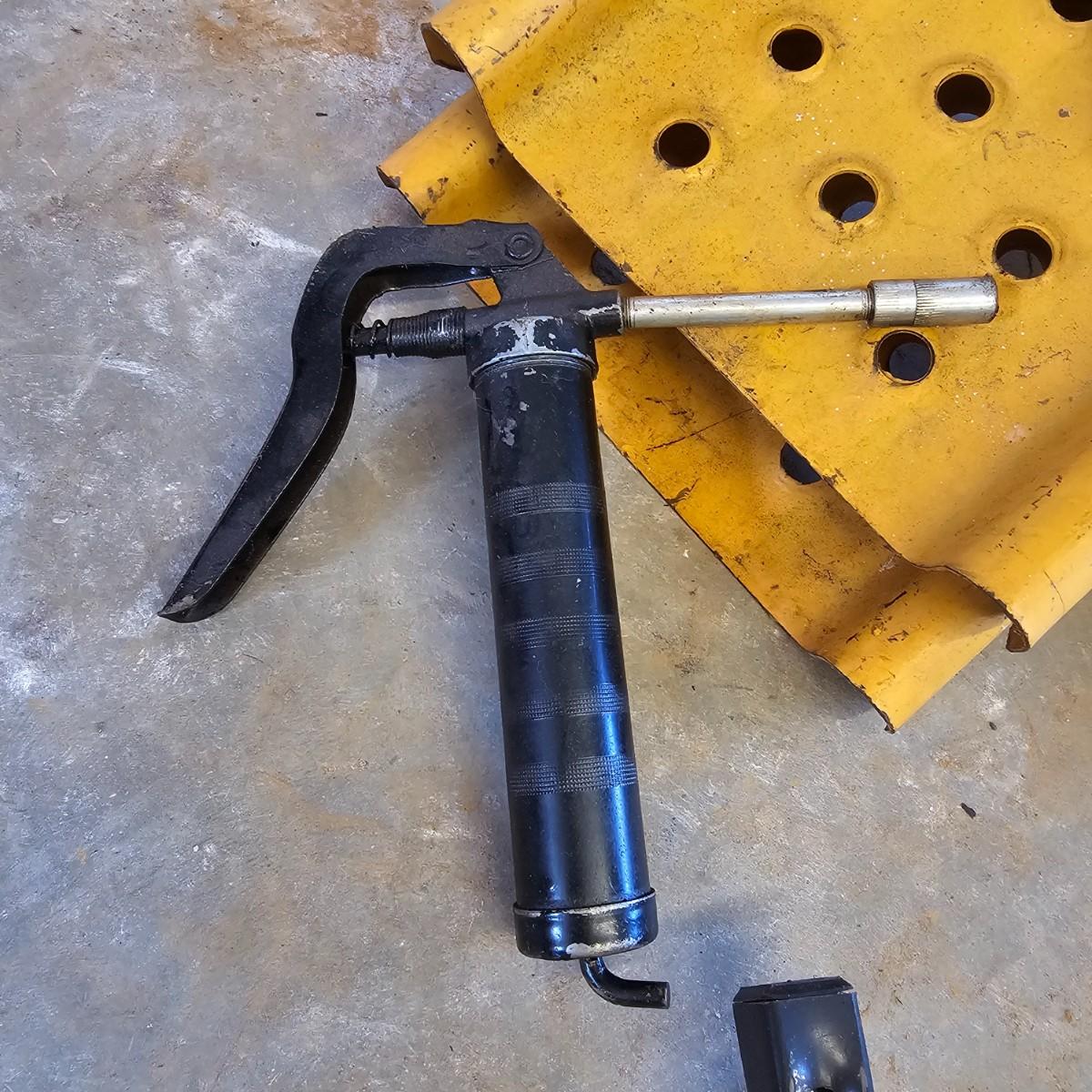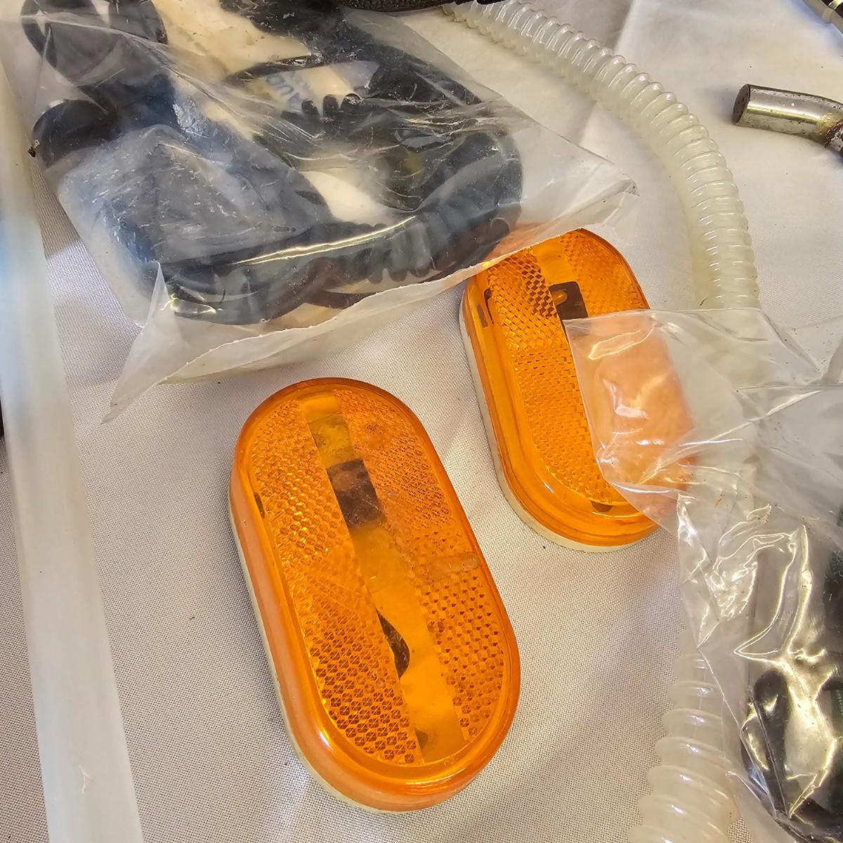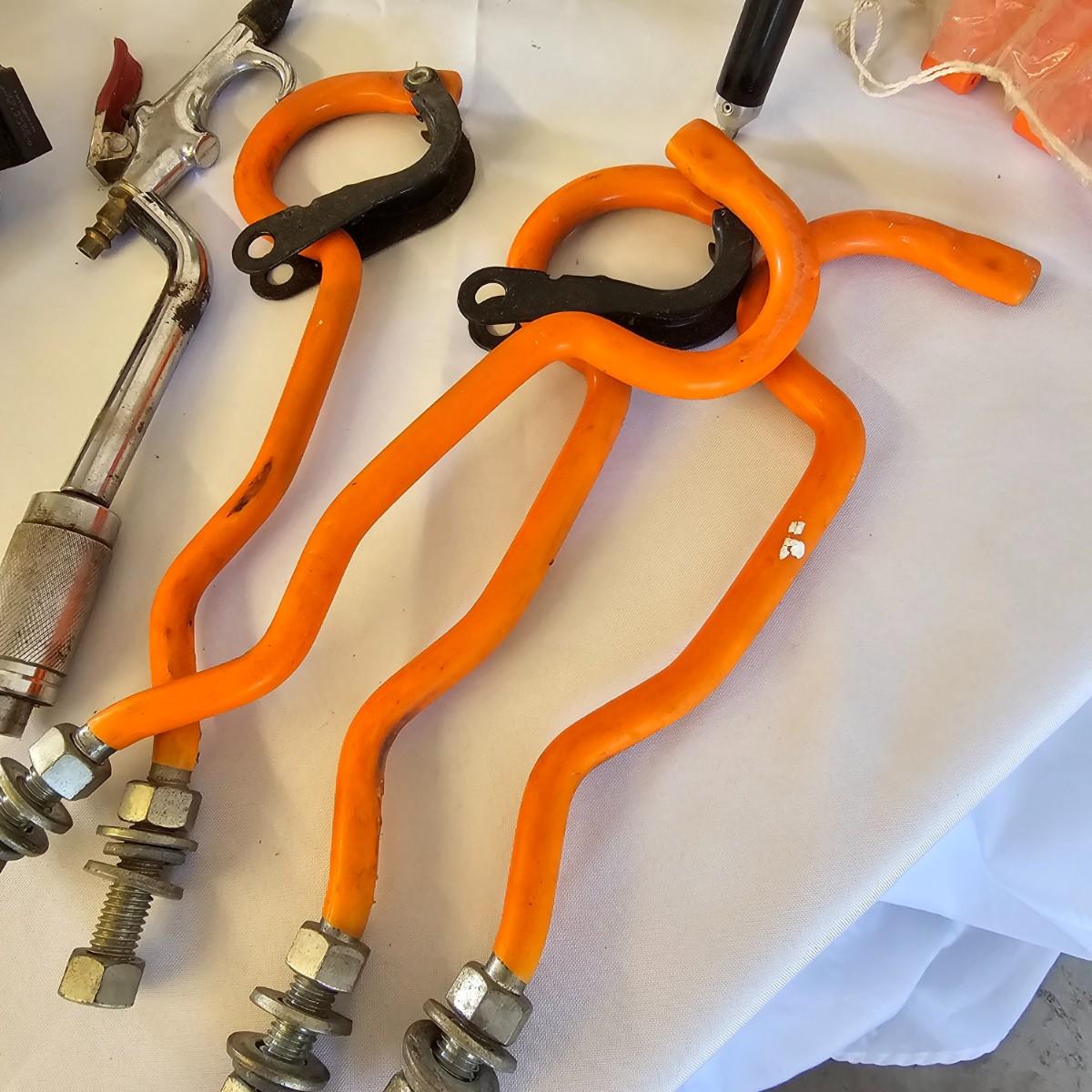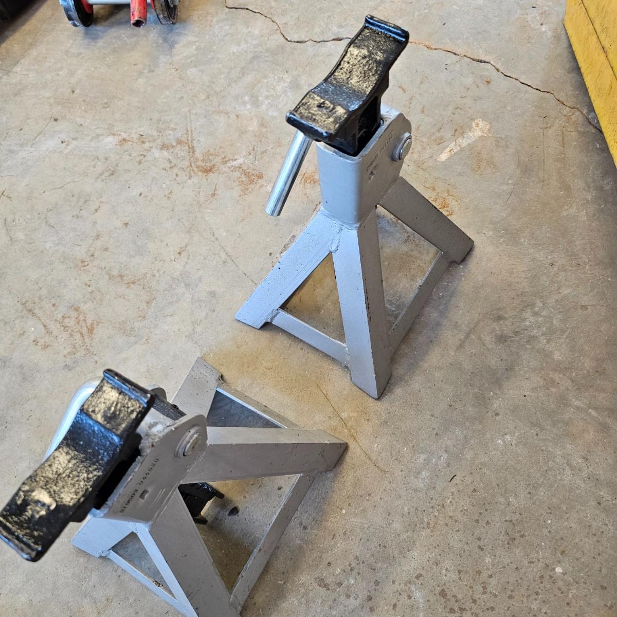 An assortment of tools and other pieces for automotive use. Car ramps, jack stands, trailer hitch pieces and pins, more. Straps, bungies, tire gauges. Generator for 2000 Honda Goldwing.. Graber tow bar setup. One Honda motorcycle rim, approximately 17"D. Grease guns, tread assists, tire repair kit. Ramps are 10" x 34" x 11"H. One steel tow chain, approximately 13' long. Red tub included. See photos for details. Local pickup only.