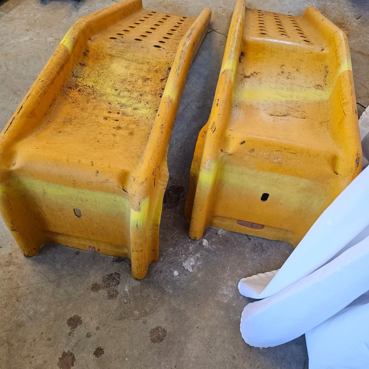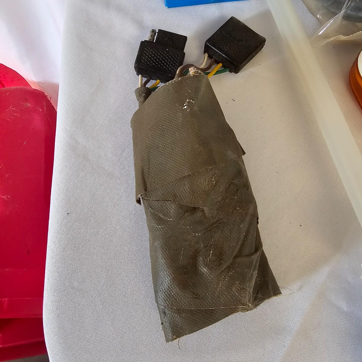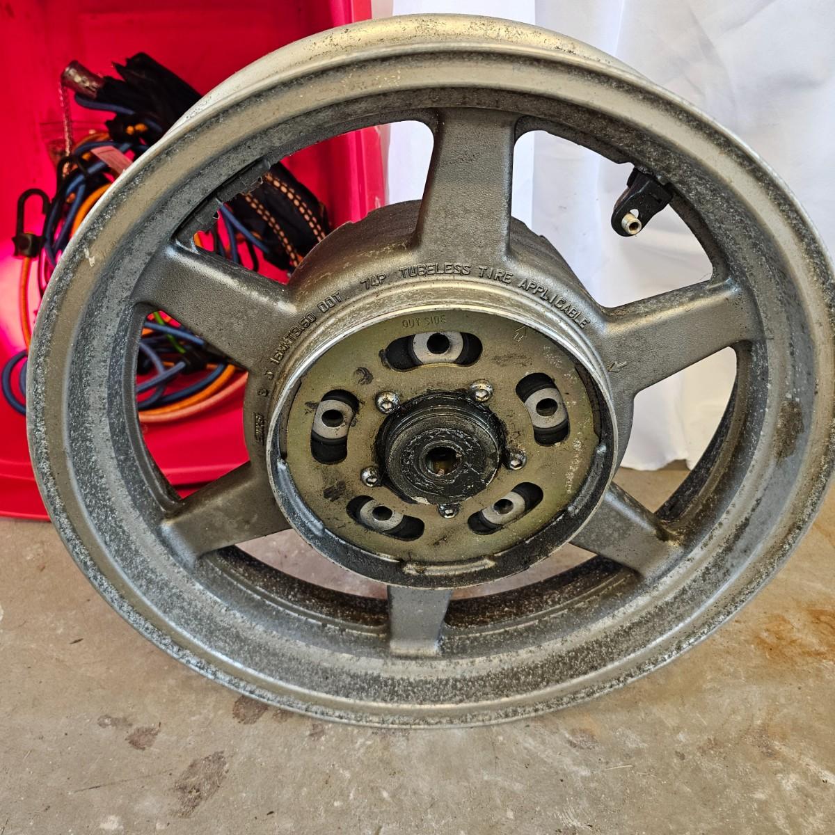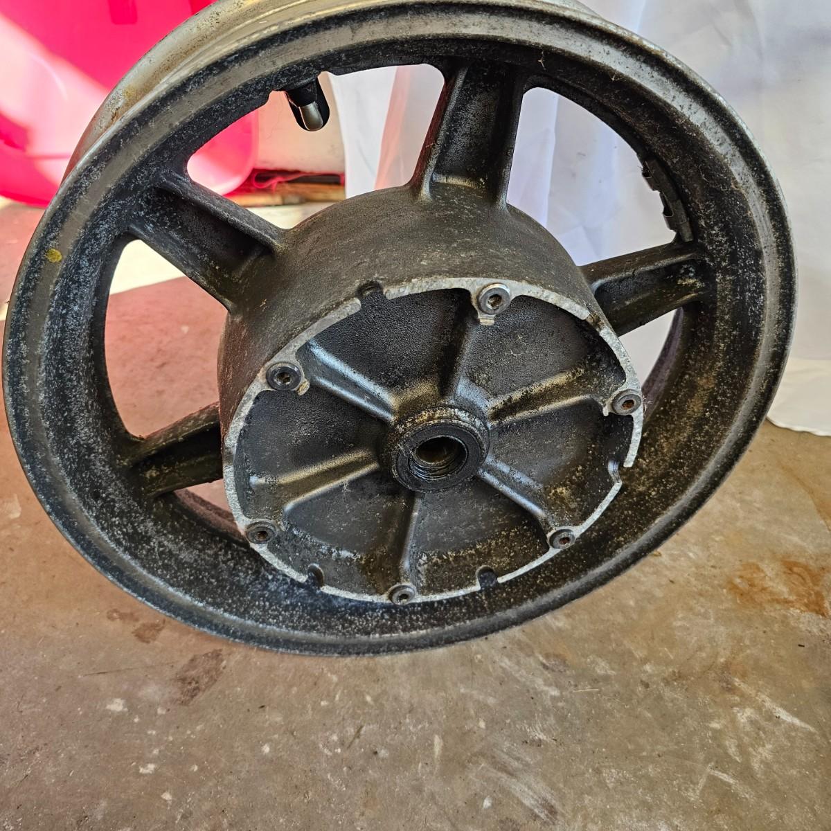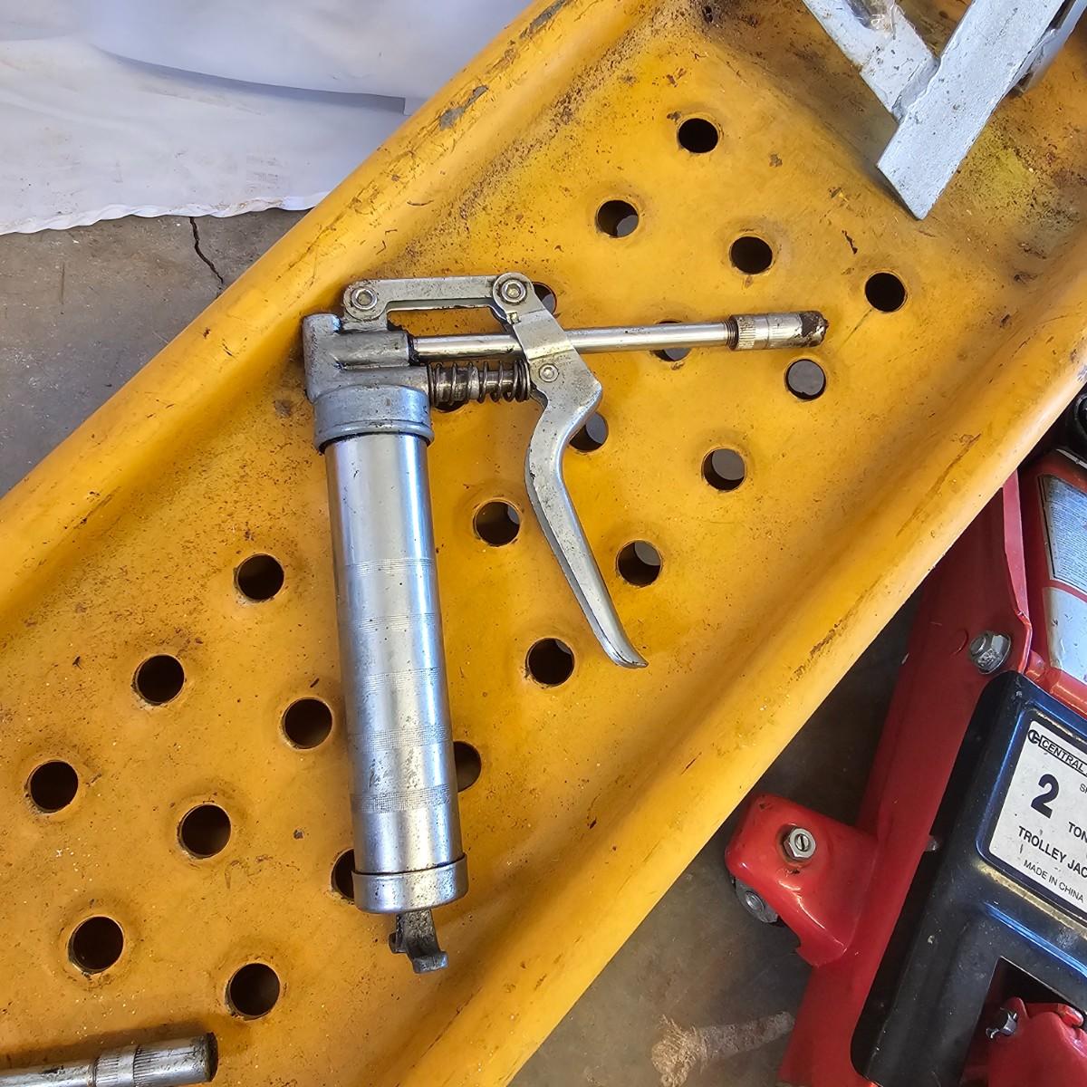 An assortment of tools and other pieces for automotive use. Car ramps, jack stands, trailer hitch pieces and pins, more. Straps, bungies, tire gauges. Generator for 2000 Honda Goldwing.. Graber tow bar setup. One Honda motorcycle rim, approximately 17"D. Grease guns, tread assists, tire repair kit. Ramps are 10" x 34" x 11"H. One steel tow chain, approximately 13' long. Red tub included. See photos for details. Local pickup only.