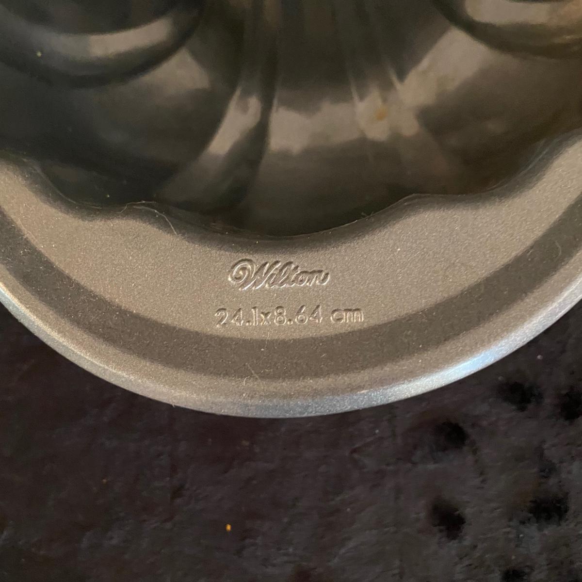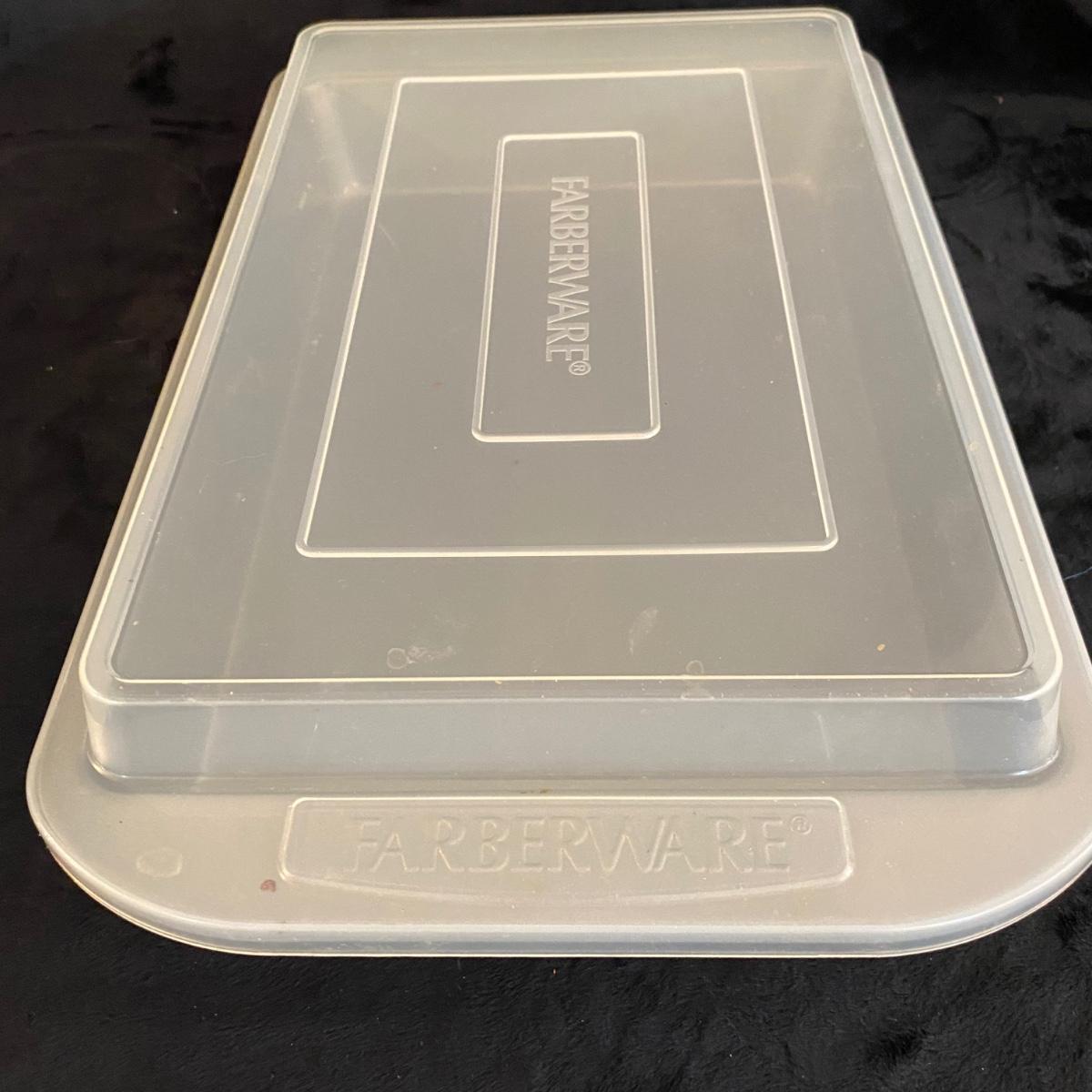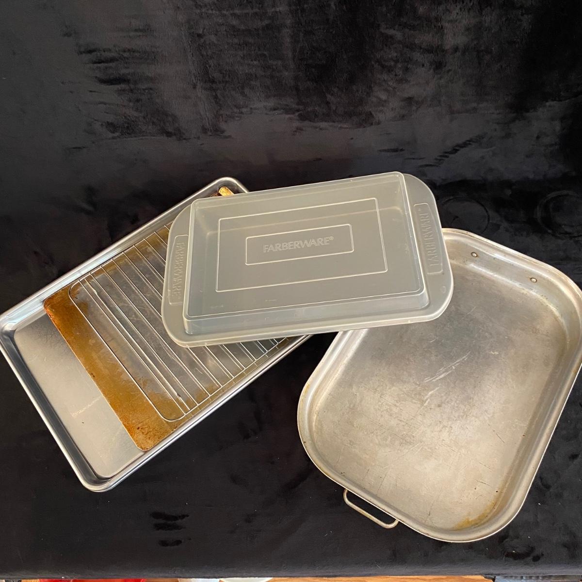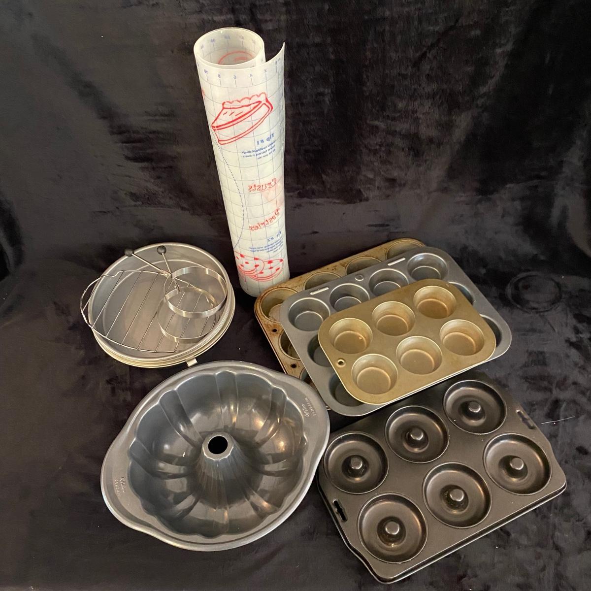 Assorted bakeware. 21 pieces in total. Largest cookie sheets are 17.5” x 12.5”. Cake pan with lid is Farberware. Bundt cake pan is Wilton. Pastry mat, six round cake pans, one rectangular cake pan, three cookie sheets, two cooling rack.s, one Bundt pan, four muffin pans, one roasting pan. Good condition.