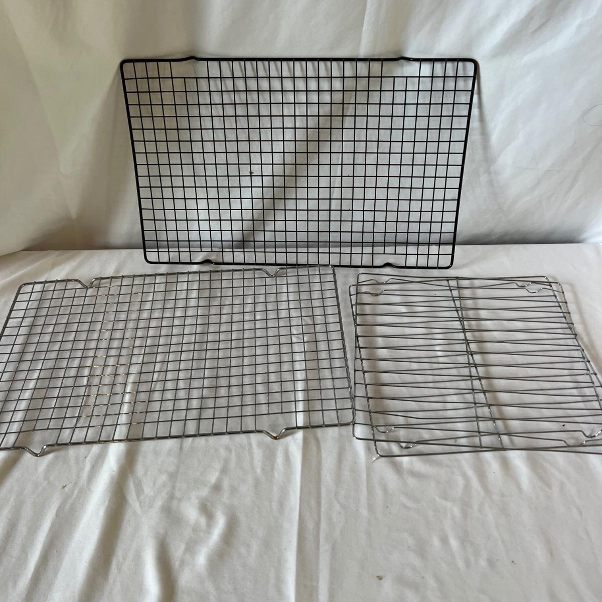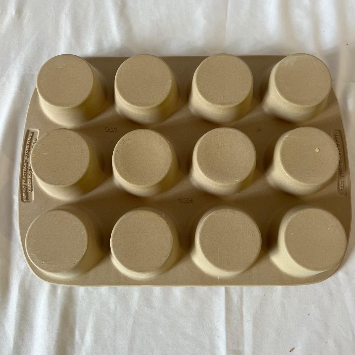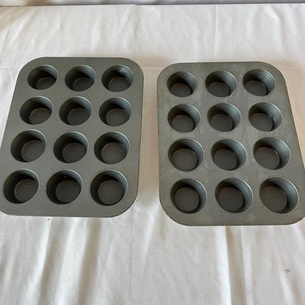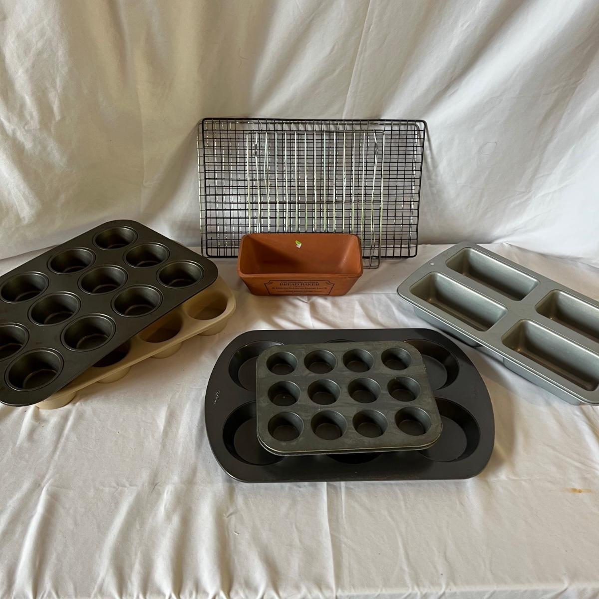 Three muffin tins, one Pampered Chef stoneware muffin pan, four drying racks, one mini loaf pan and one tart pan.