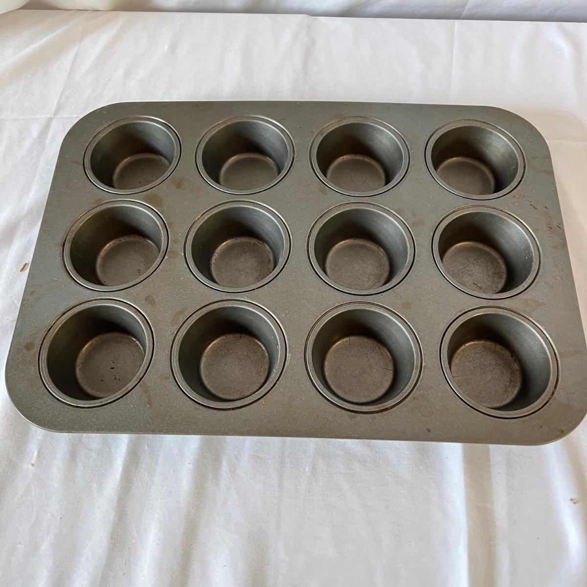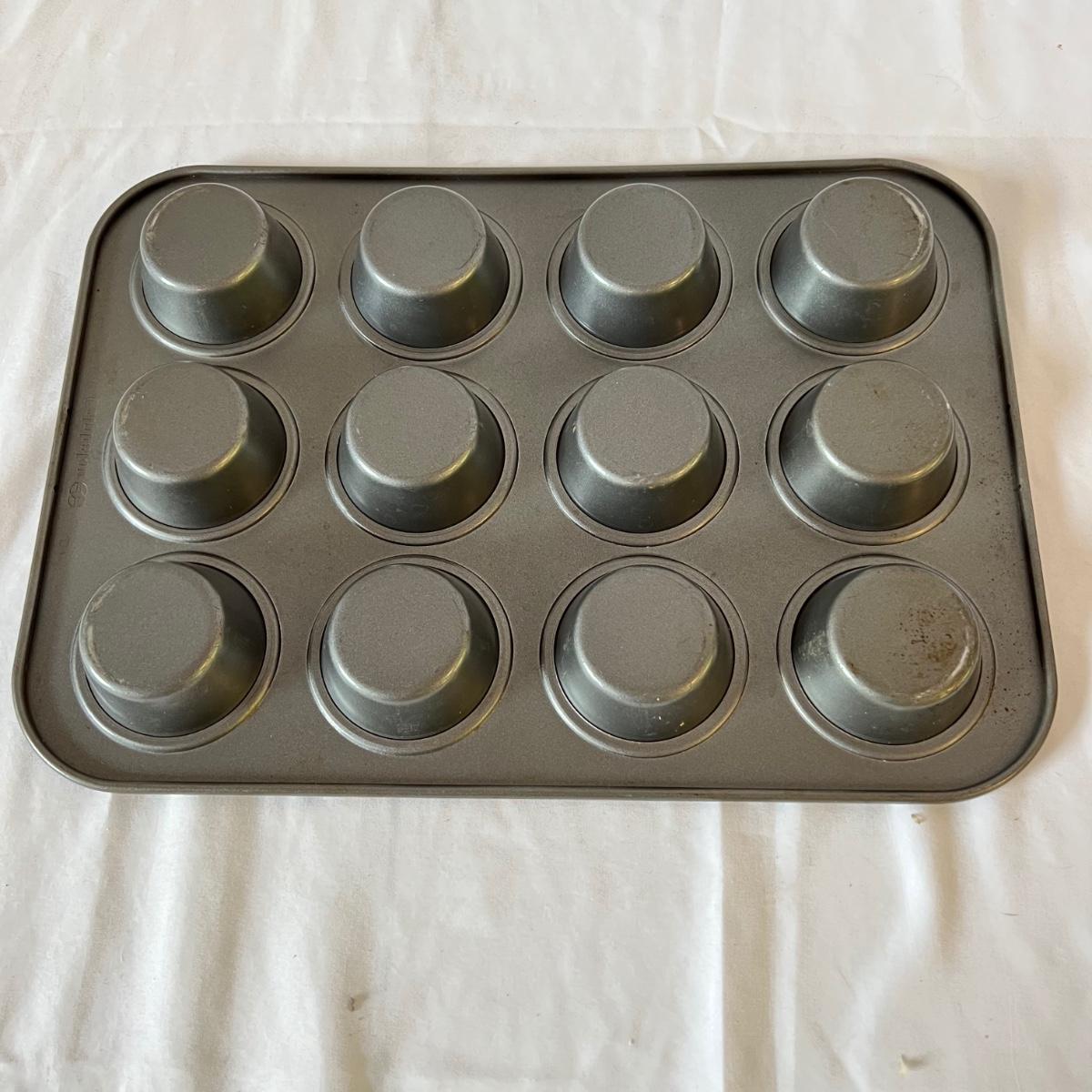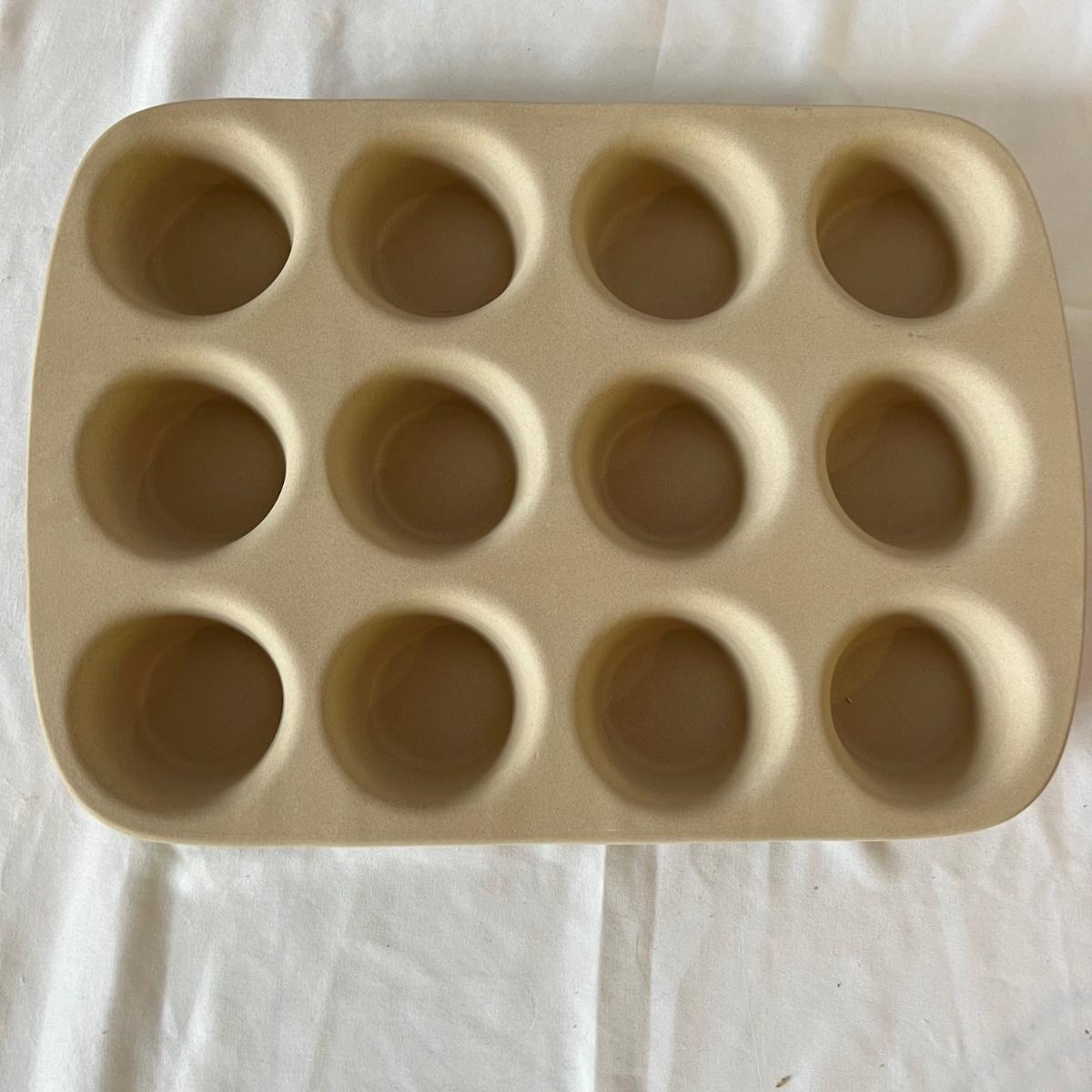Three muffin tins, one Pampered Chef stoneware muffin pan, four drying racks, one mini loaf pan and one tart pan.
