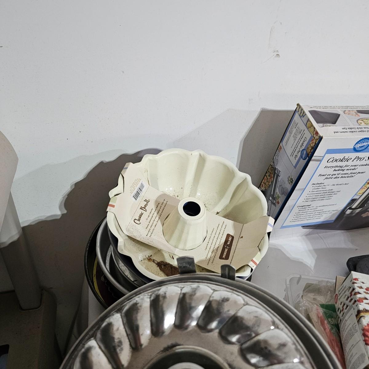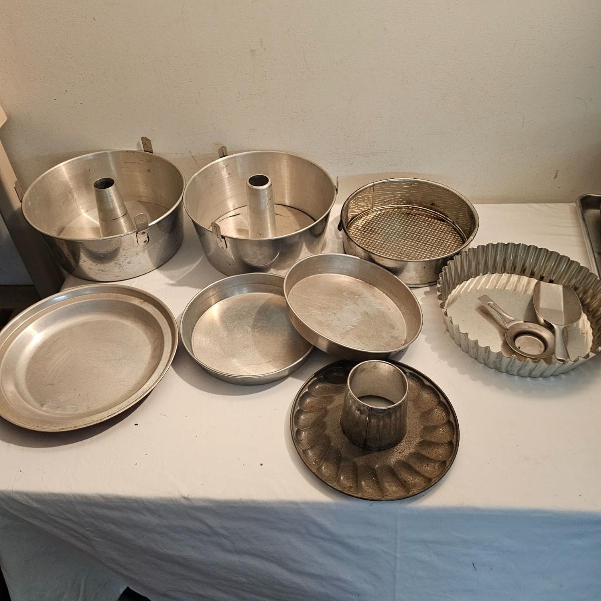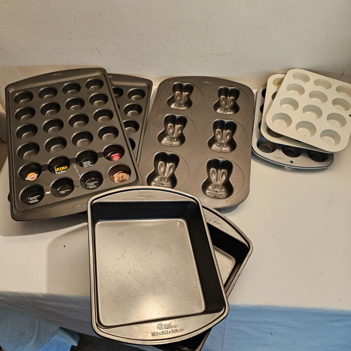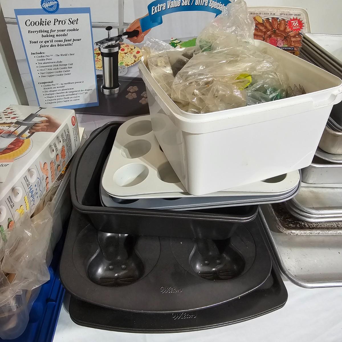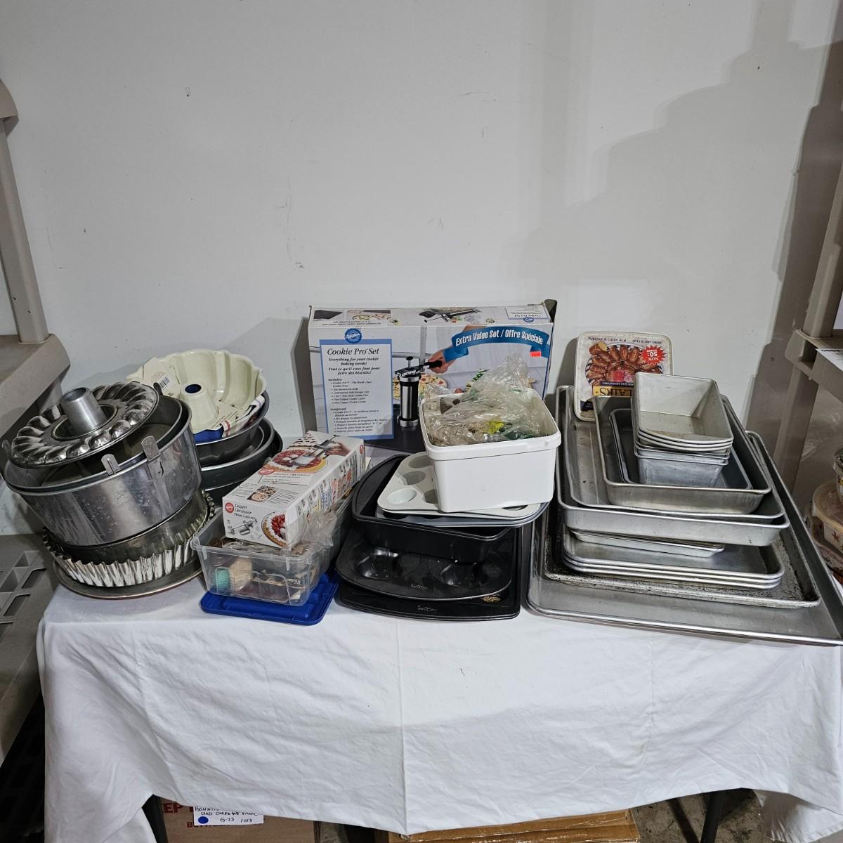 More than 40 pieces of bakeware from Wilton, Mirro, Kaiser and more. Flat trays, bundt pans, spring pans, cookie cutters and shooters, loaf pans, others. Largest flat tray is 26" x 18", large stainless bowl is 16"D, loaf pans are 9.25" x 5.25". Some newer items, some have seen use. See photos for details. Local pickup only.