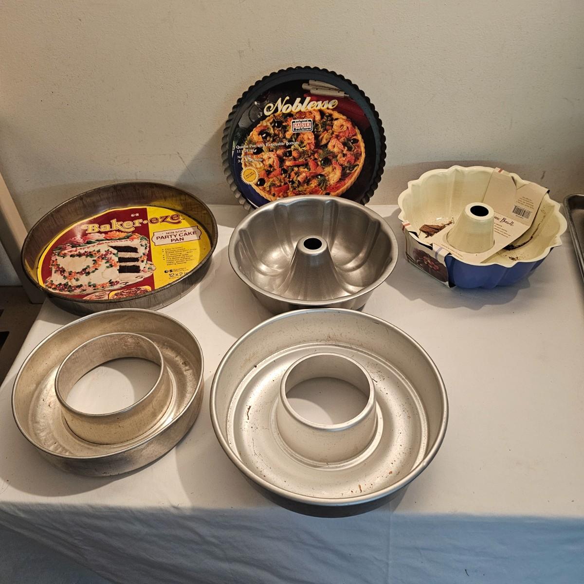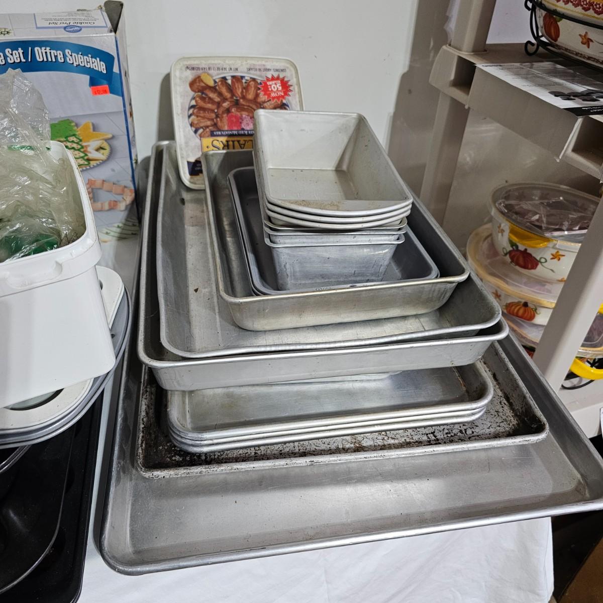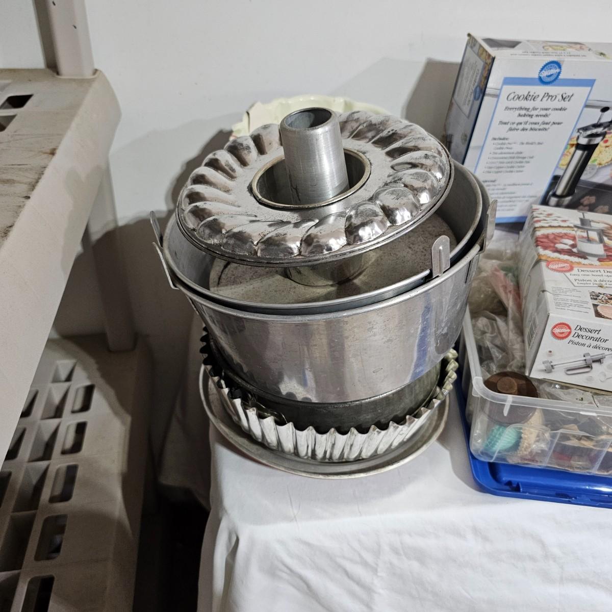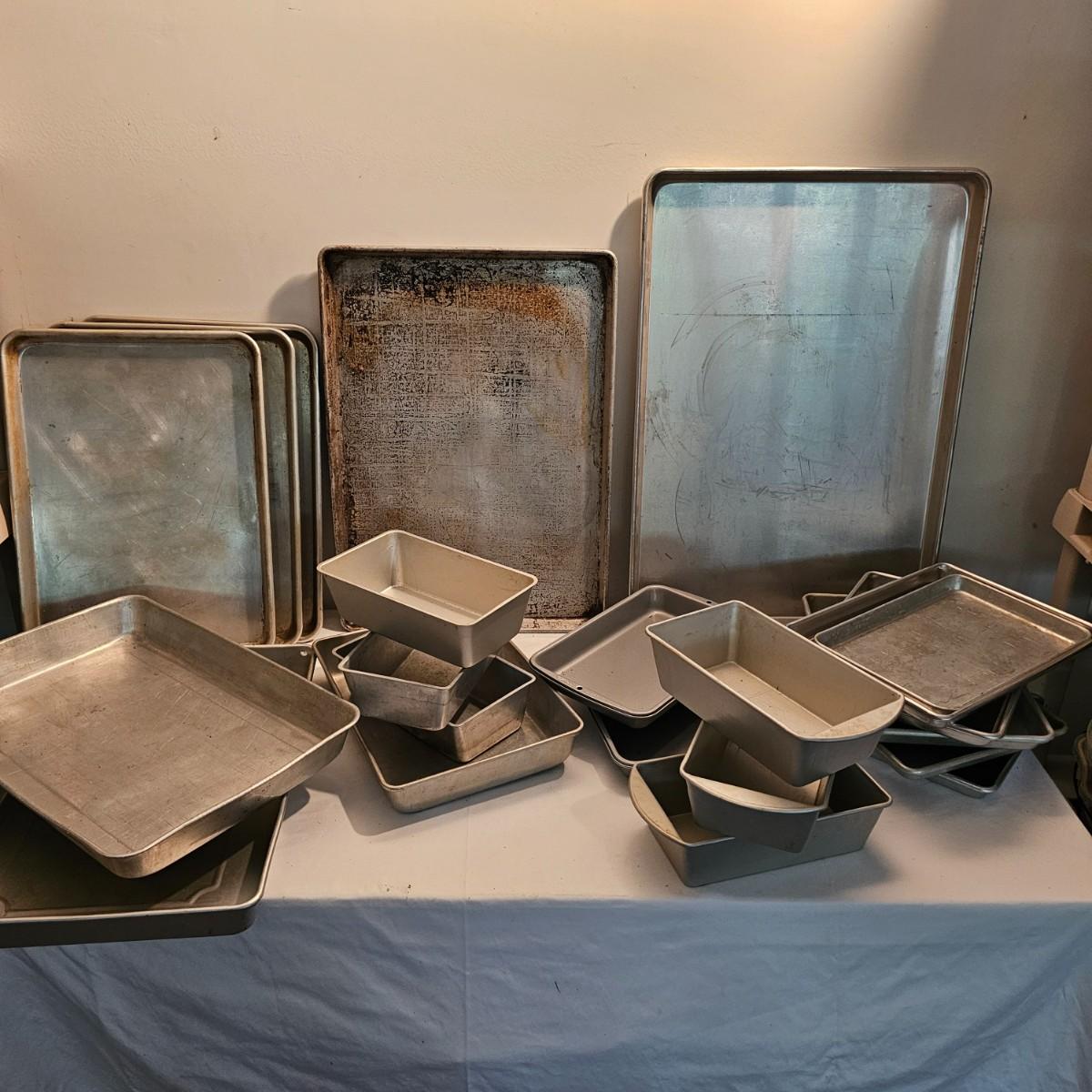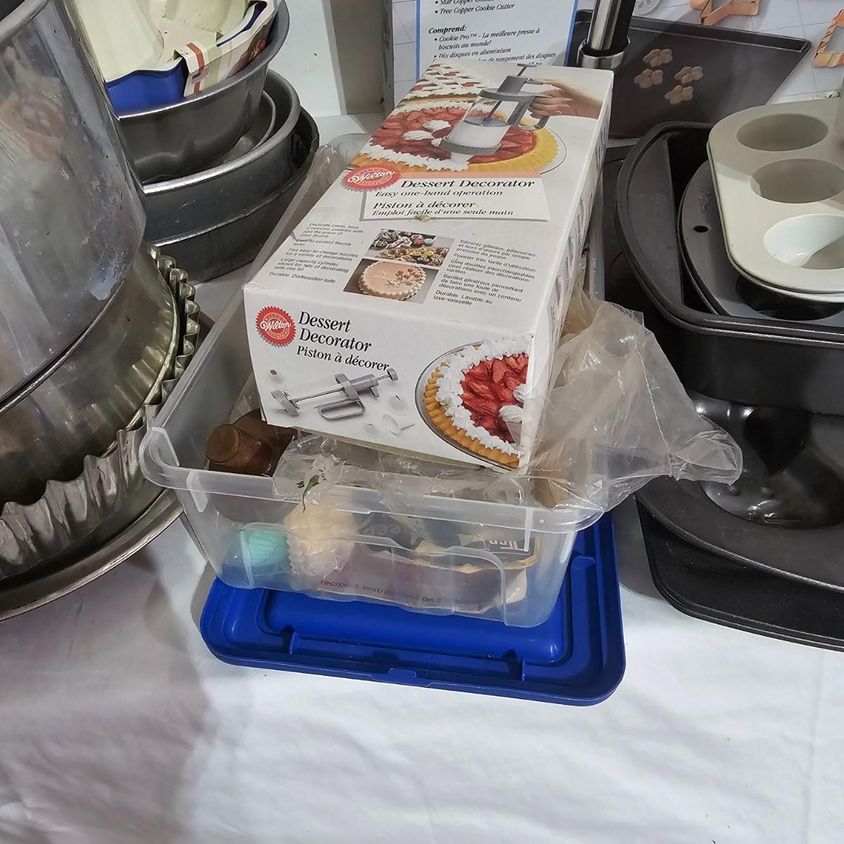 More than 40 pieces of bakeware from Wilton, Mirro, Kaiser and more. Flat trays, bundt pans, spring pans, cookie cutters and shooters, loaf pans, others. Largest flat tray is 26" x 18", large stainless bowl is 16"D, loaf pans are 9.25" x 5.25". Some newer items, some have seen use. See photos for details. Local pickup only.