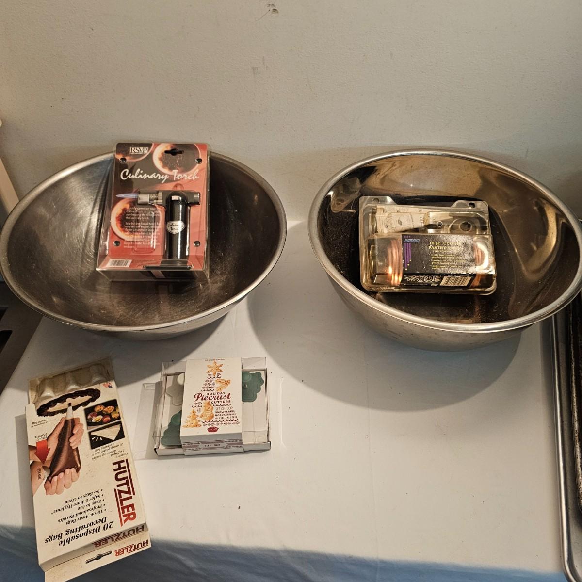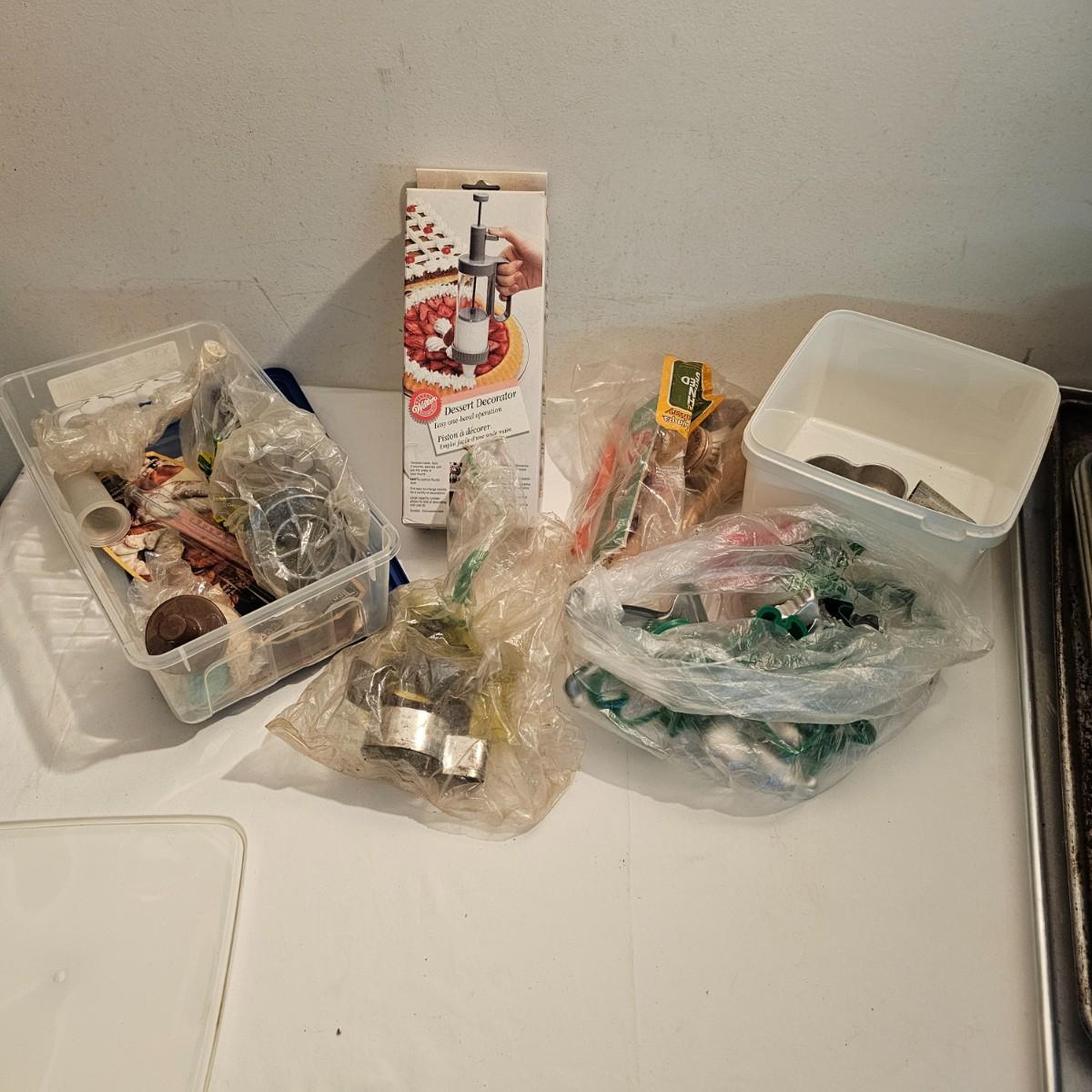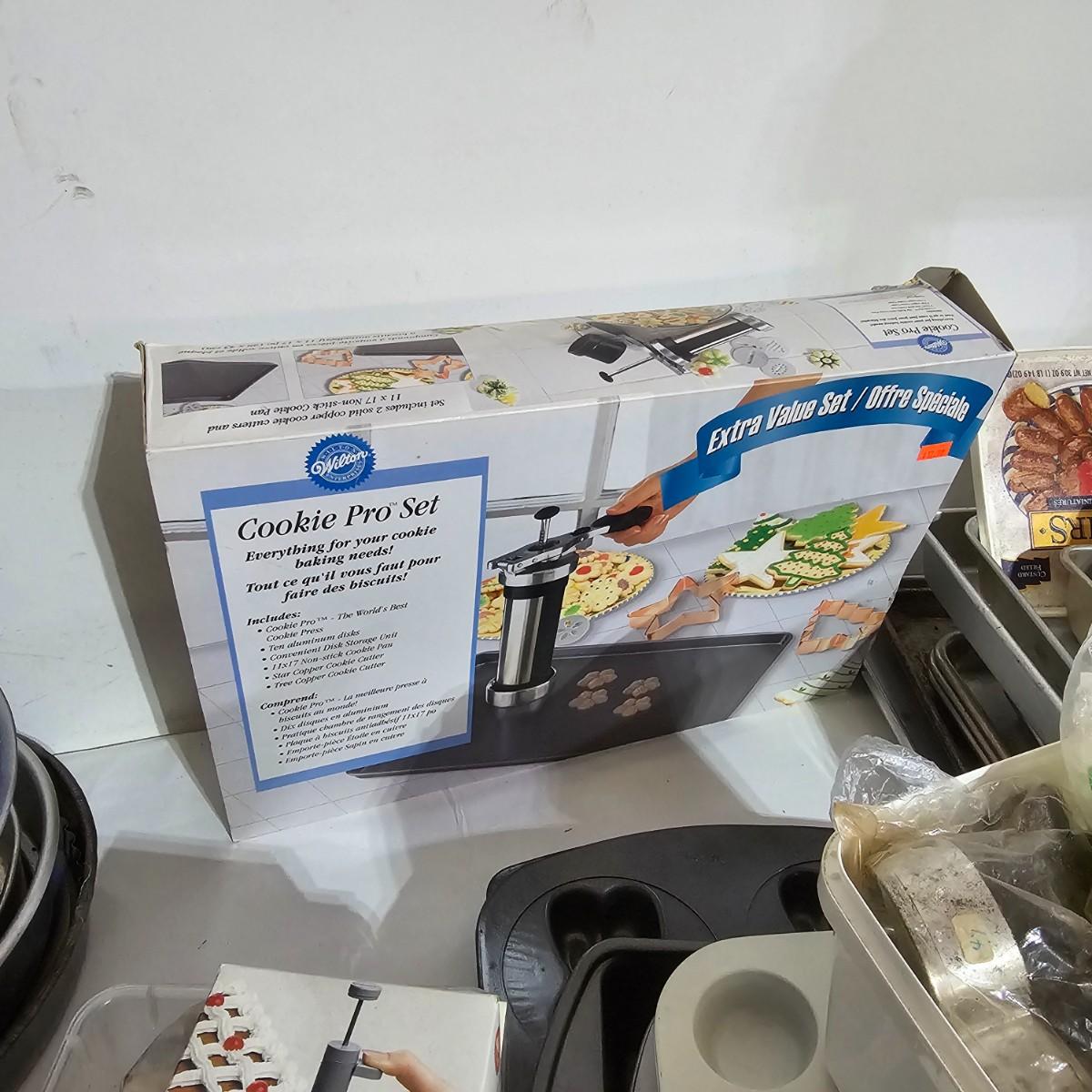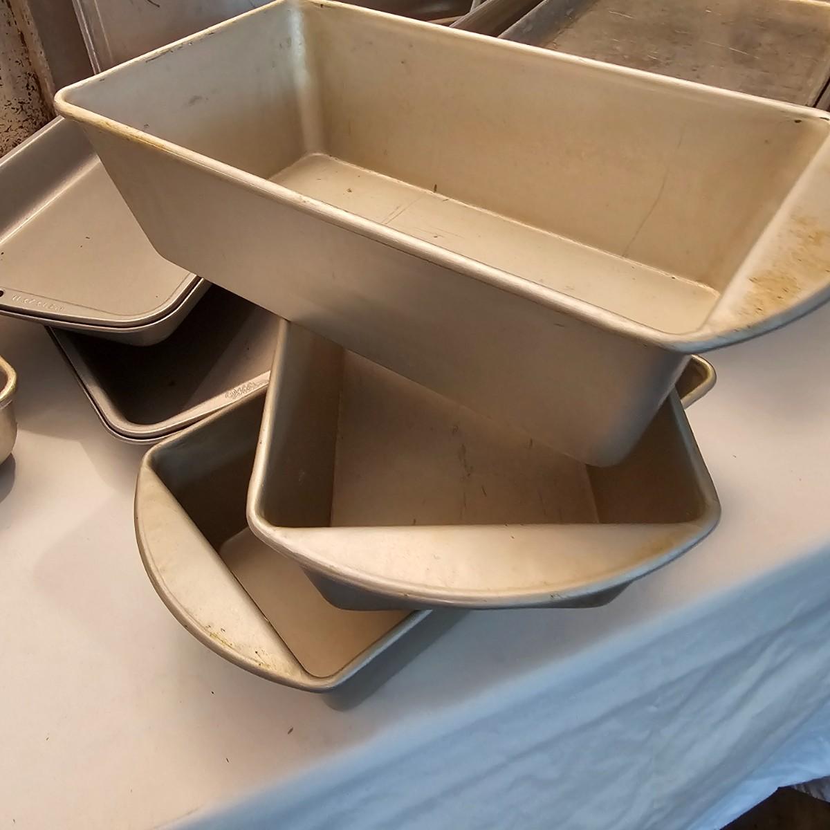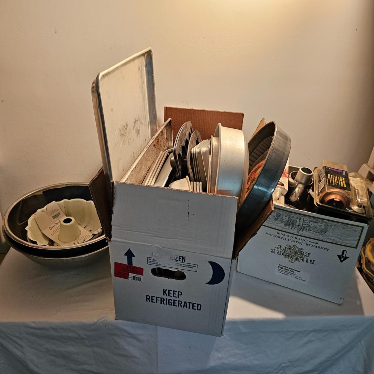 More than 40 pieces of bakeware from Wilton, Mirro, Kaiser and more. Flat trays, bundt pans, spring pans, cookie cutters and shooters, loaf pans, others. Largest flat tray is 26" x 18", large stainless bowl is 16"D, loaf pans are 9.25" x 5.25". Some newer items, some have seen use. See photos for details. Local pickup only.