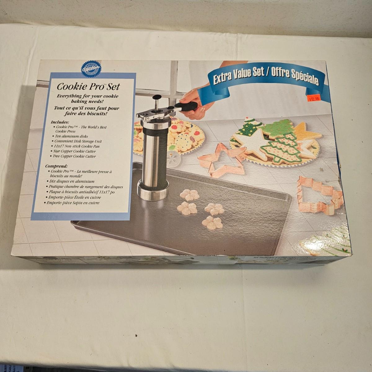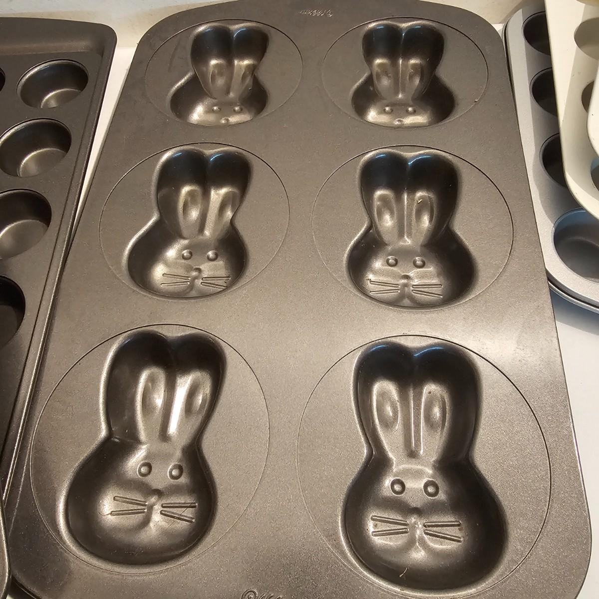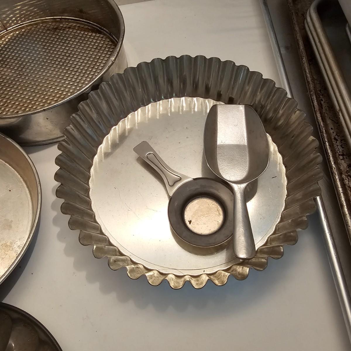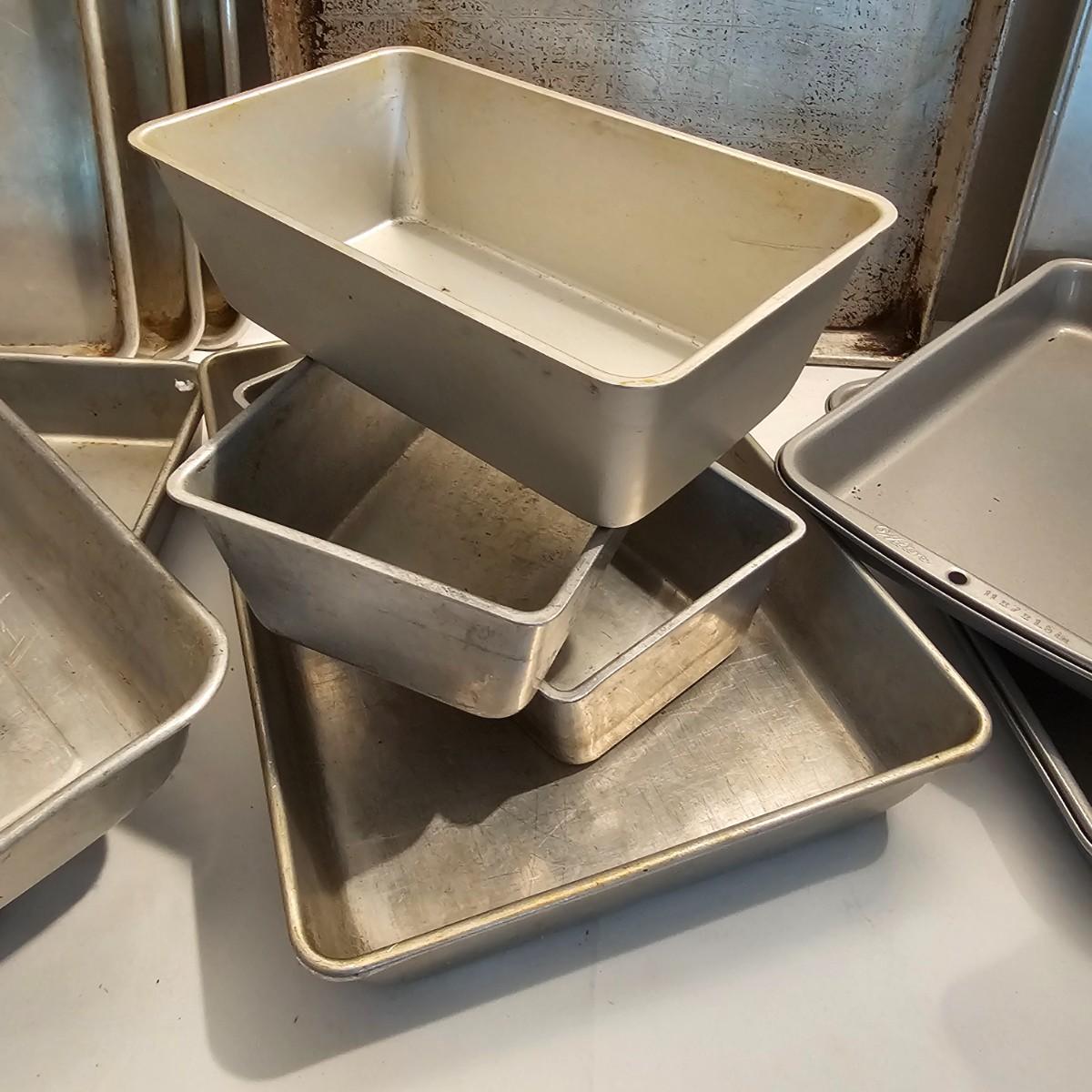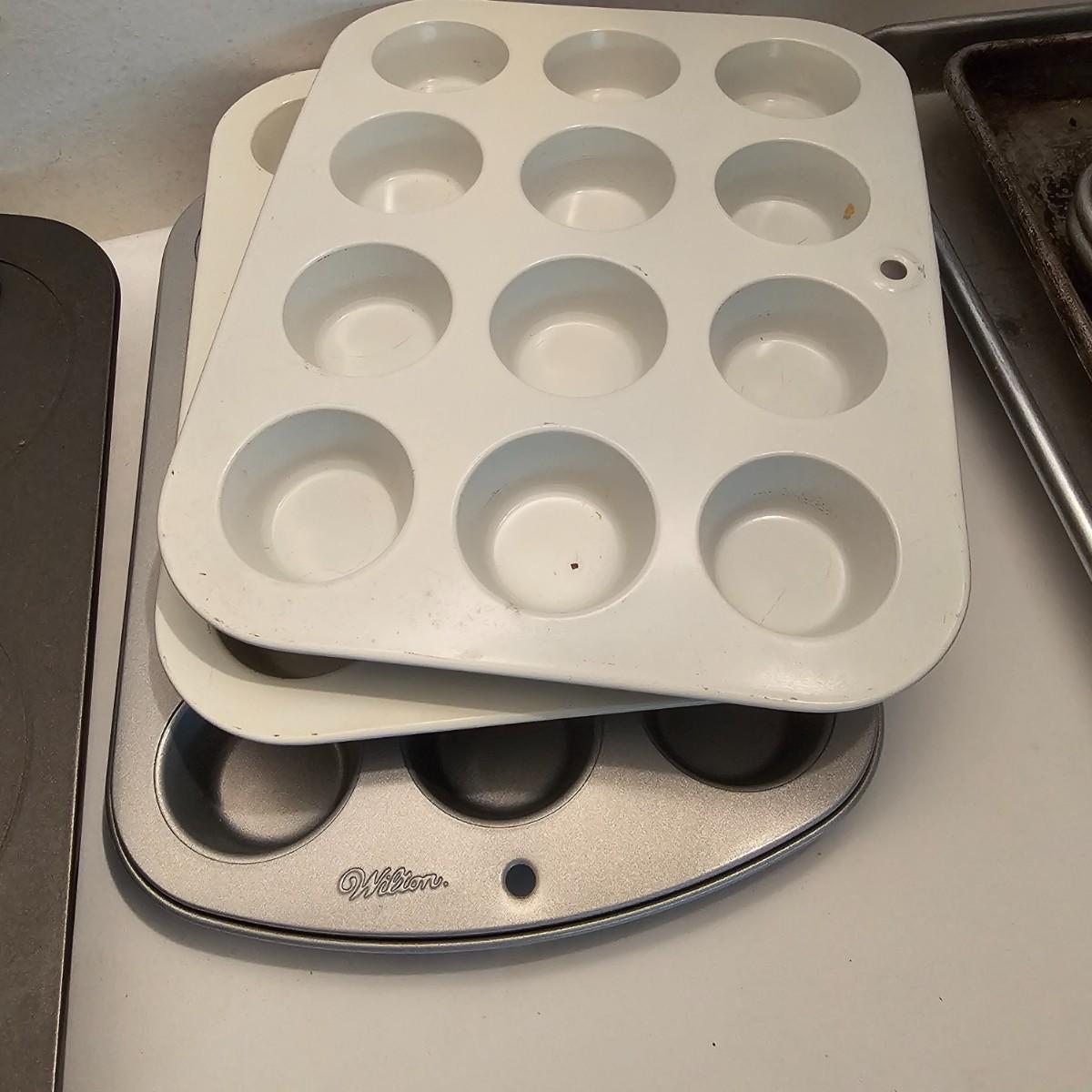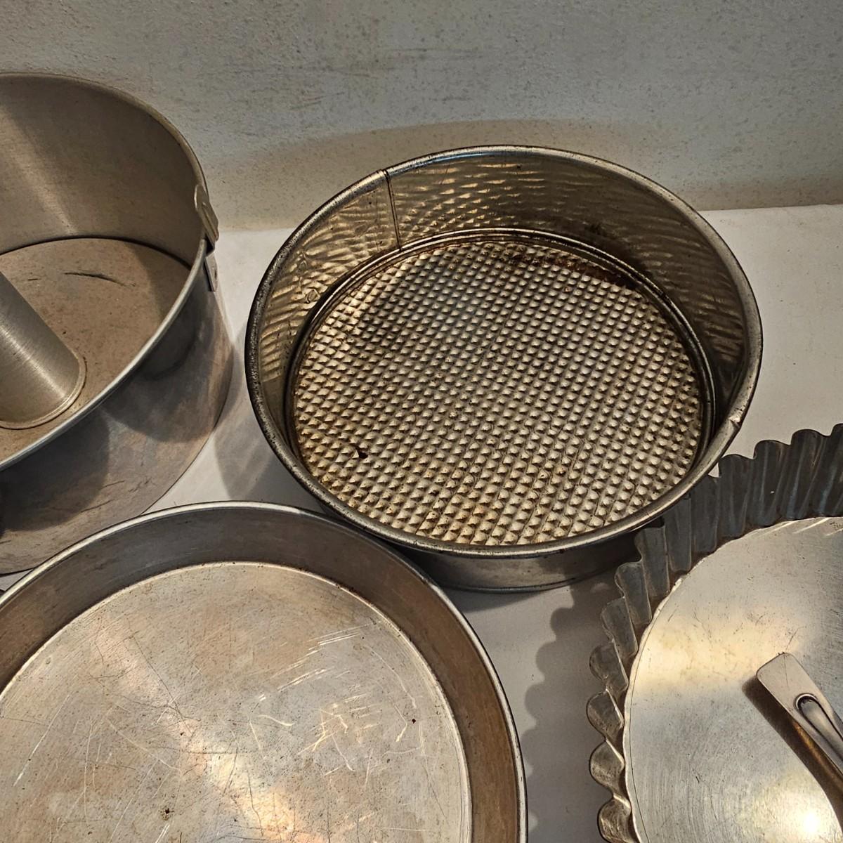 More than 40 pieces of bakeware from Wilton, Mirro, Kaiser and more. Flat trays, bundt pans, spring pans, cookie cutters and shooters, loaf pans, others. Largest flat tray is 26" x 18", large stainless bowl is 16"D, loaf pans are 9.25" x 5.25". Some newer items, some have seen use. See photos for details. Local pickup only.