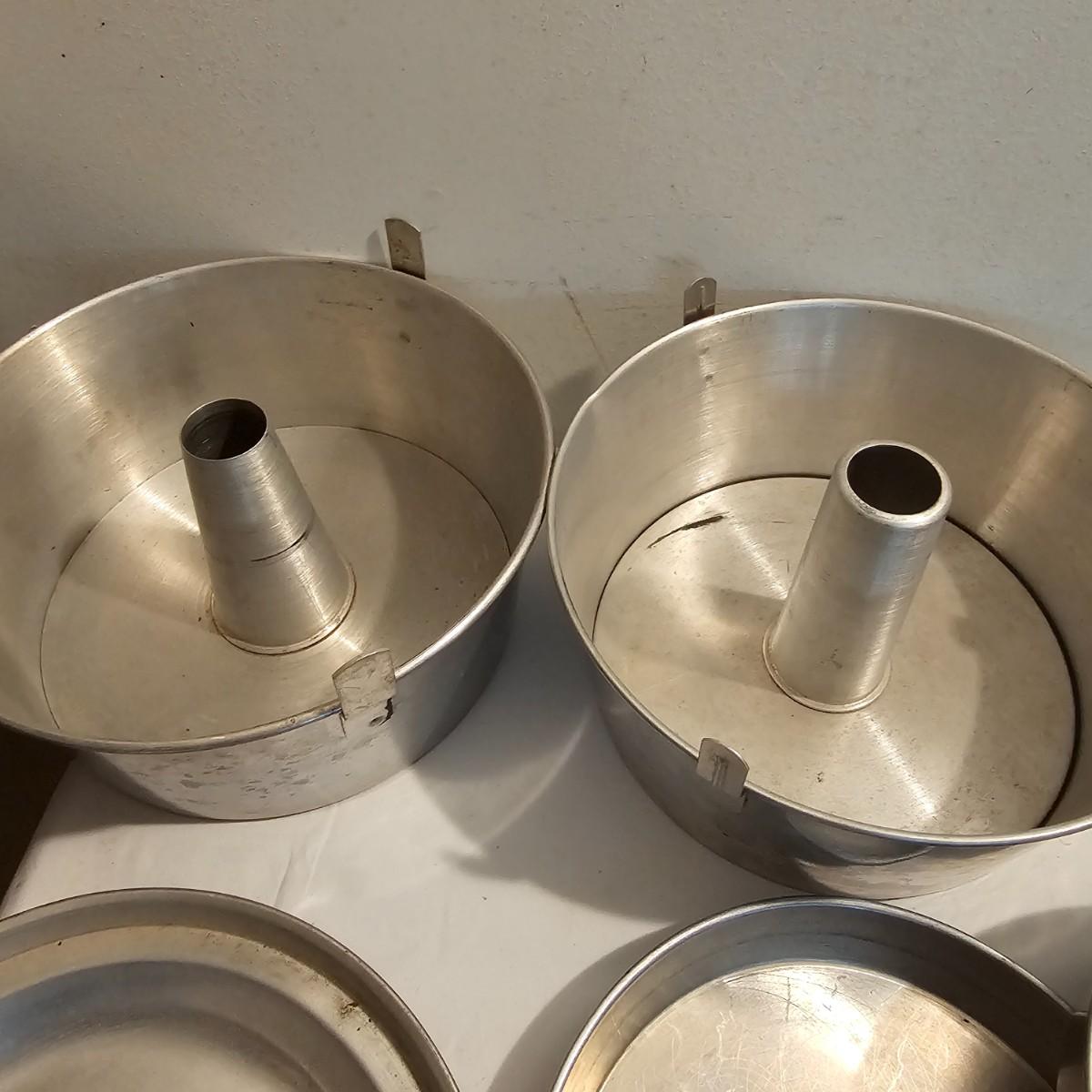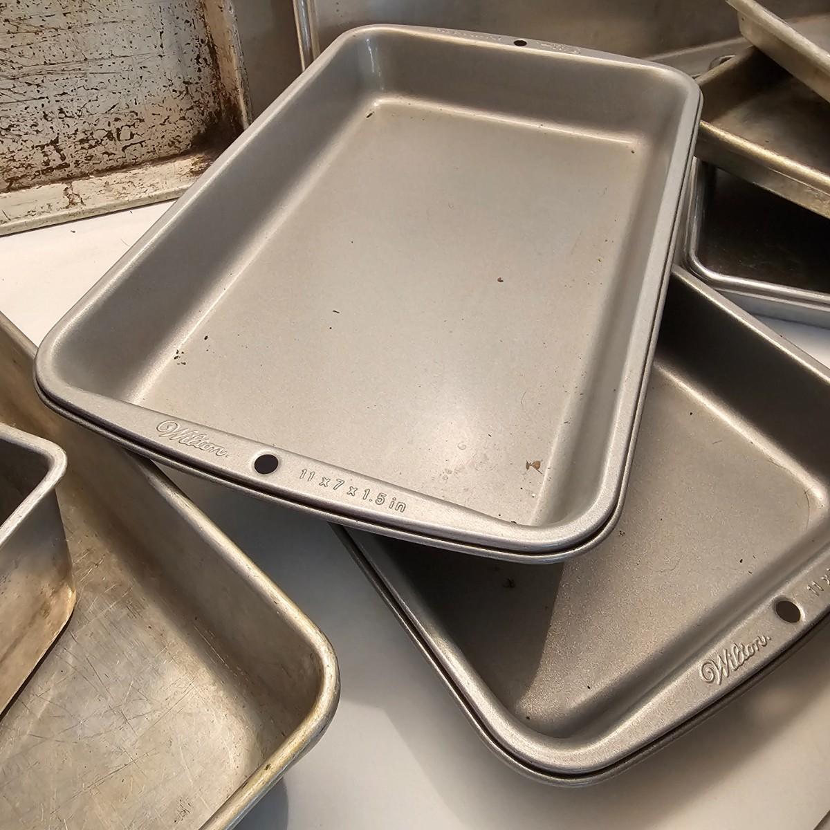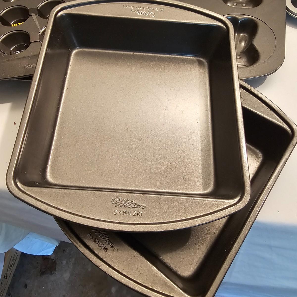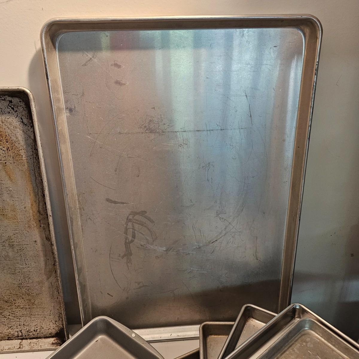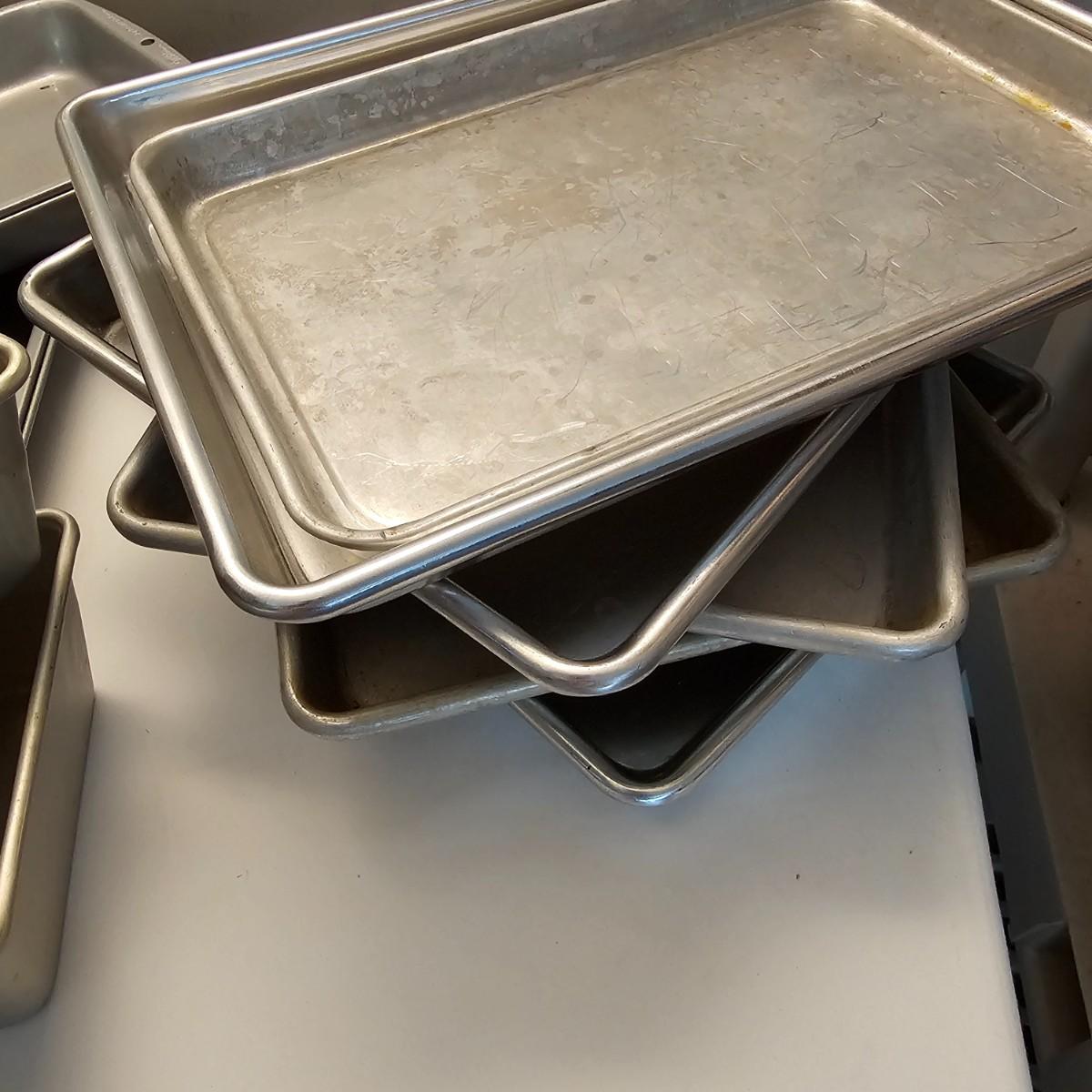 More than 40 pieces of bakeware from Wilton, Mirro, Kaiser and more. Flat trays, bundt pans, spring pans, cookie cutters and shooters, loaf pans, others. Largest flat tray is 26" x 18", large stainless bowl is 16"D, loaf pans are 9.25" x 5.25". Some newer items, some have seen use. See photos for details. Local pickup only.