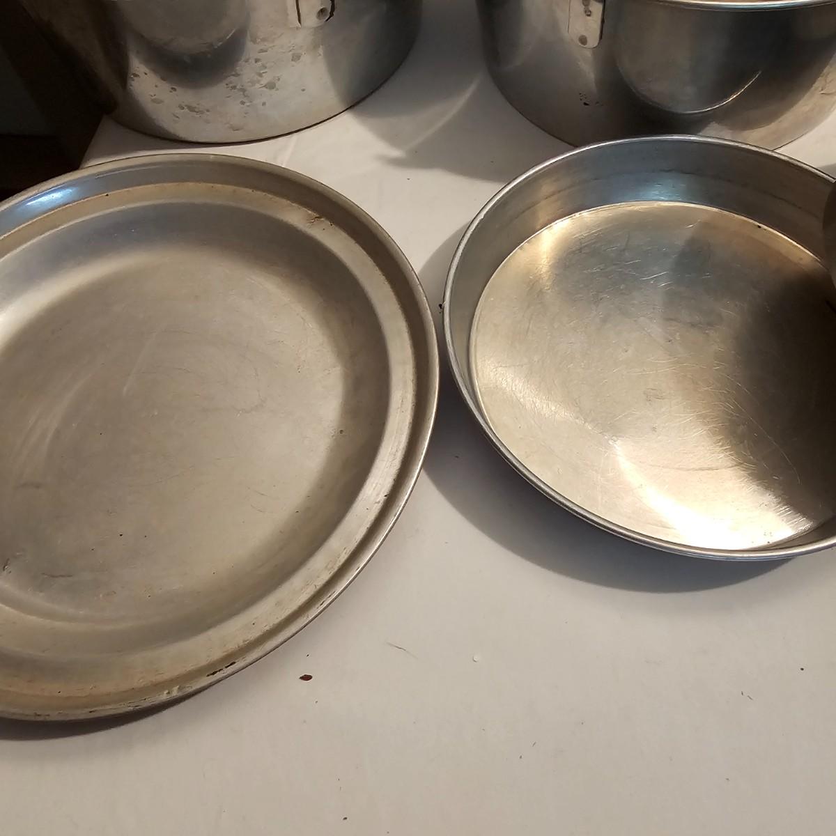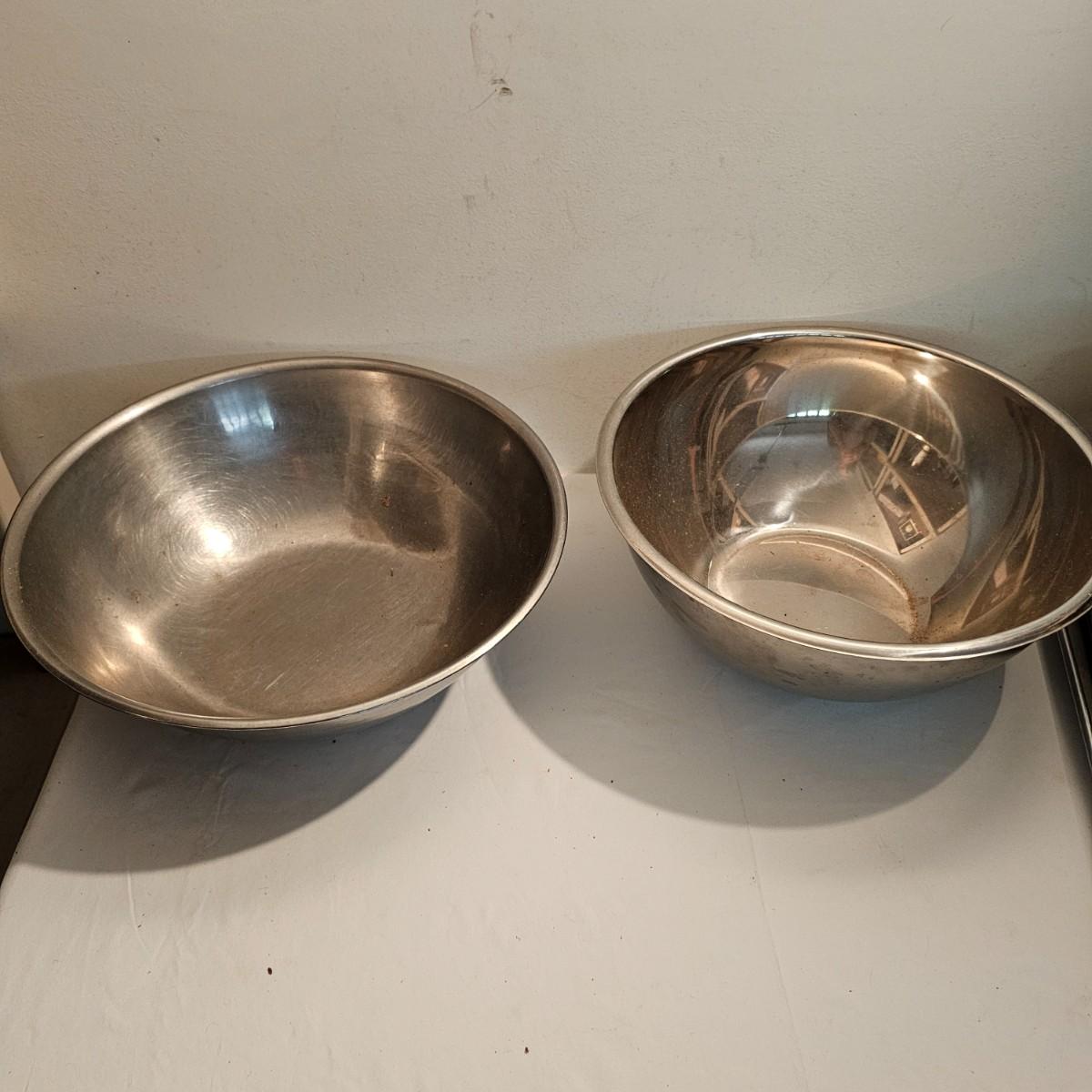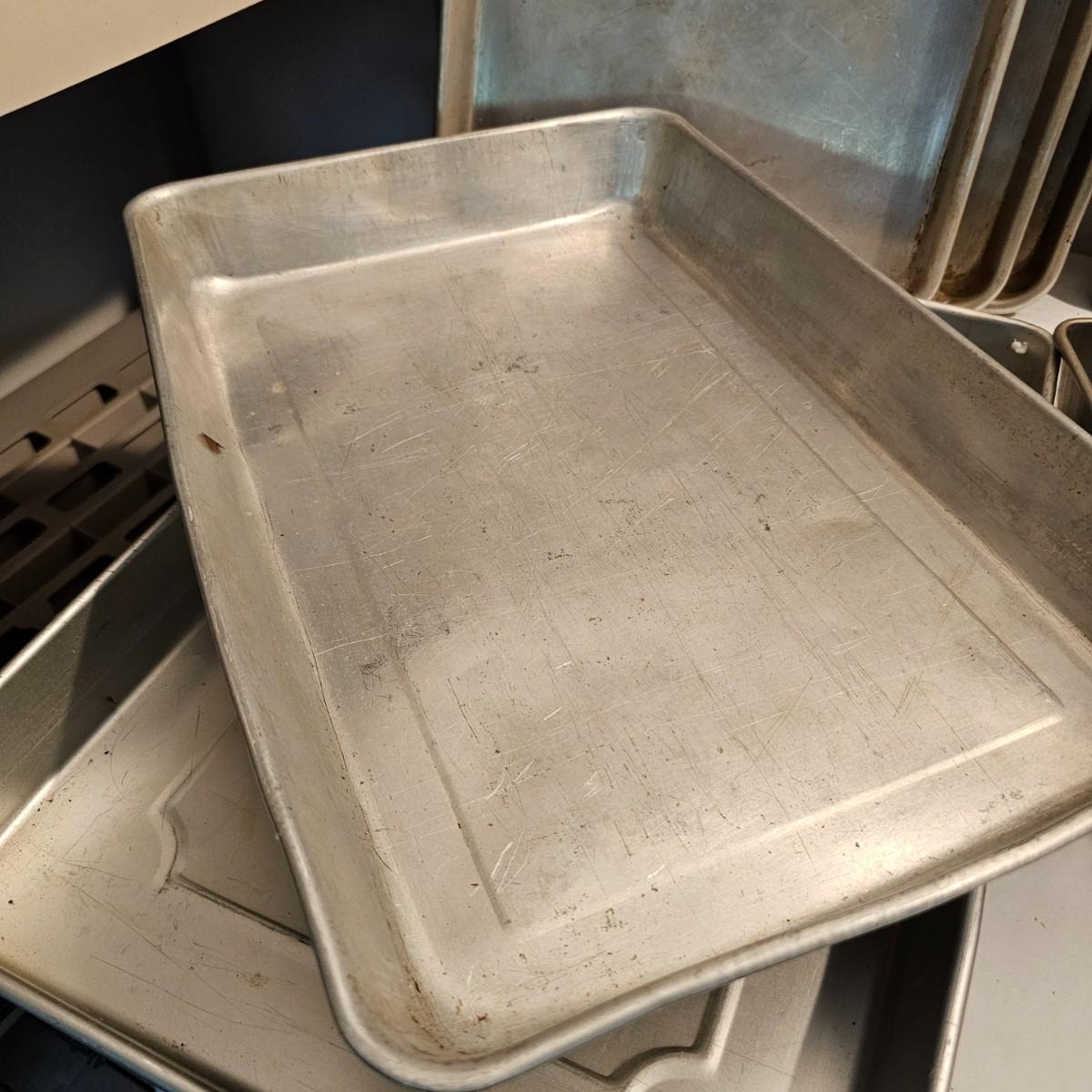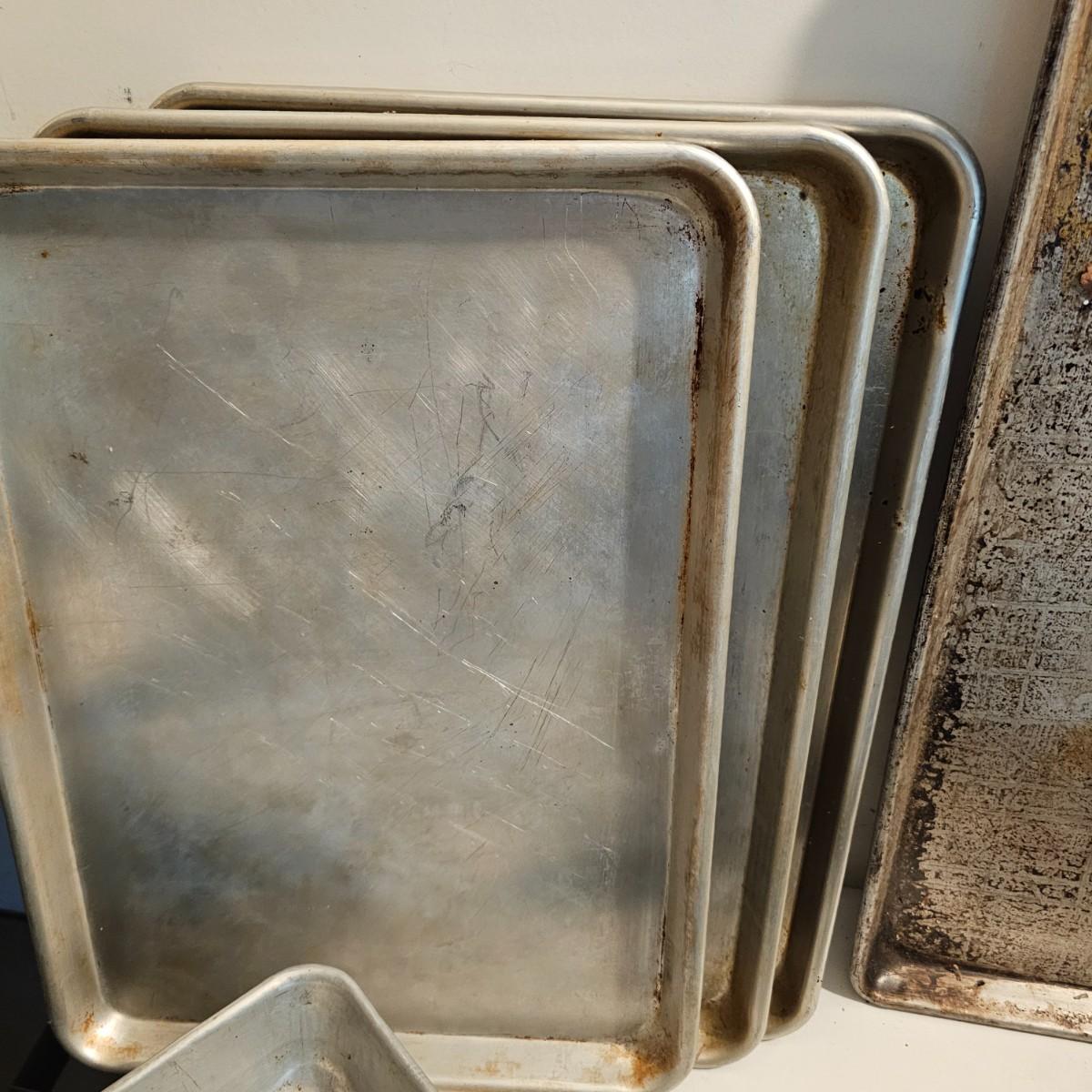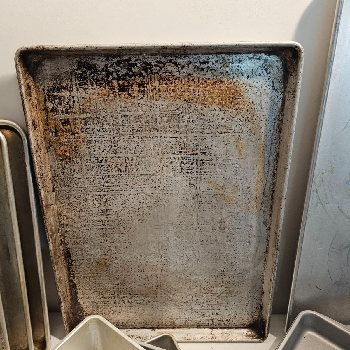 More than 40 pieces of bakeware from Wilton, Mirro, Kaiser and more. Flat trays, bundt pans, spring pans, cookie cutters and shooters, loaf pans, others. Largest flat tray is 26" x 18", large stainless bowl is 16"D, loaf pans are 9.25" x 5.25". Some newer items, some have seen use. See photos for details. Local pickup only.