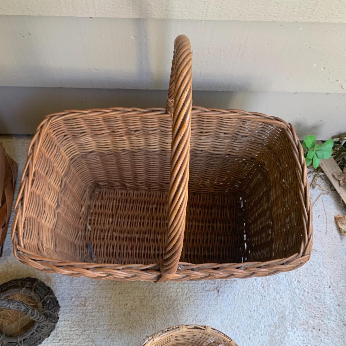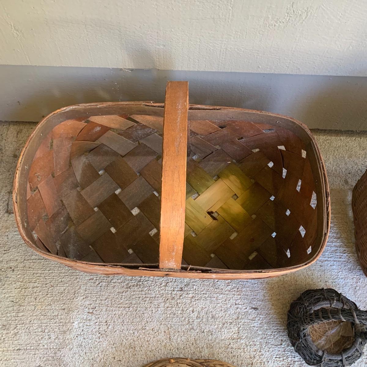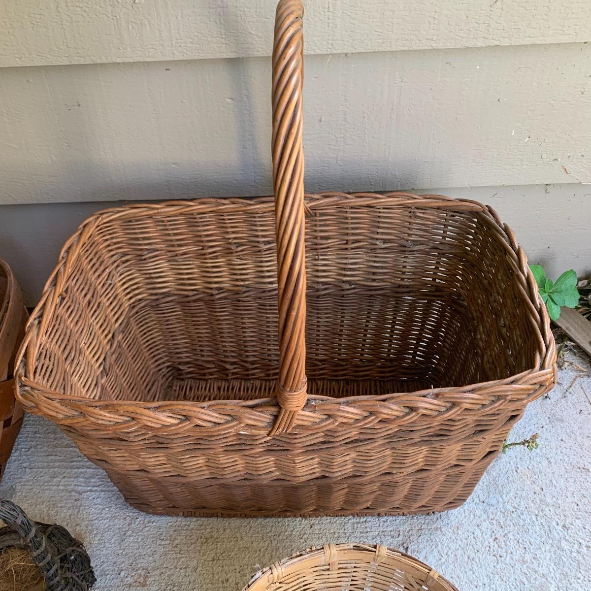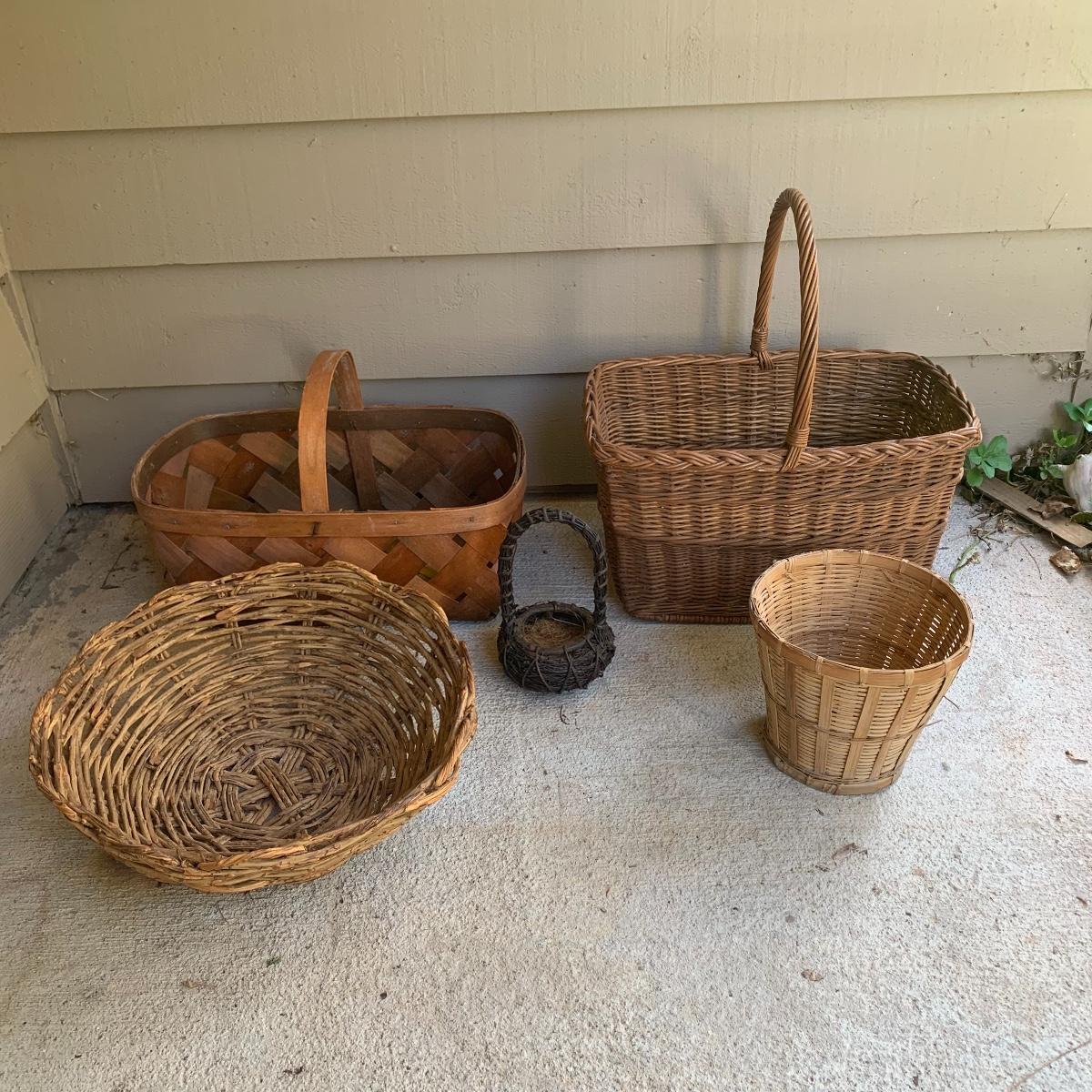 This lot includes Five baskets that are different shapes, sizes, and styles. The largest measures 16” X 11” and stands 20” tall to the top of the handle. All are in good condition. Local pickup only