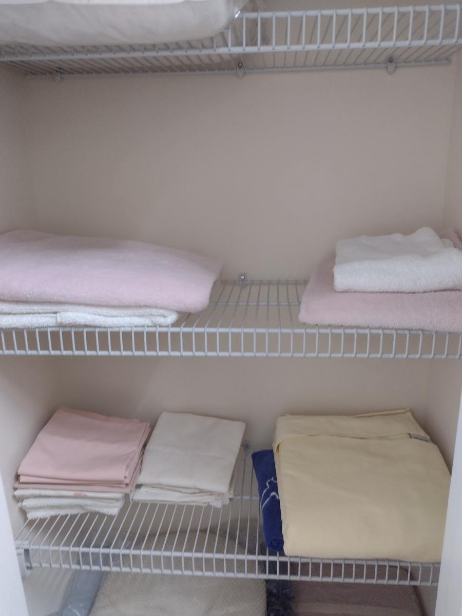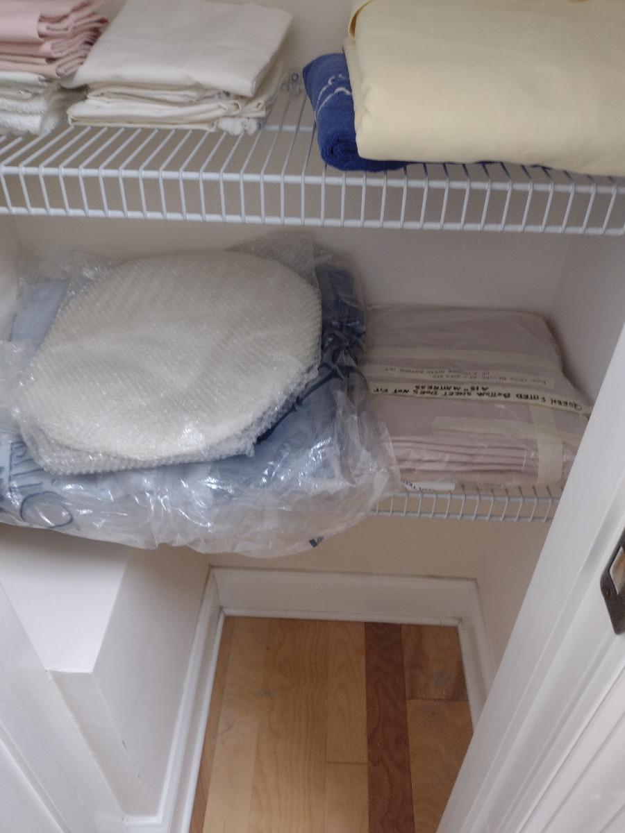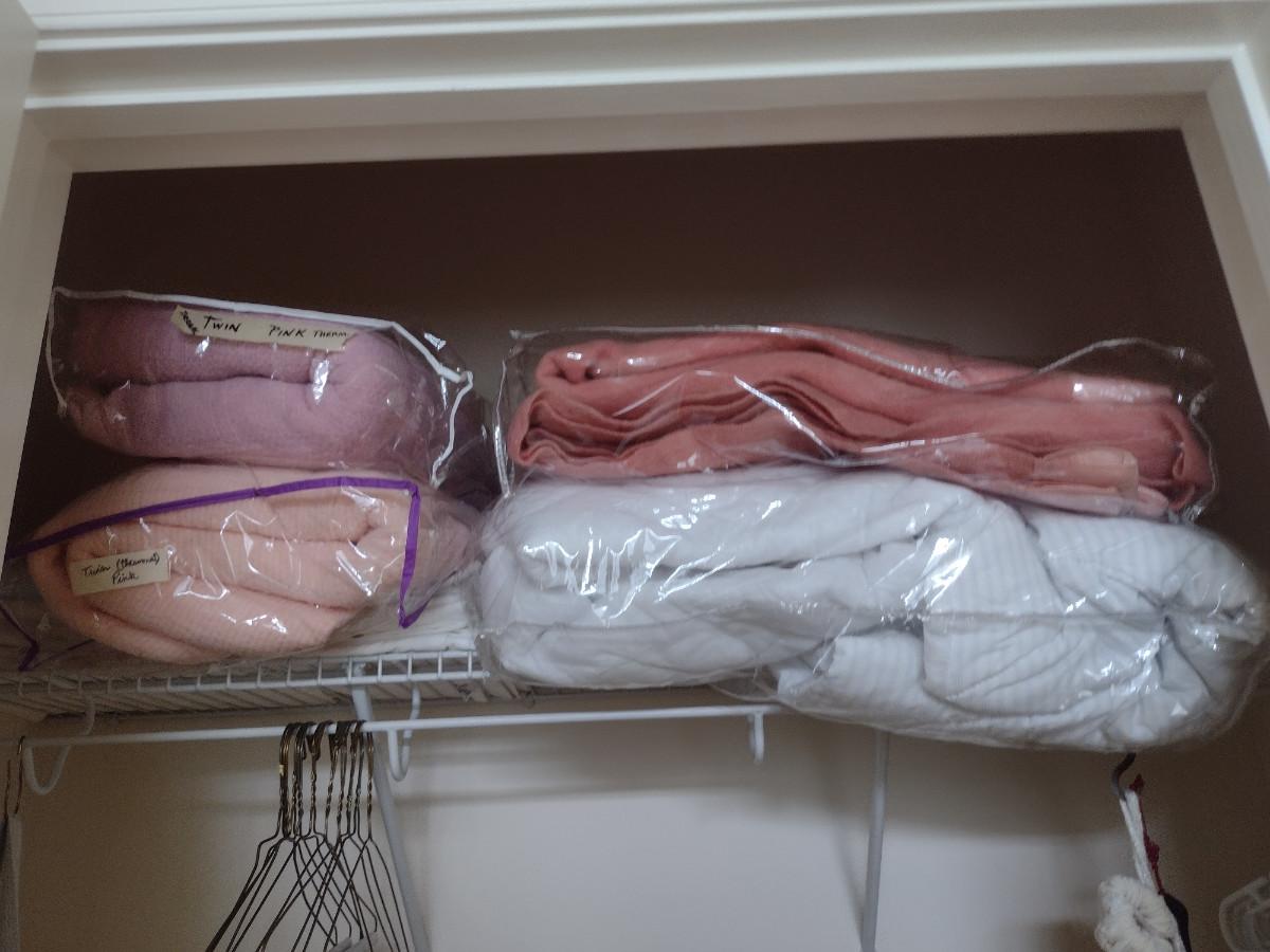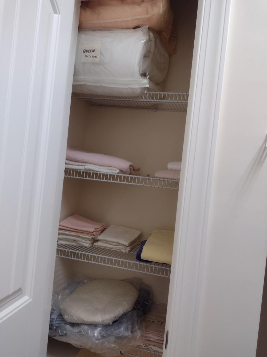 Assorted Bedding, Linens, and Contents of Closet. Please see all pictures for selection.