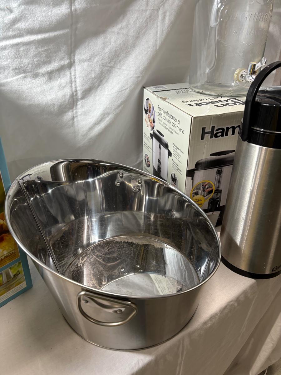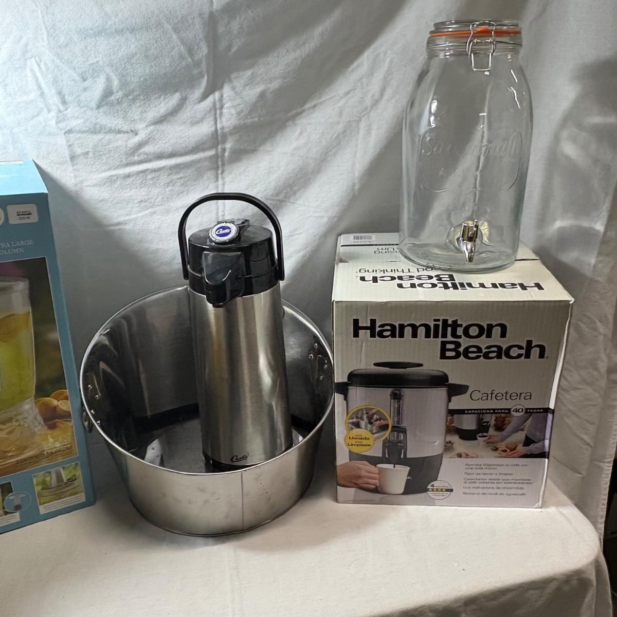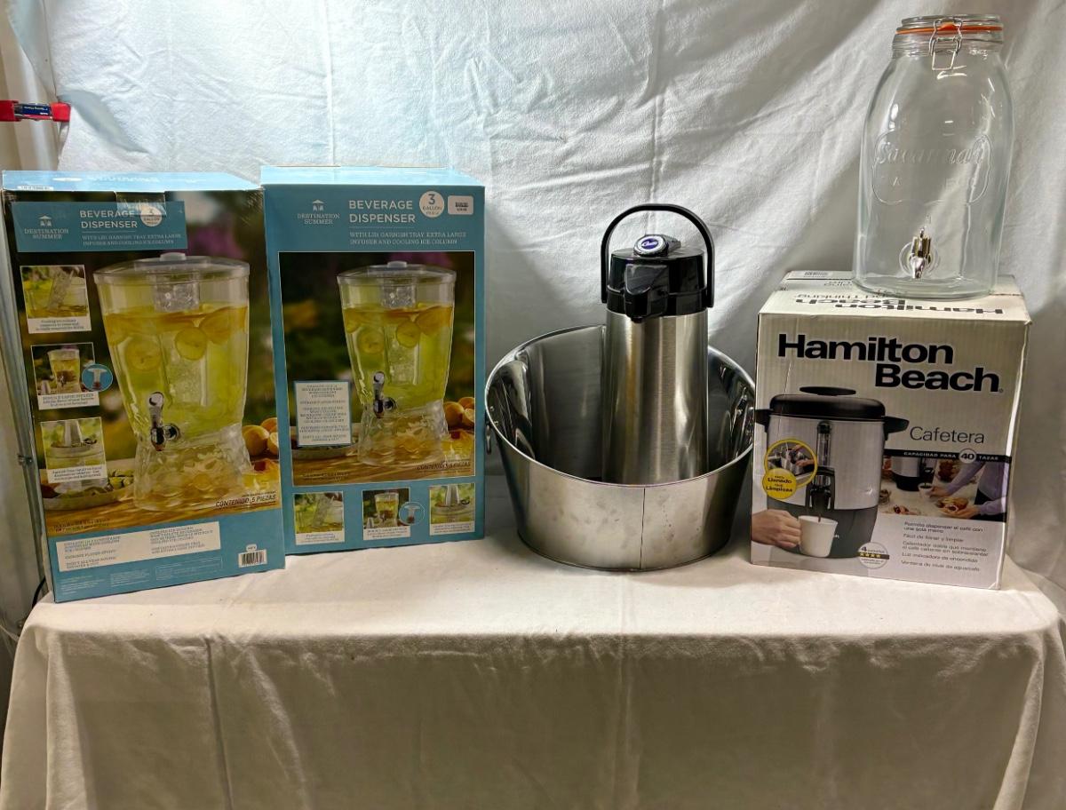 Two new in box 3-gallon cold beverage dispensers, glass Mason jar-style dispenser with spigot, coffee pump pot, metal ice bucket (15” x 15.5” x 10”H), Hamilton Beach 40 cup brewer.