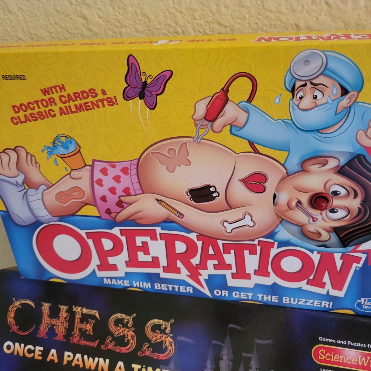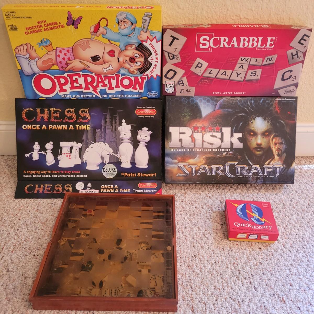 An assortment of six board games. Included titles are Risk: StarCraft Edition, Chess, Operation and more. See photos for inventory. We cannot guarantee that all game pieces are present. Shipping available