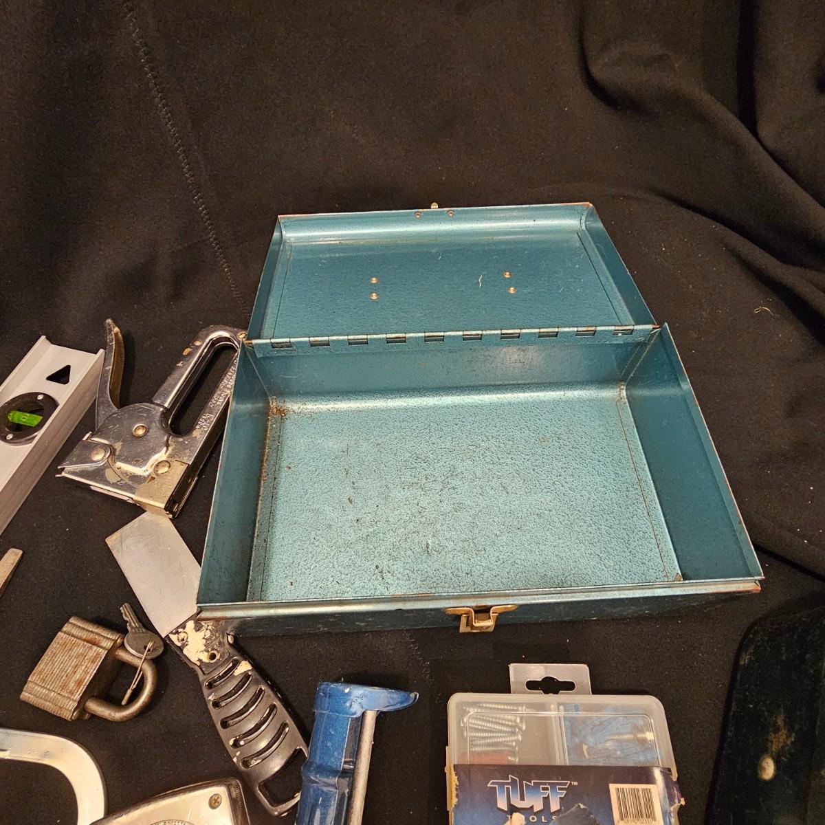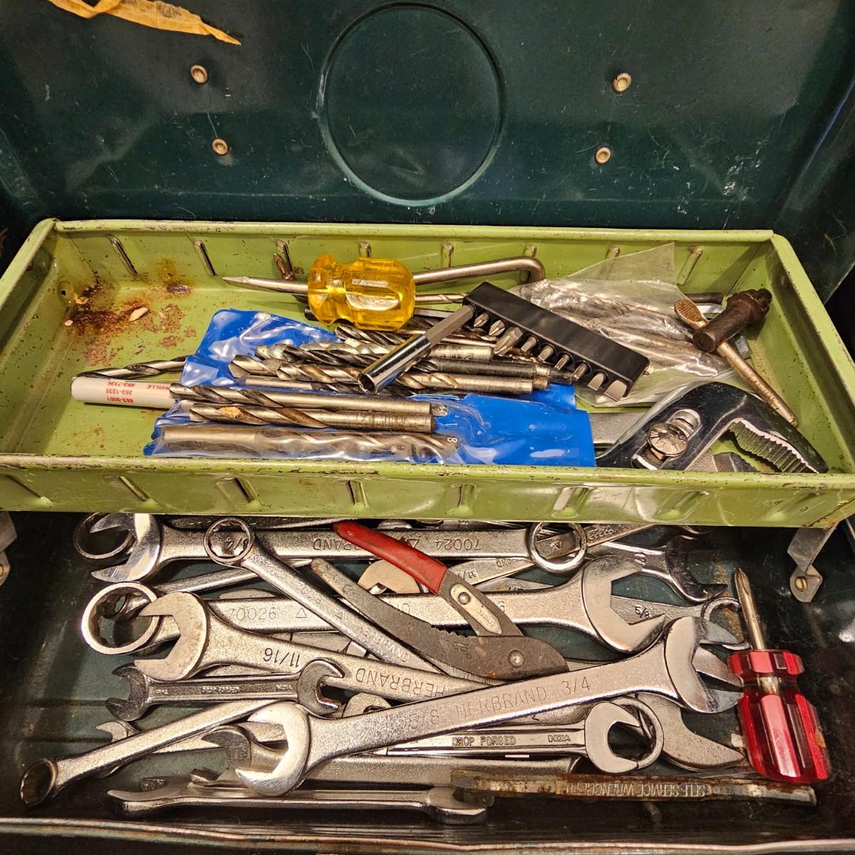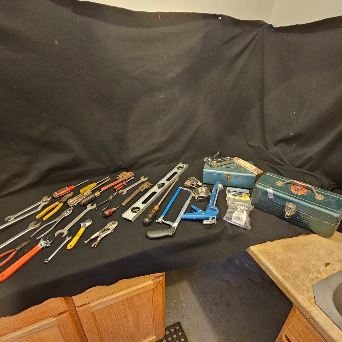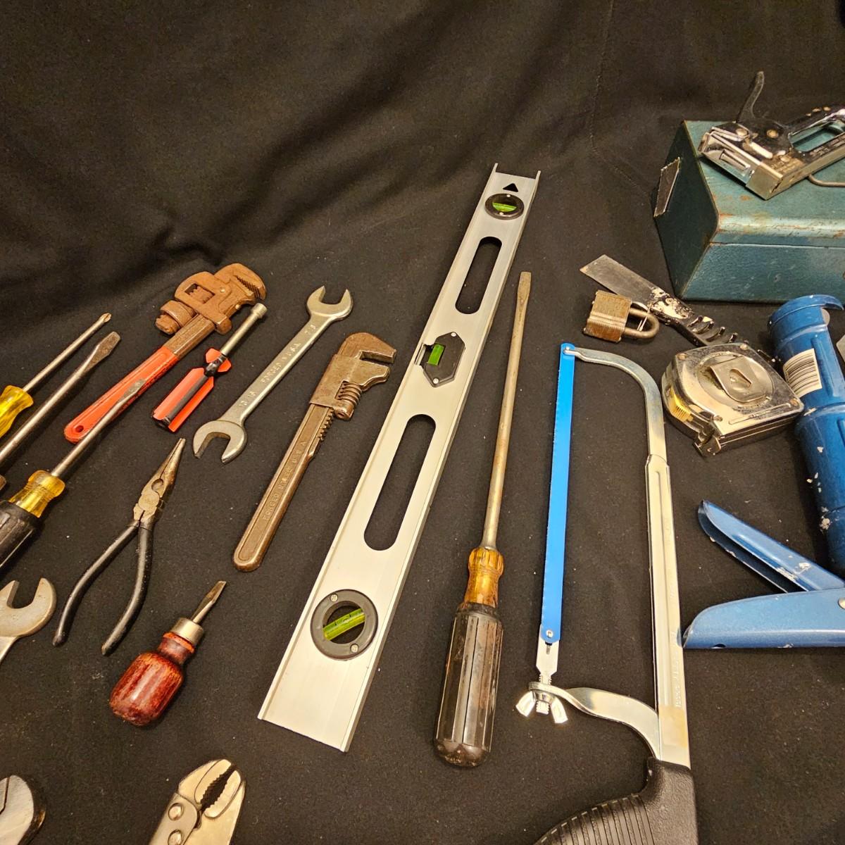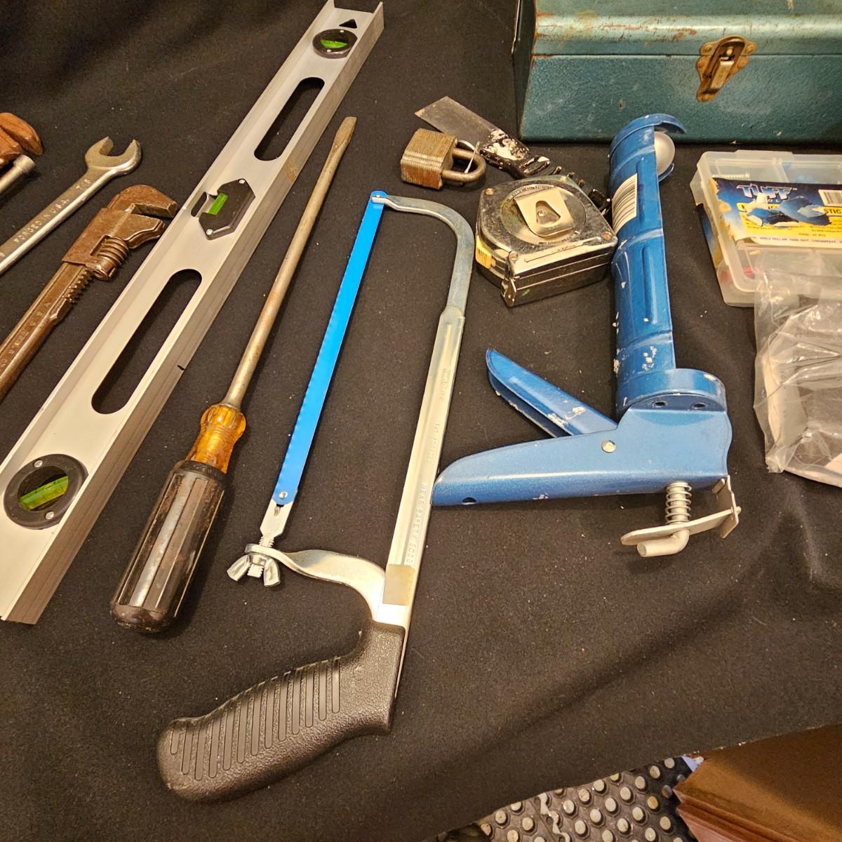 Metal toolbox, small assorted handtools, wrenches, screwdrivers and more. Drill bits, pliers, hacksaw, 24" level. All items used. See photos for details. Local pickup only.