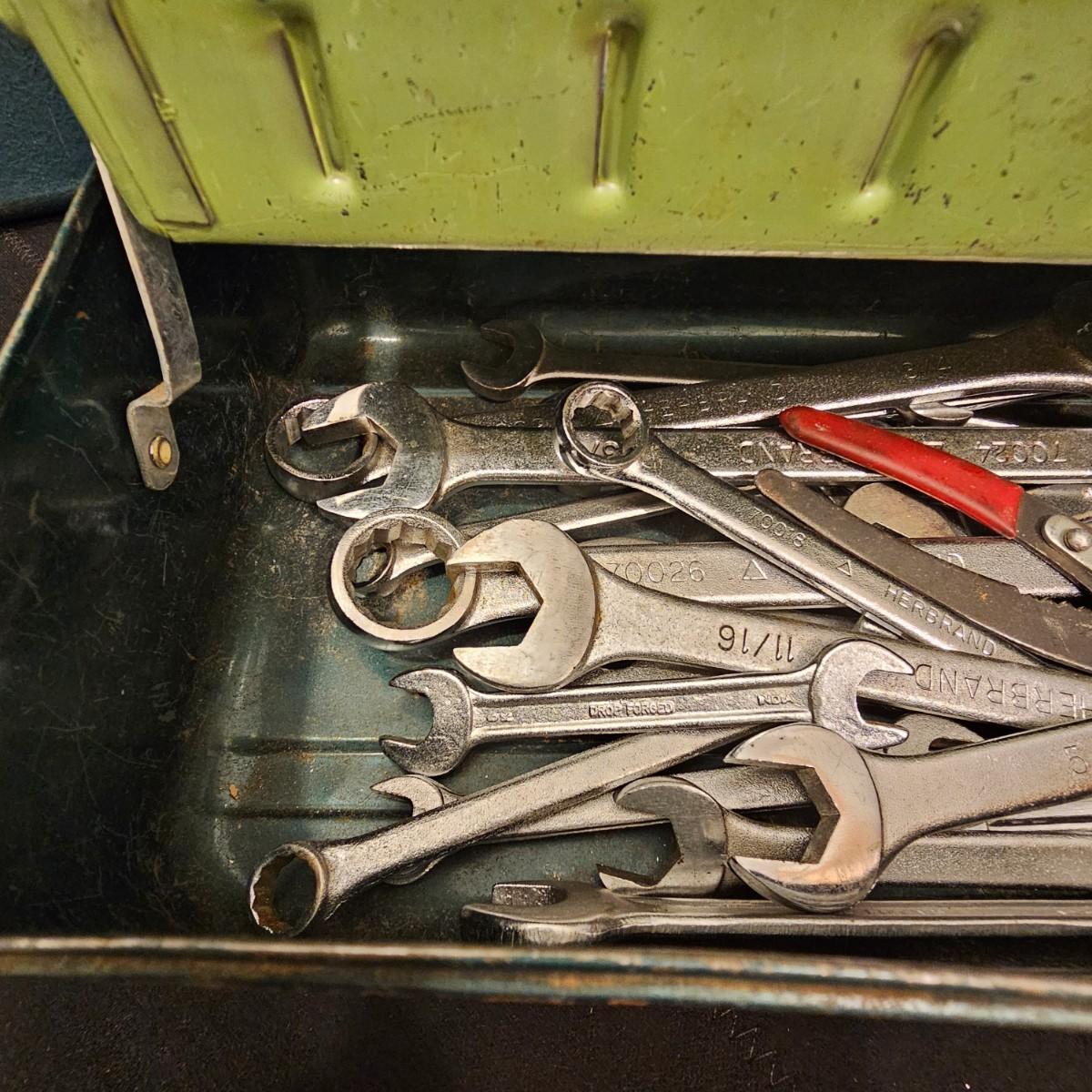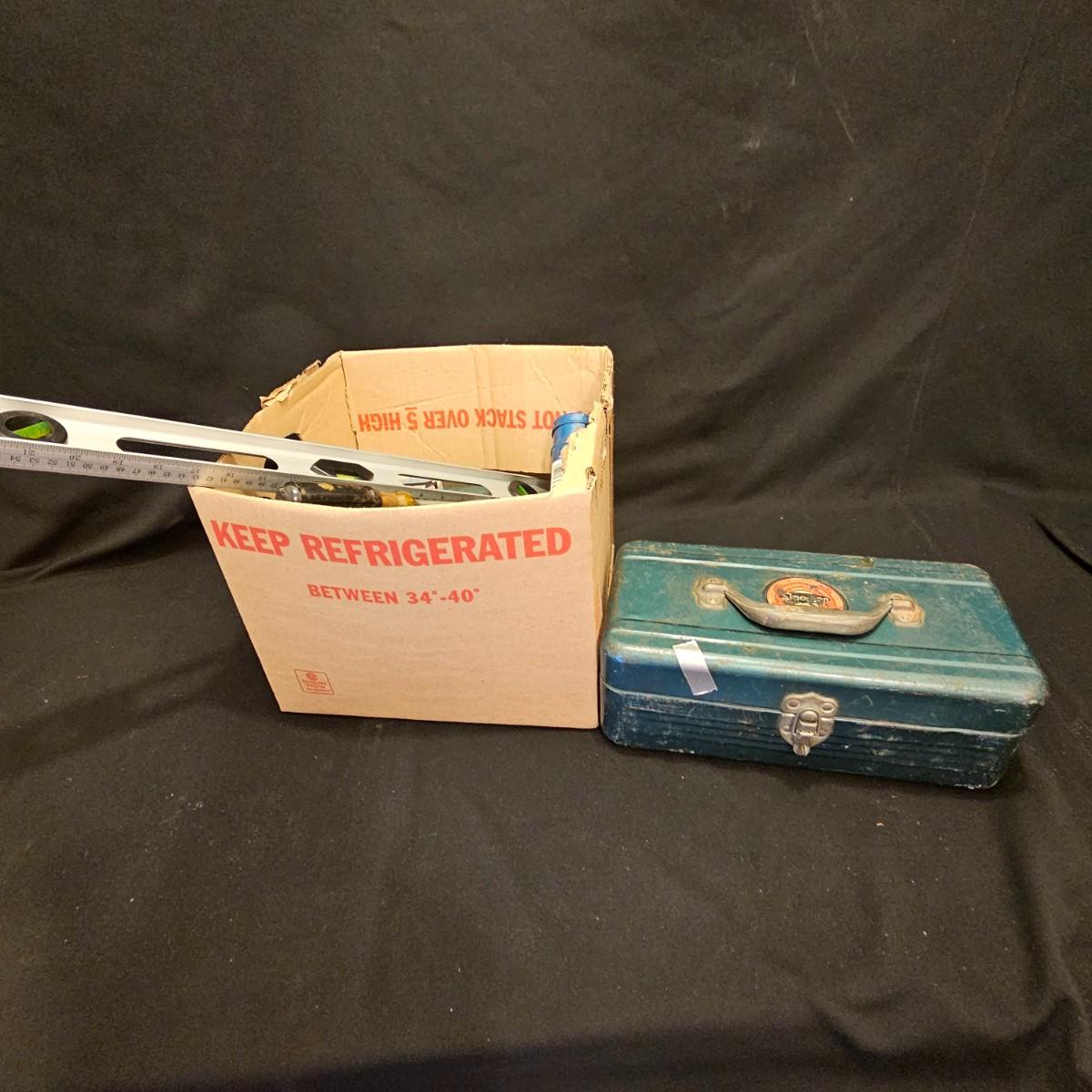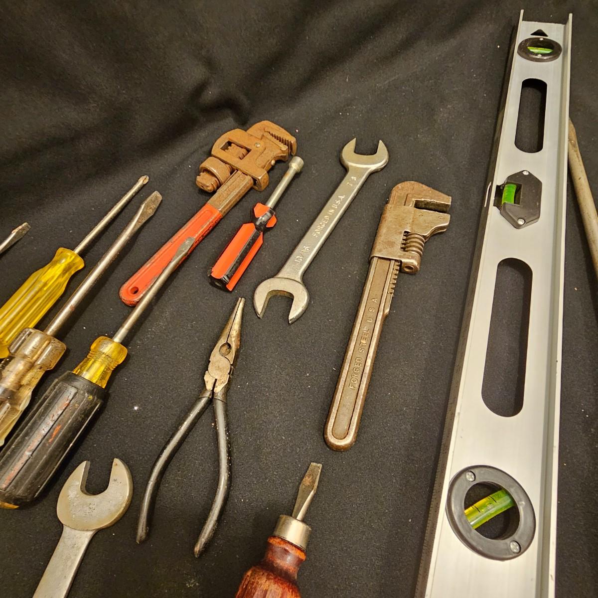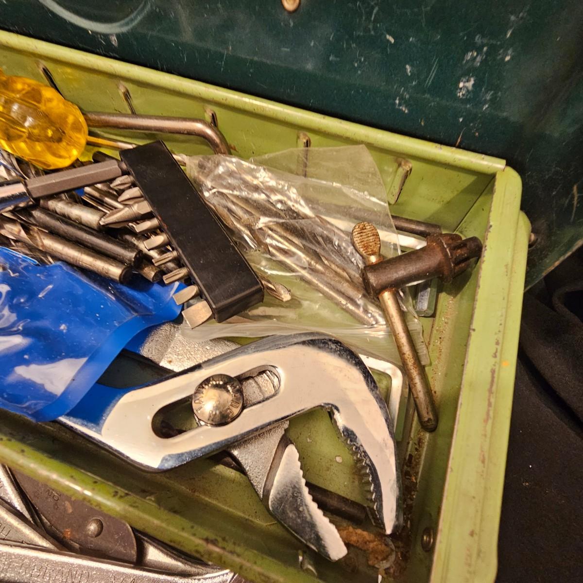 Metal toolbox, small assorted handtools, wrenches, screwdrivers and more. Drill bits, pliers, hacksaw, 24" level. All items used. See photos for details. Local pickup only.
