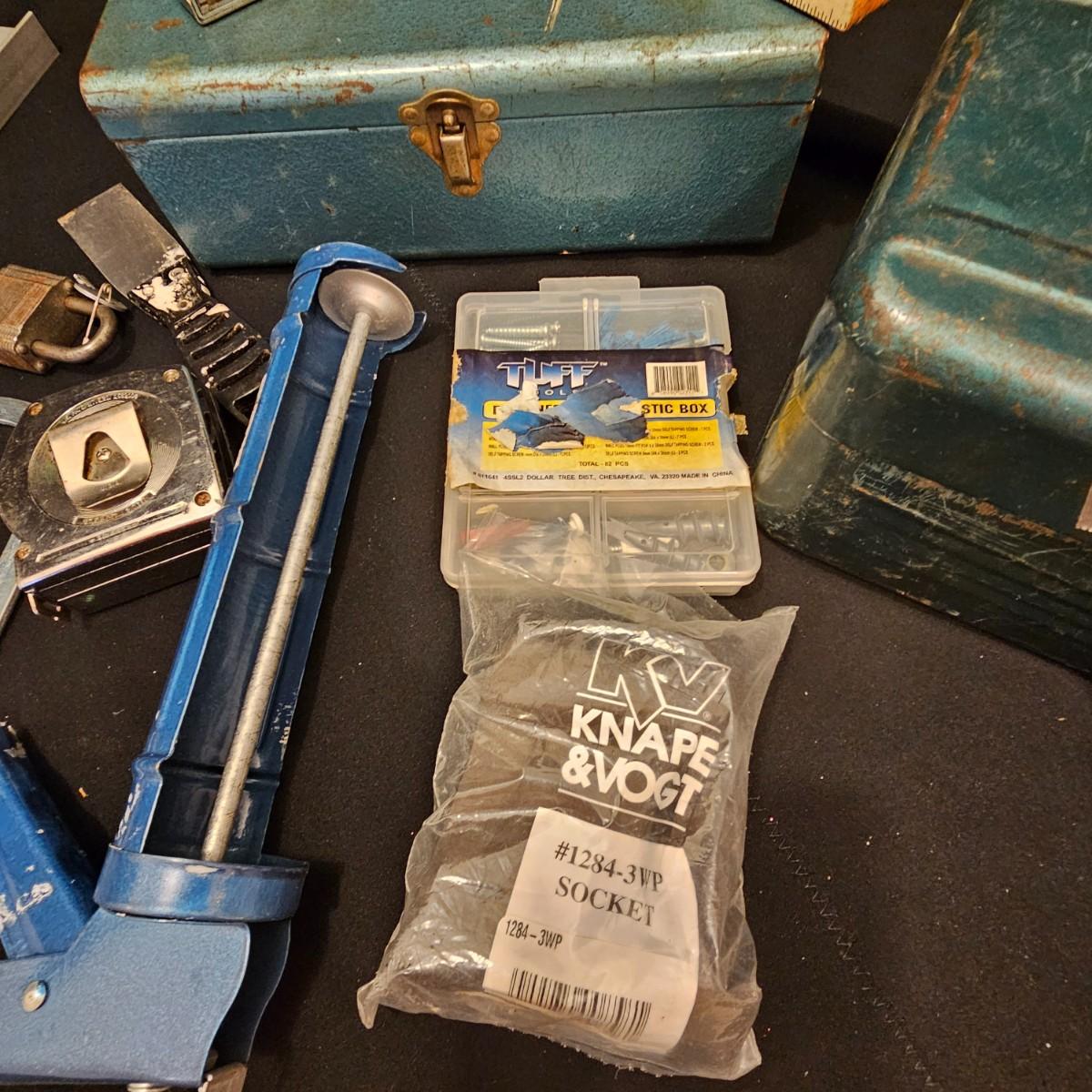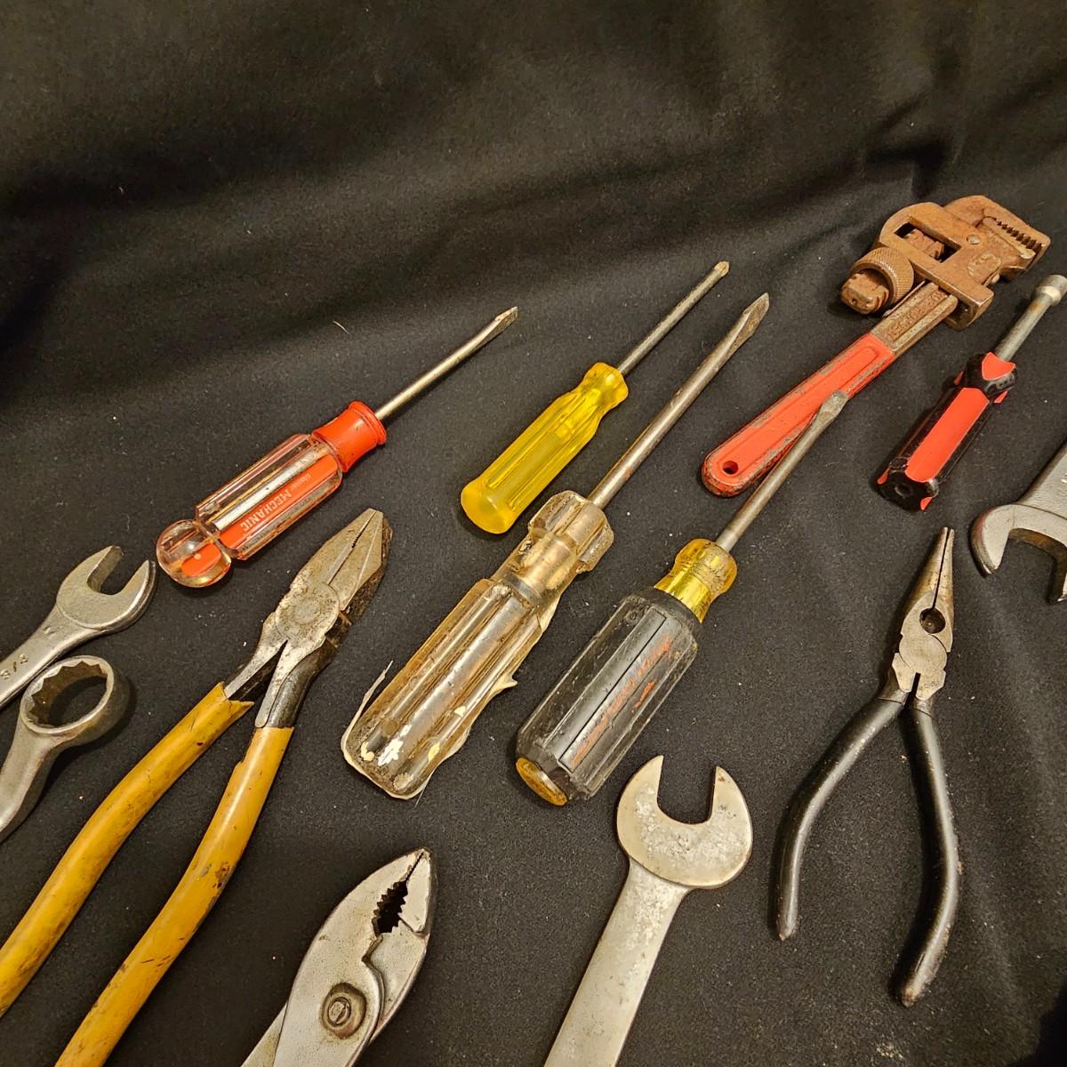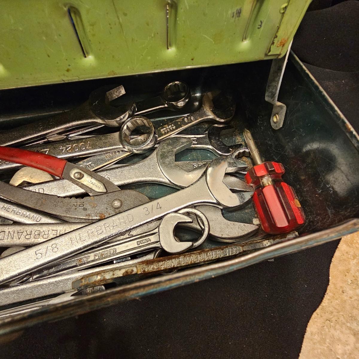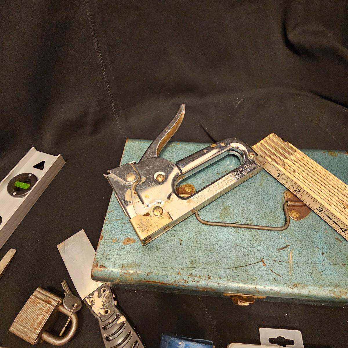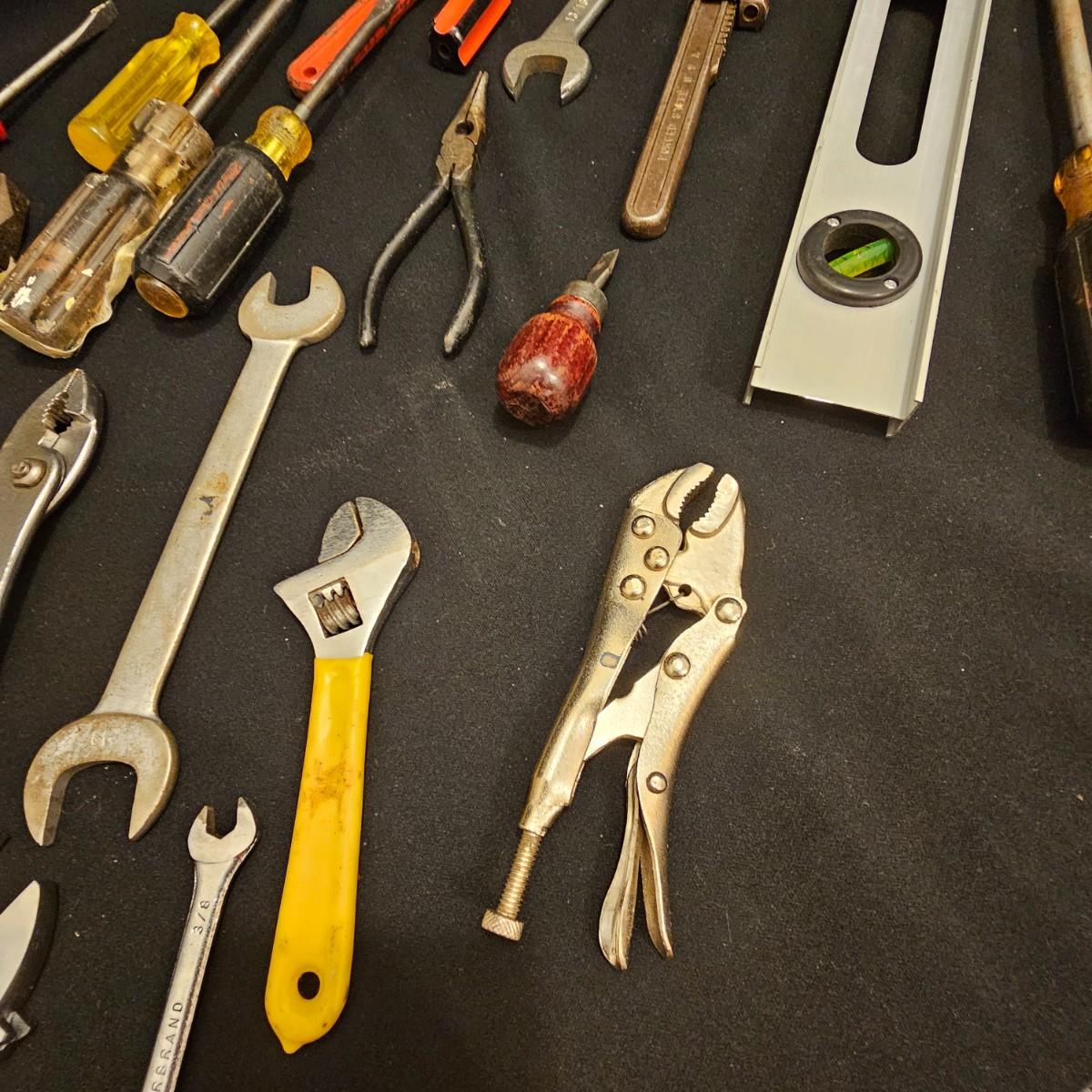 Metal toolbox, small assorted handtools, wrenches, screwdrivers and more. Drill bits, pliers, hacksaw, 24" level. All items used. See photos for details. Local pickup only.