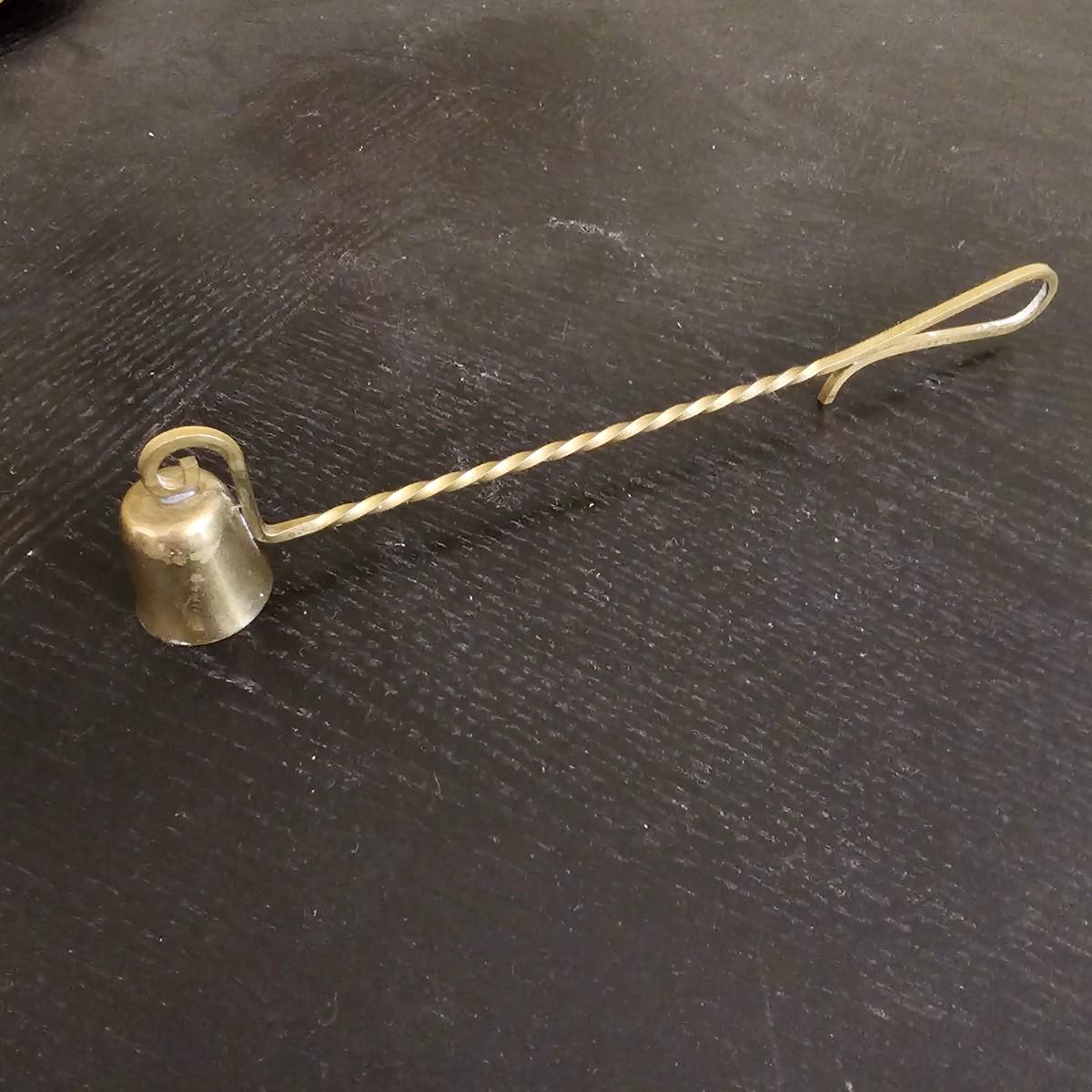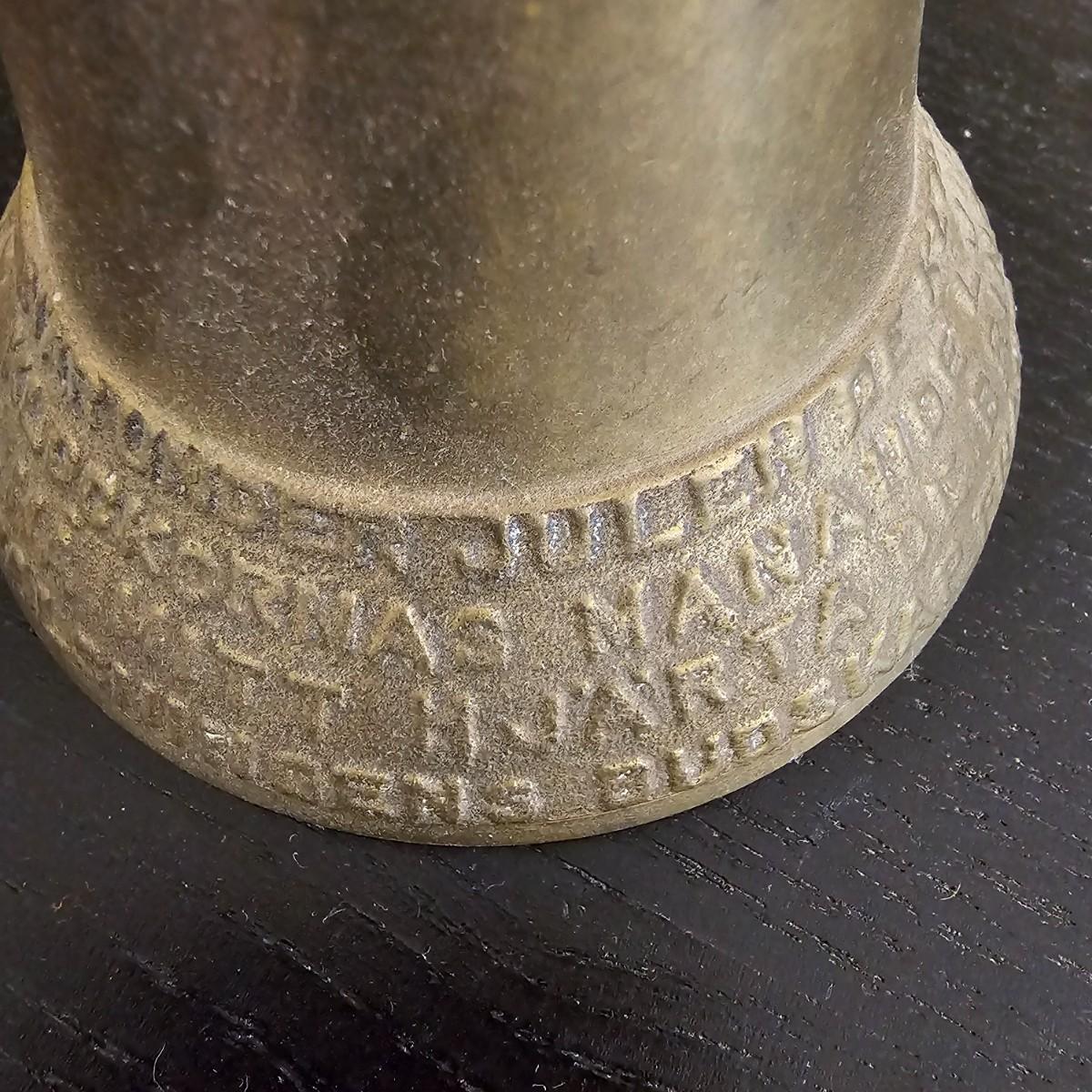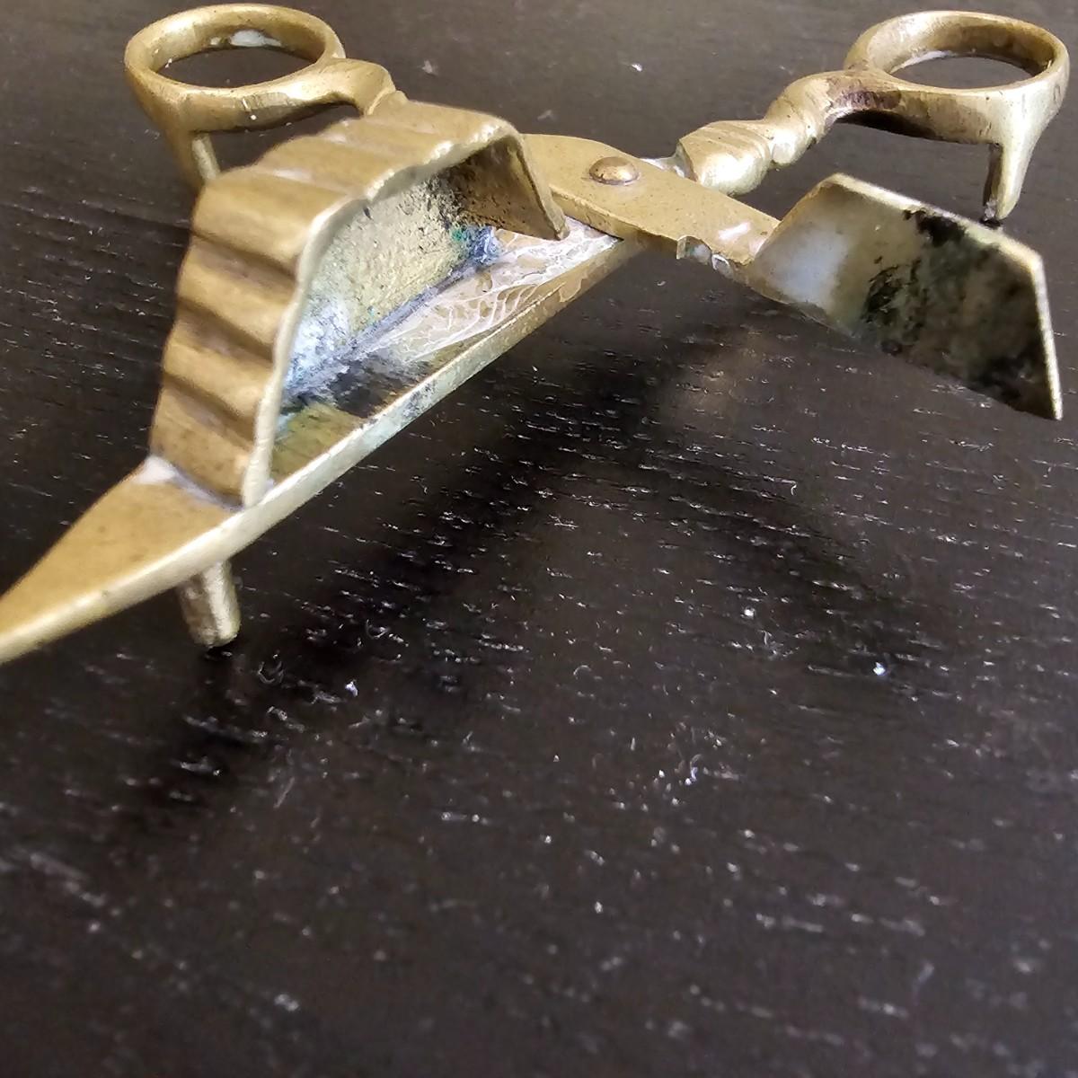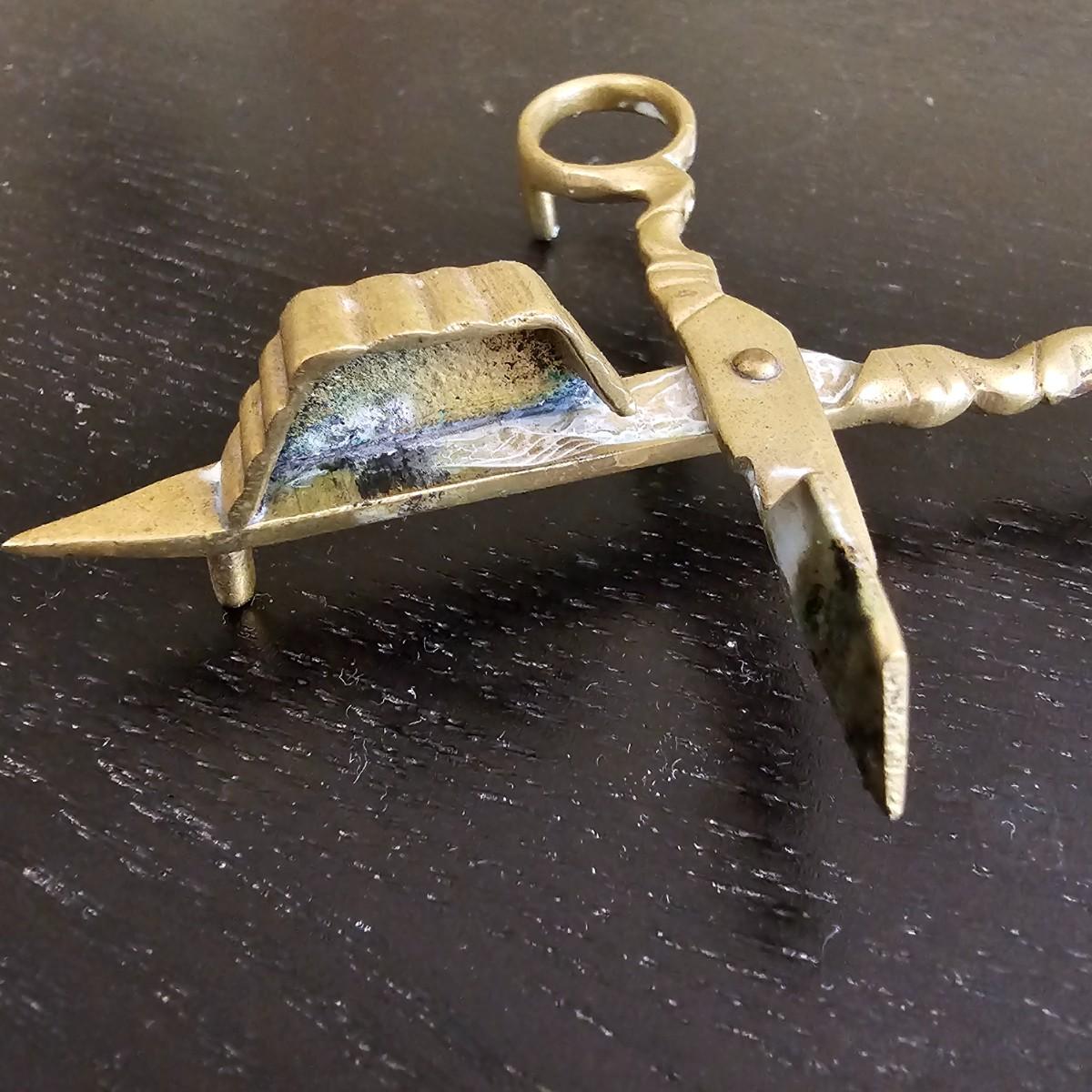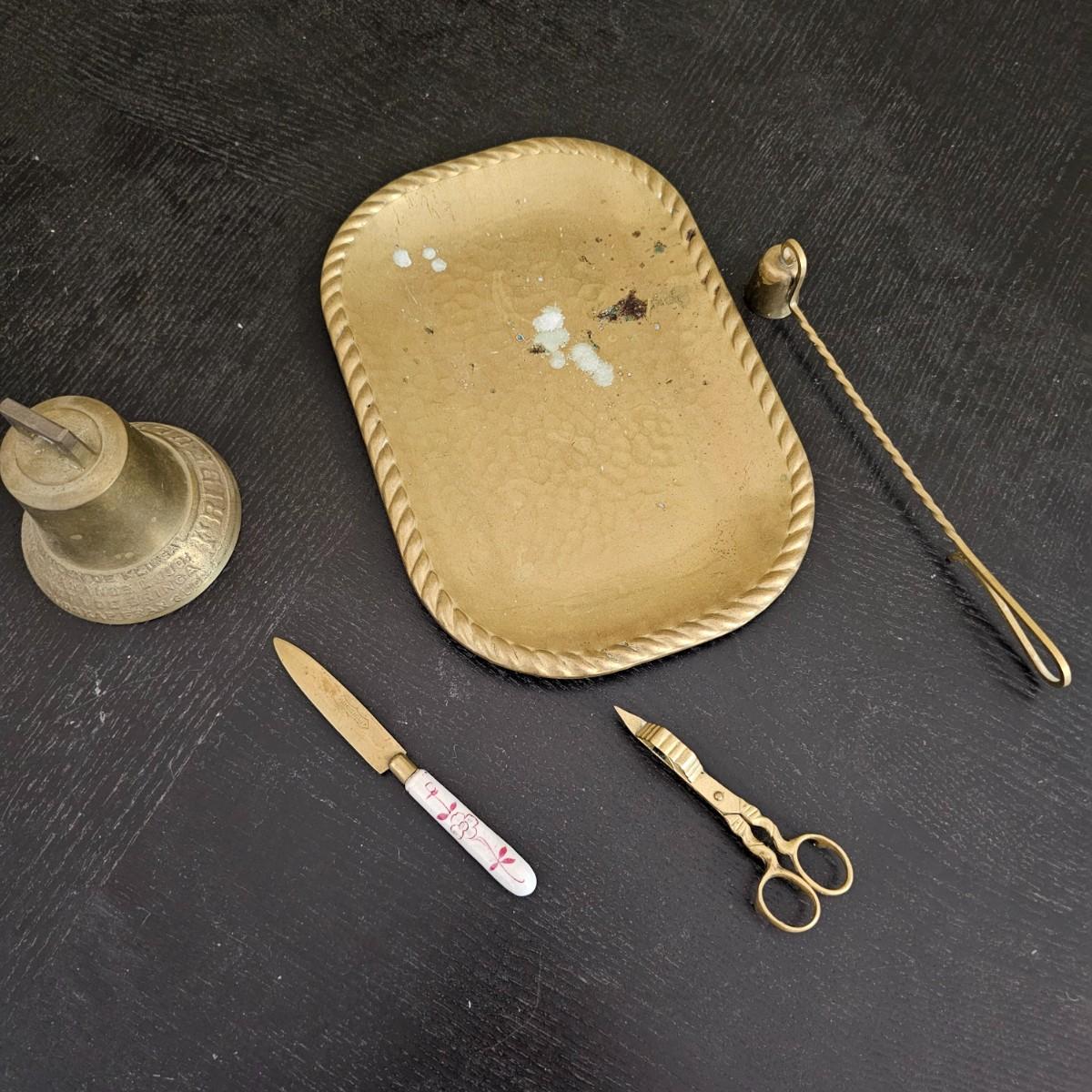 A tray, bell, candle snuffer and more in this lot. Tray with corded edge is 7.5" x 11", has some discoloration and wax on surface. Bell is 4"D x 3.5"H, appears to have some Danish or Swedish wording on outside. Candle snuffer is 9" long. Small knife/letter opener has words Lchatius Bronce on blade. Small scissors items are for trimming candle wicks. See photos for details. Shipping available.