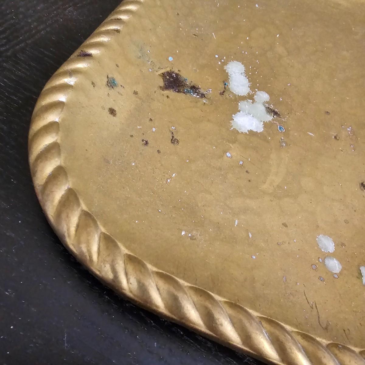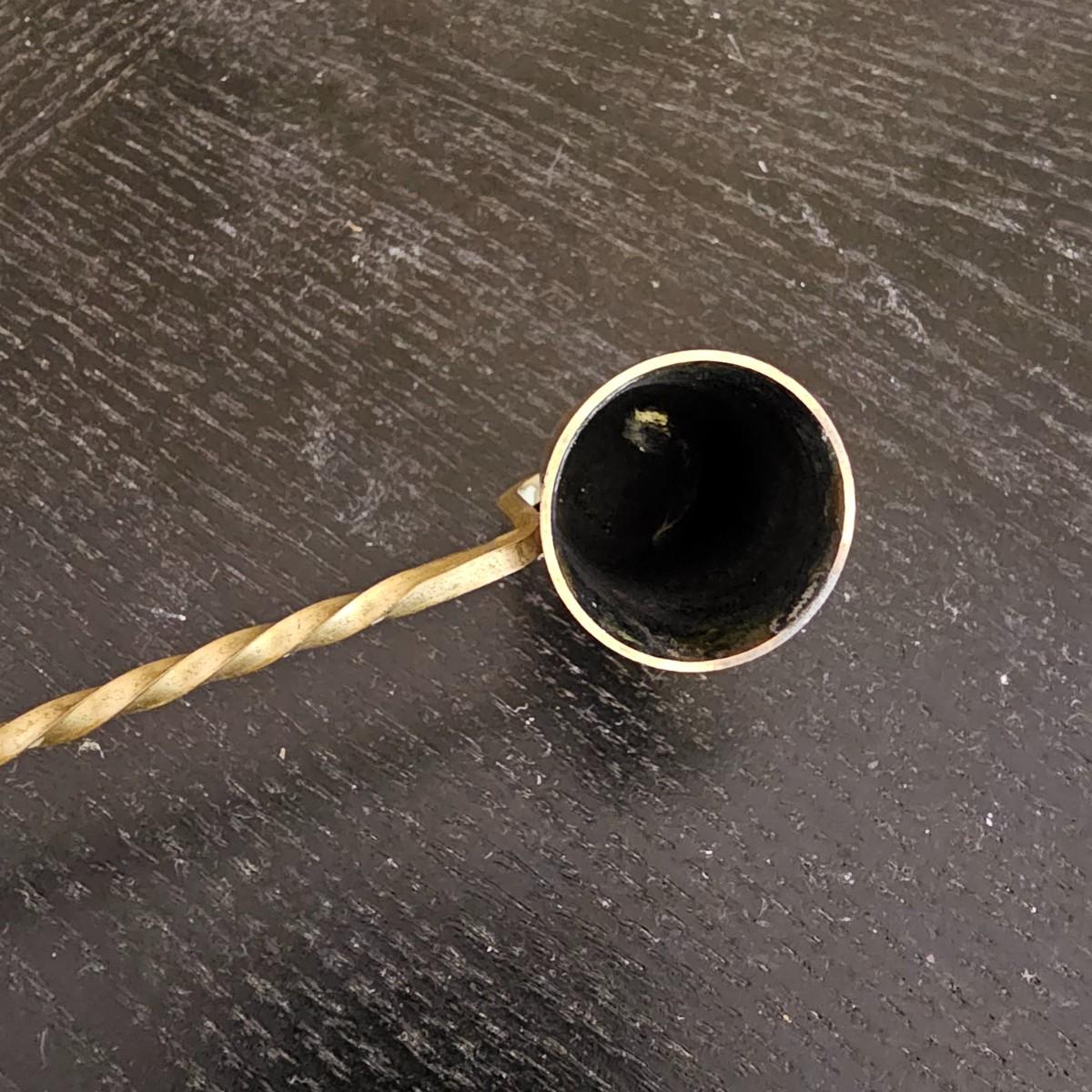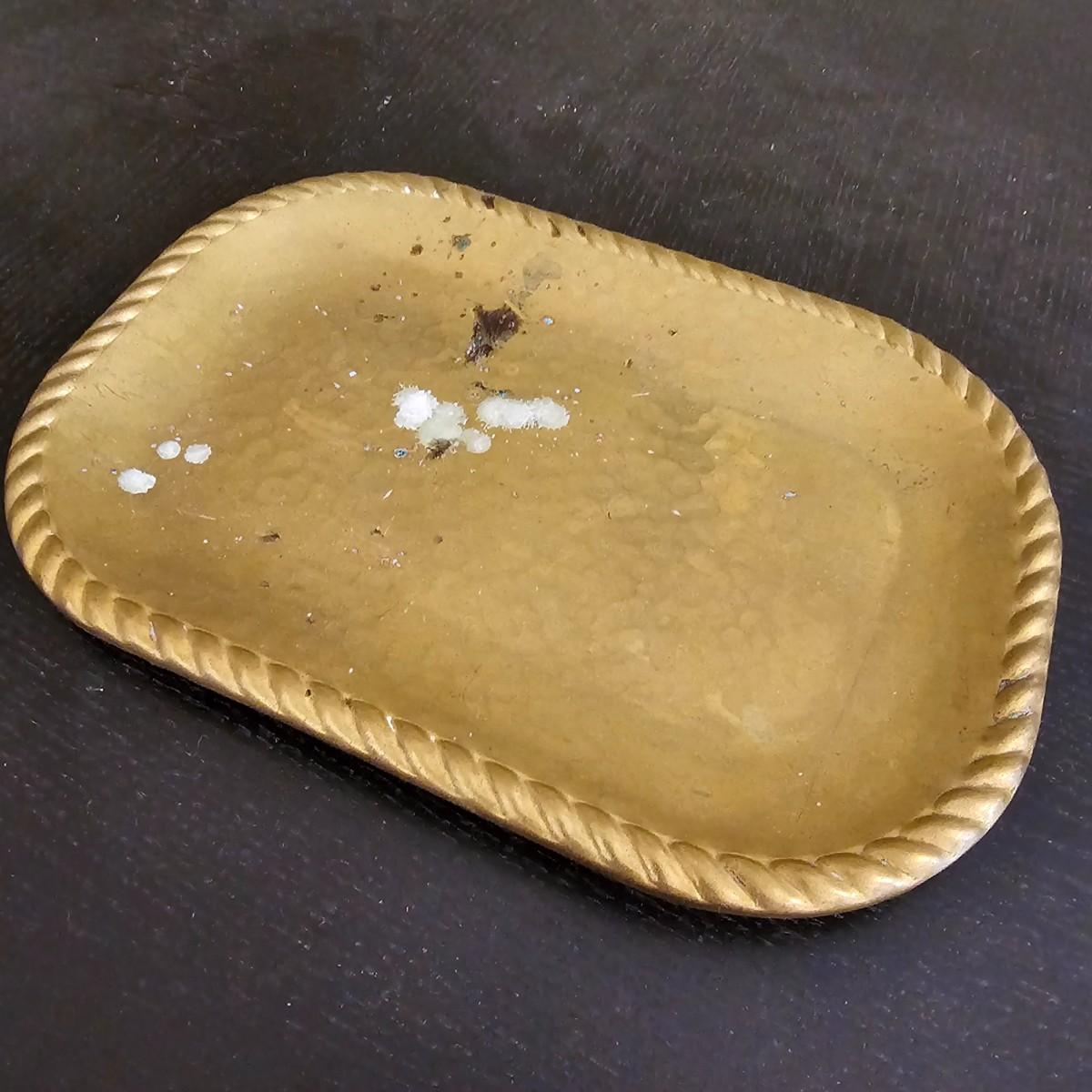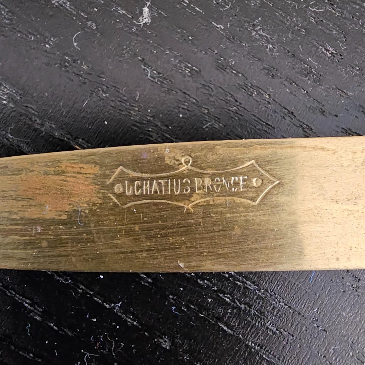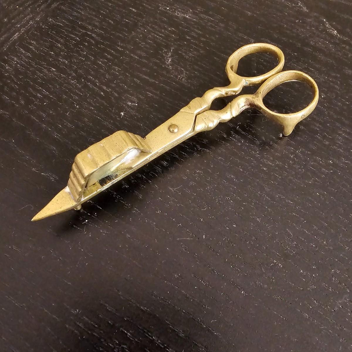 A tray, bell, candle snuffer and more in this lot. Tray with corded edge is 7.5" x 11", has some discoloration and wax on surface. Bell is 4"D x 3.5"H, appears to have some Danish or Swedish wording on outside. Candle snuffer is 9" long. Small knife/letter opener has words Lchatius Bronce on blade. Small scissors items are for trimming candle wicks. See photos for details. Shipping available.