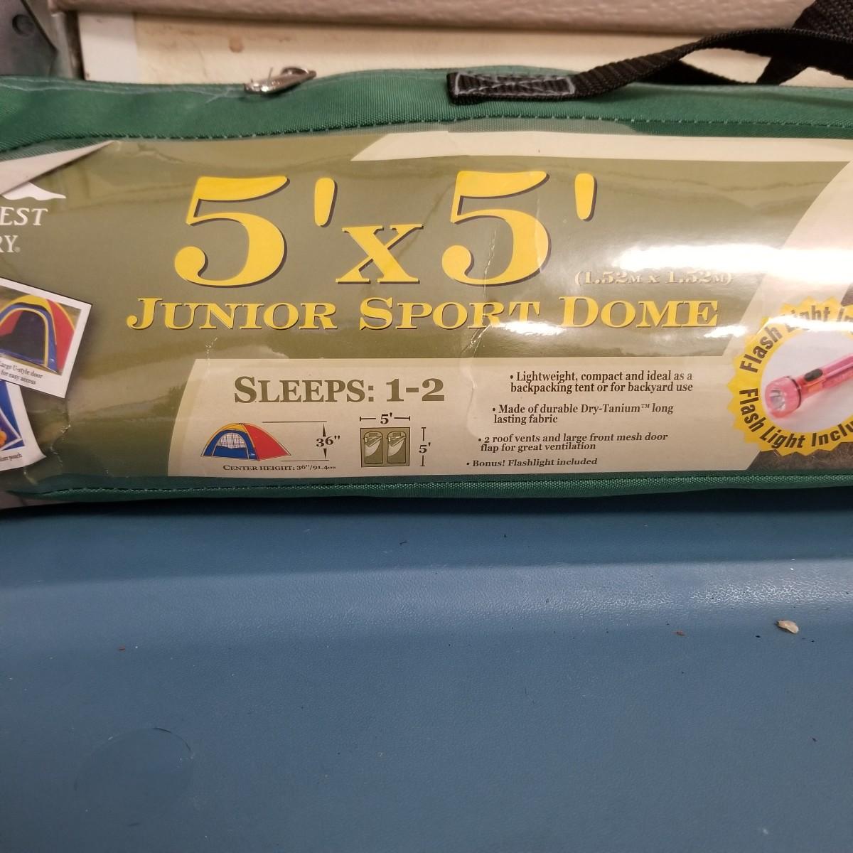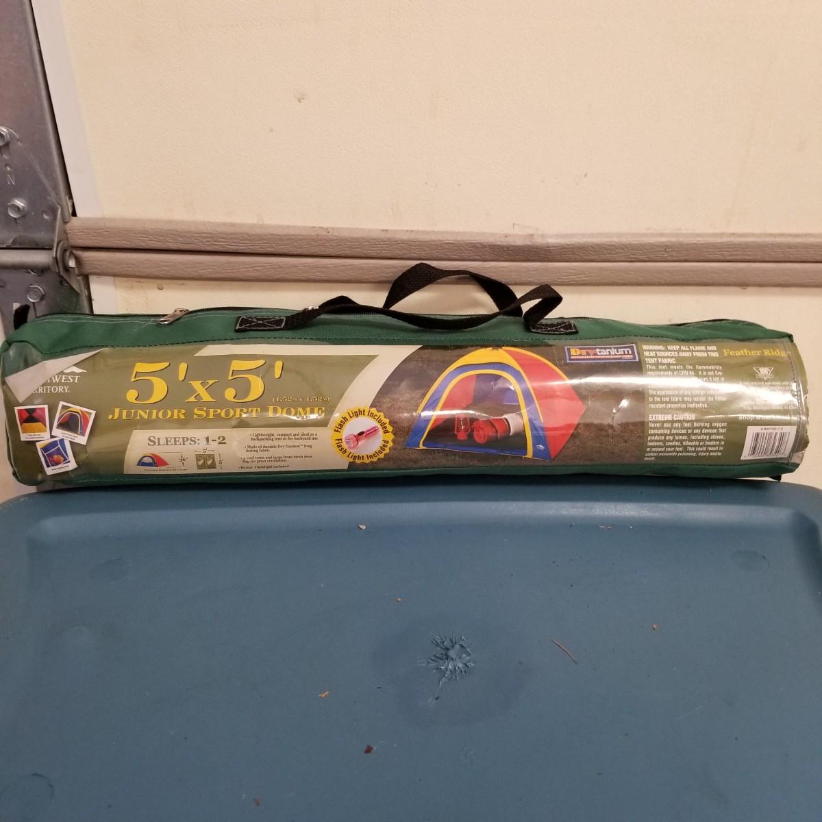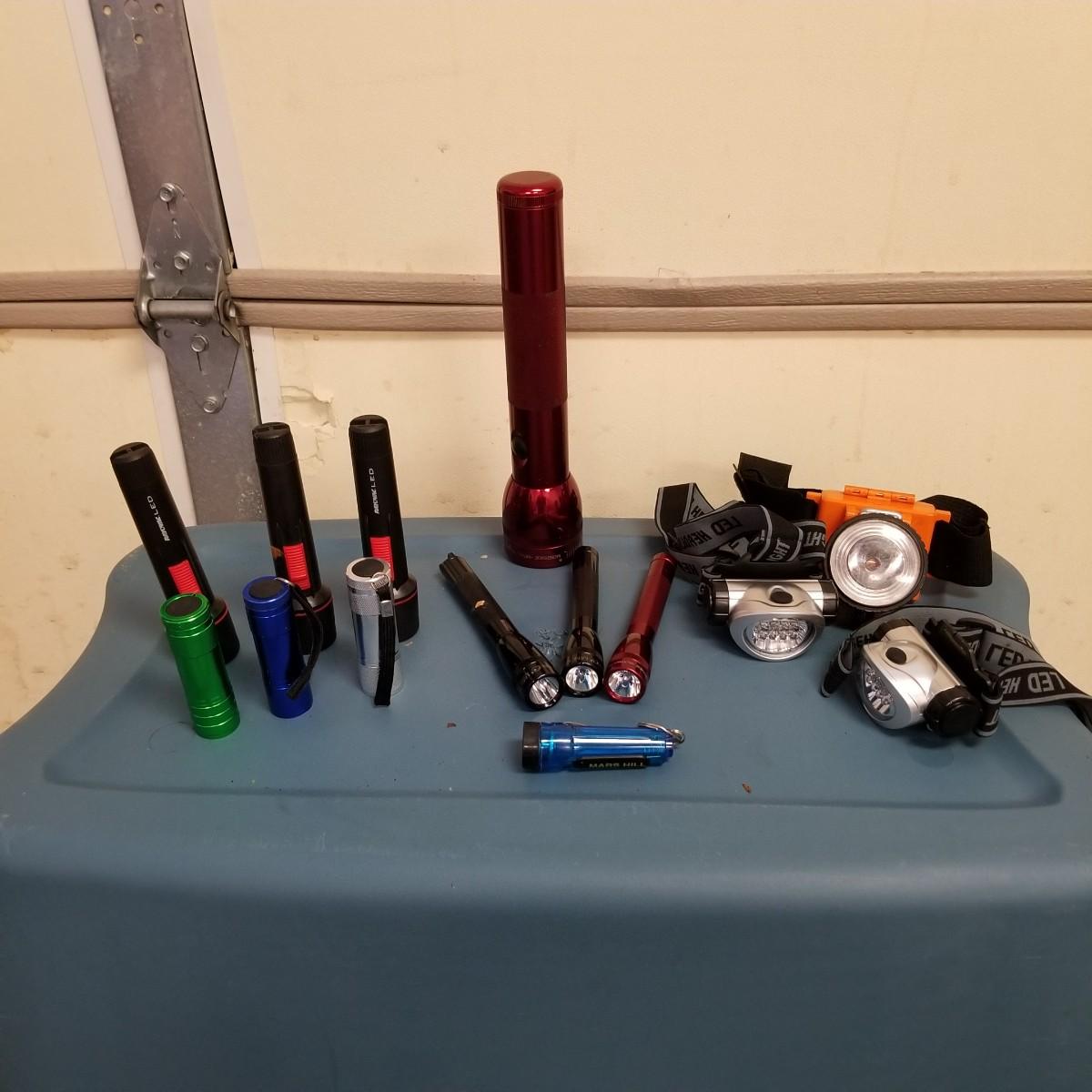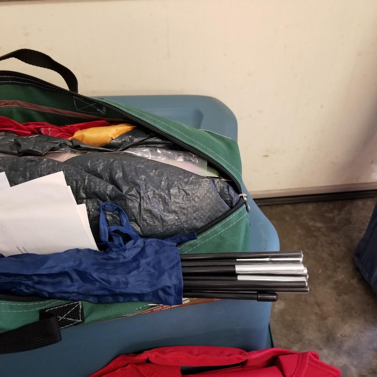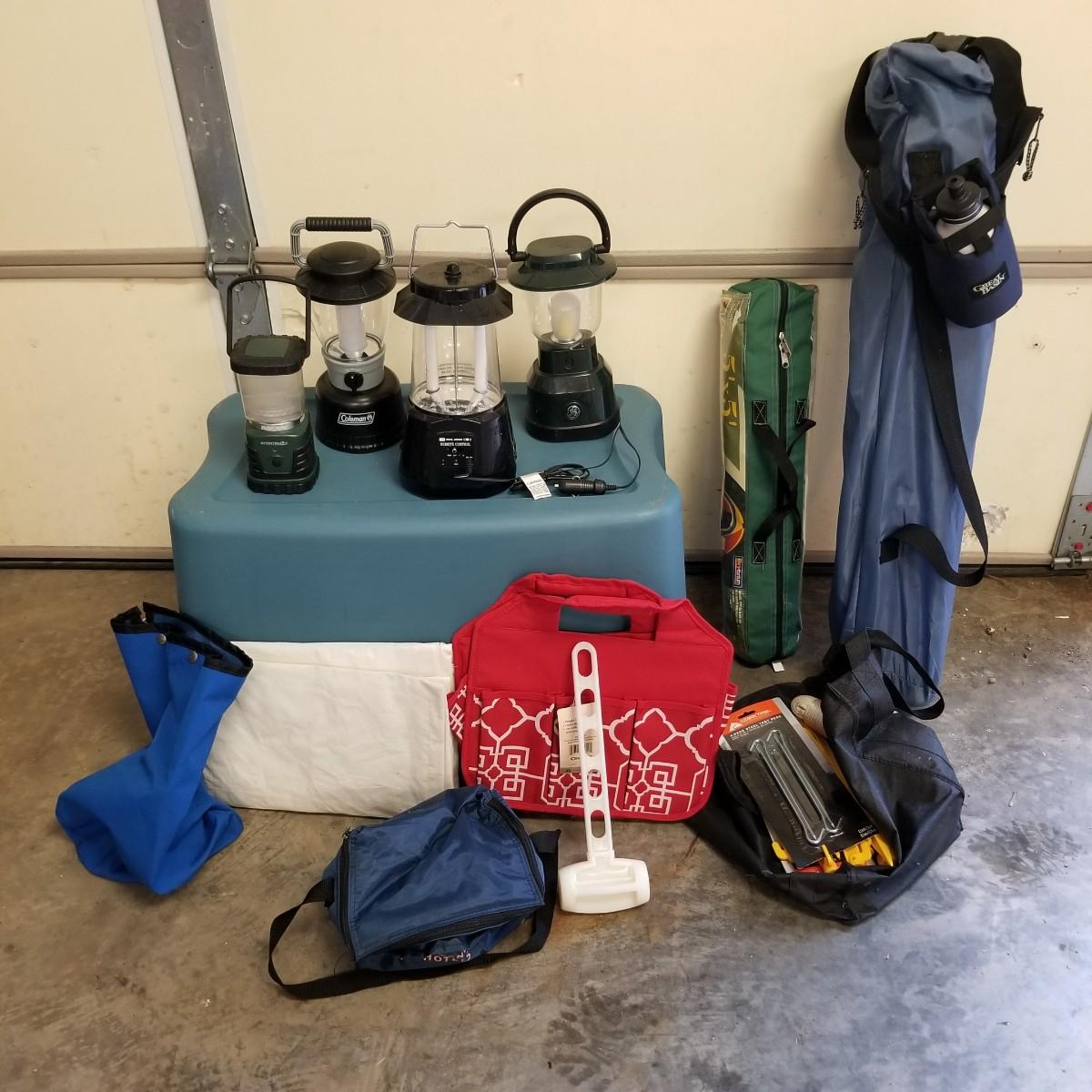 An assortment of small bags and a 5'x5' tent with poles (appears to be new in bag, but we cannot guarantee that all parts are present). Also, a folding chair with carry sack, bag with tent stakes and mallet, ground tarp, twin Intel air mattress (not tested) and small cooler. Also includes four lanterns (Coleman, Rayovac, GE.), all battery operated. Three units functional, fourth needs charged and includes 12 volt charger. And fourteen flashlights by Rayovac, Maglite and others. Most flashlights worked when tested. All items are in good condition. See photos for details. Blue bin is NOT included. Local pickup only.