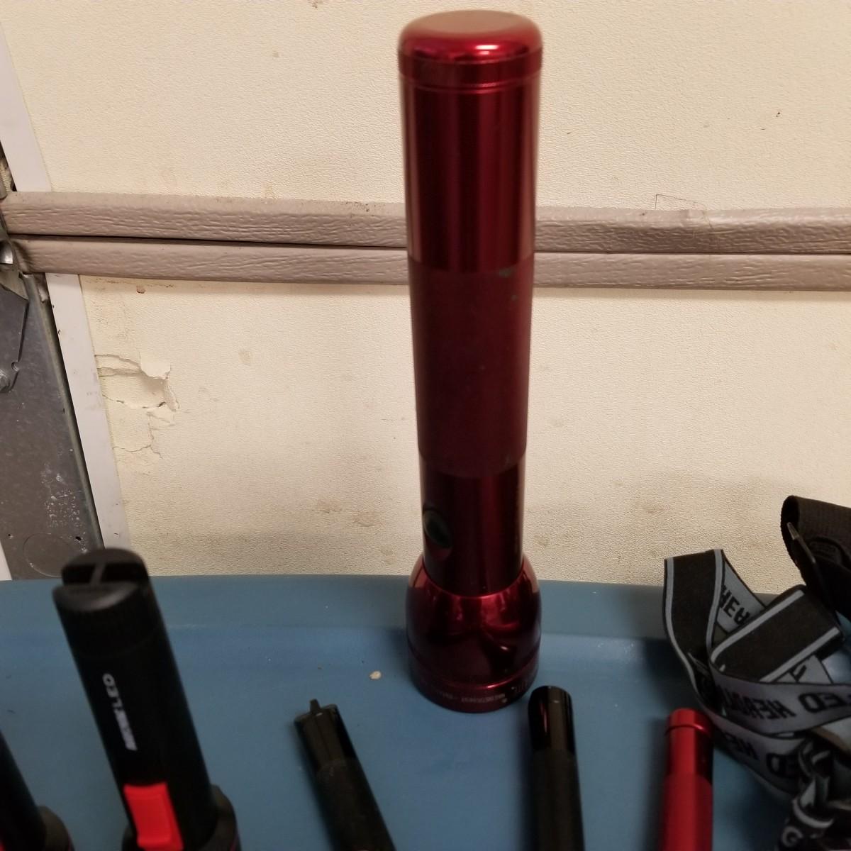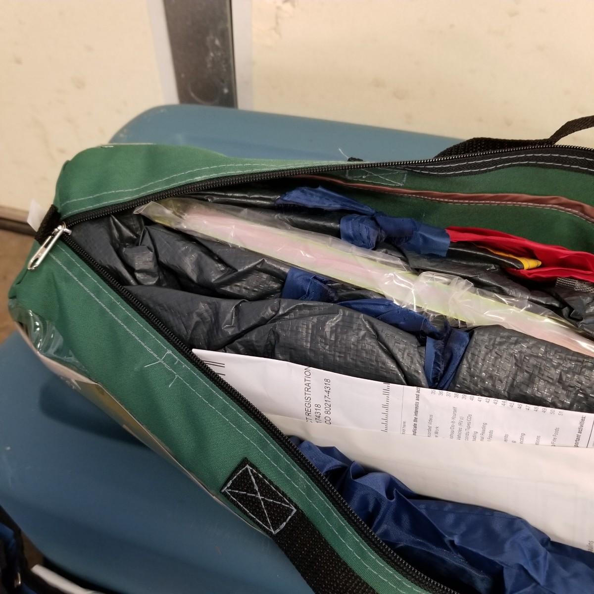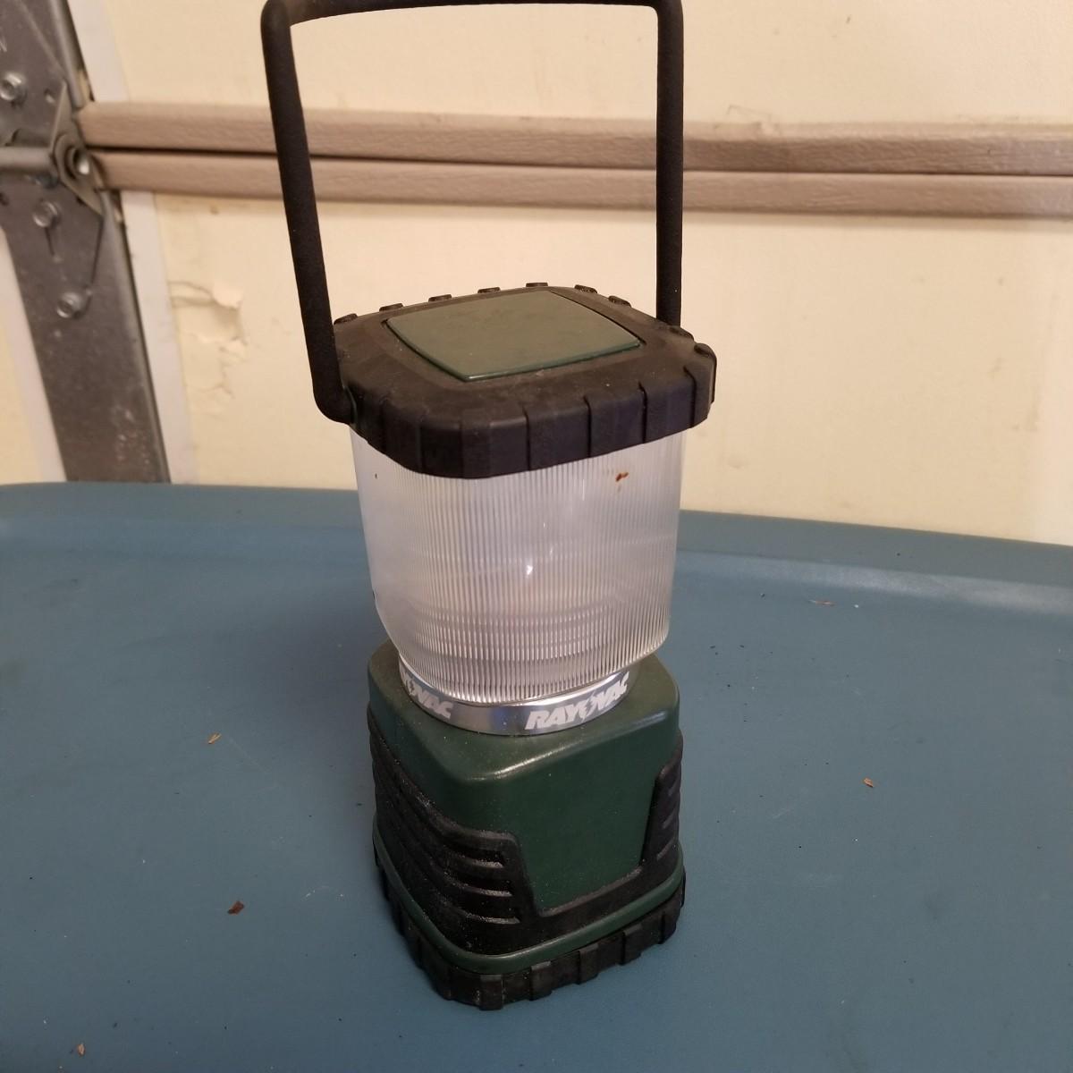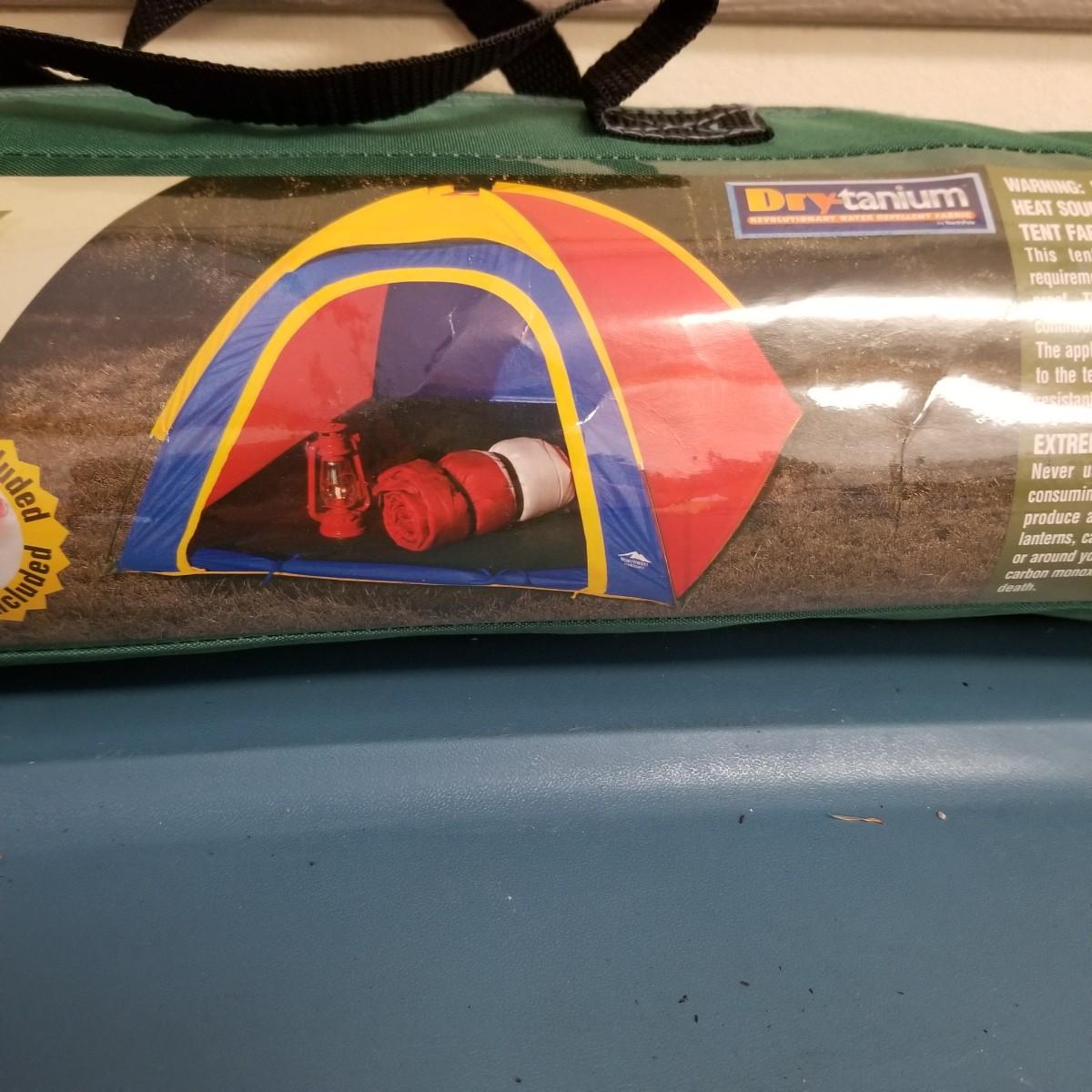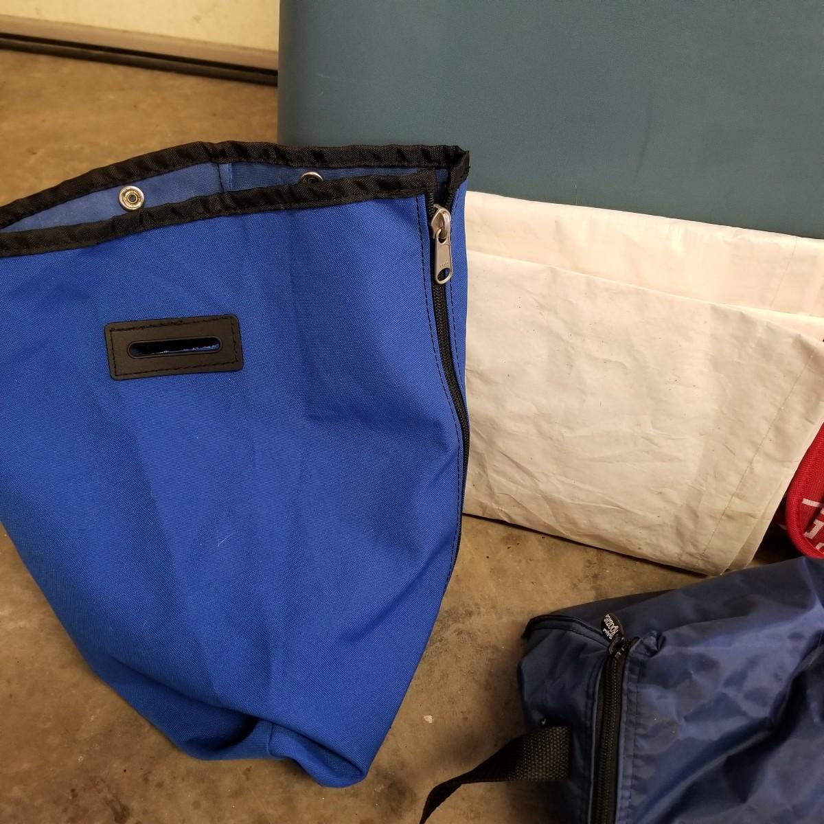 An assortment of small bags and a 5'x5' tent with poles (appears to be new in bag, but we cannot guarantee that all parts are present). Also, a folding chair with carry sack, bag with tent stakes and mallet, ground tarp, twin Intel air mattress (not tested) and small cooler. Also includes four lanterns (Coleman, Rayovac, GE.), all battery operated. Three units functional, fourth needs charged and includes 12 volt charger. And fourteen flashlights by Rayovac, Maglite and others. Most flashlights worked when tested. All items are in good condition. See photos for details. Blue bin is NOT included. Local pickup only.