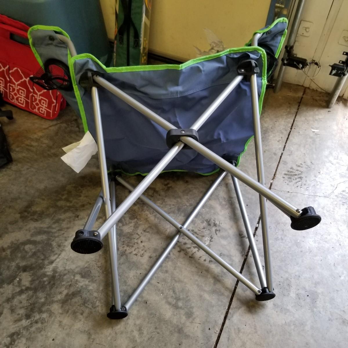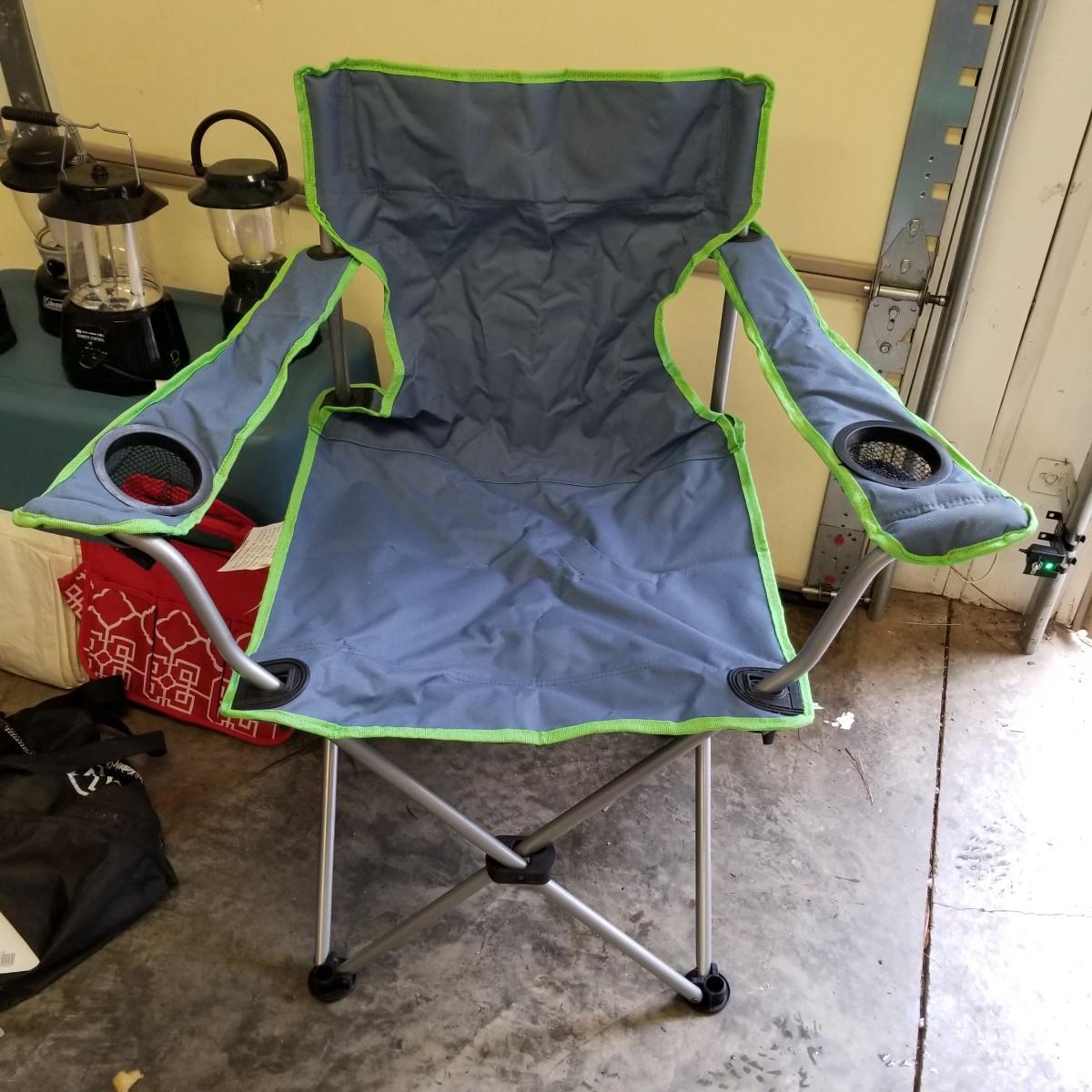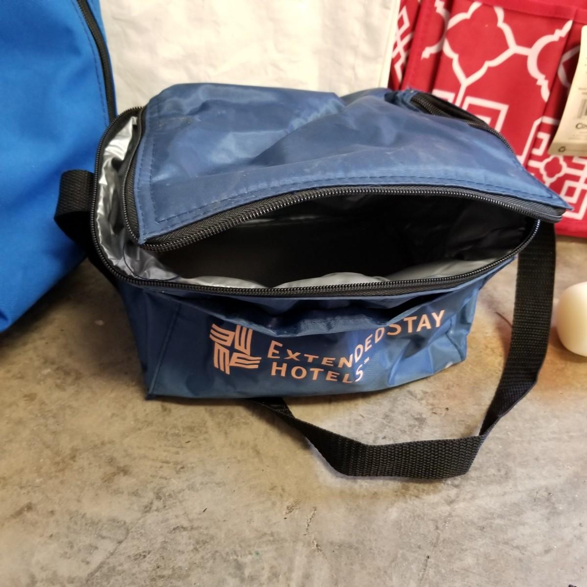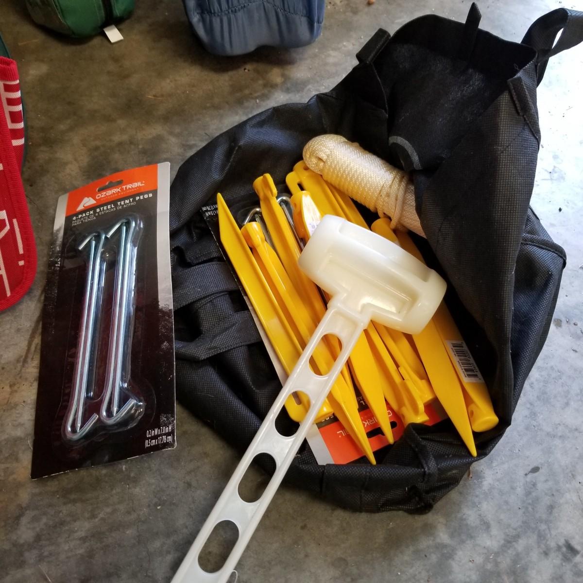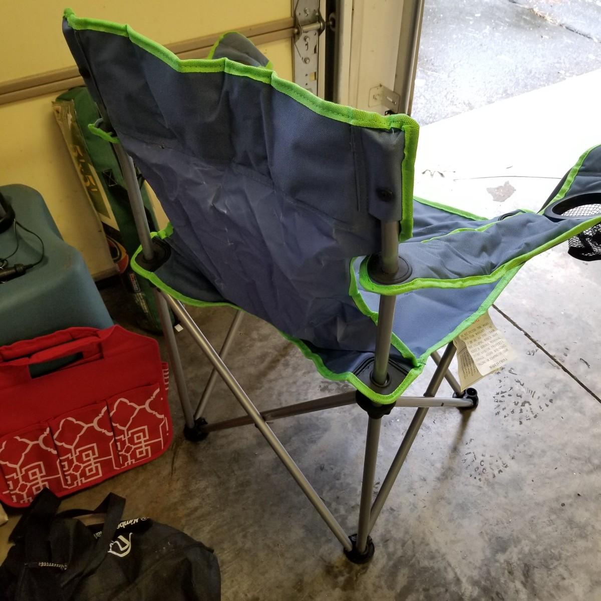 An assortment of small bags and a 5'x5' tent with poles (appears to be new in bag, but we cannot guarantee that all parts are present). Also, a folding chair with carry sack, bag with tent stakes and mallet, ground tarp, twin Intel air mattress (not tested) and small cooler. Also includes four lanterns (Coleman, Rayovac, GE.), all battery operated. Three units functional, fourth needs charged and includes 12 volt charger. And fourteen flashlights by Rayovac, Maglite and others. Most flashlights worked when tested. All items are in good condition. See photos for details. Blue bin is NOT included. Local pickup only.