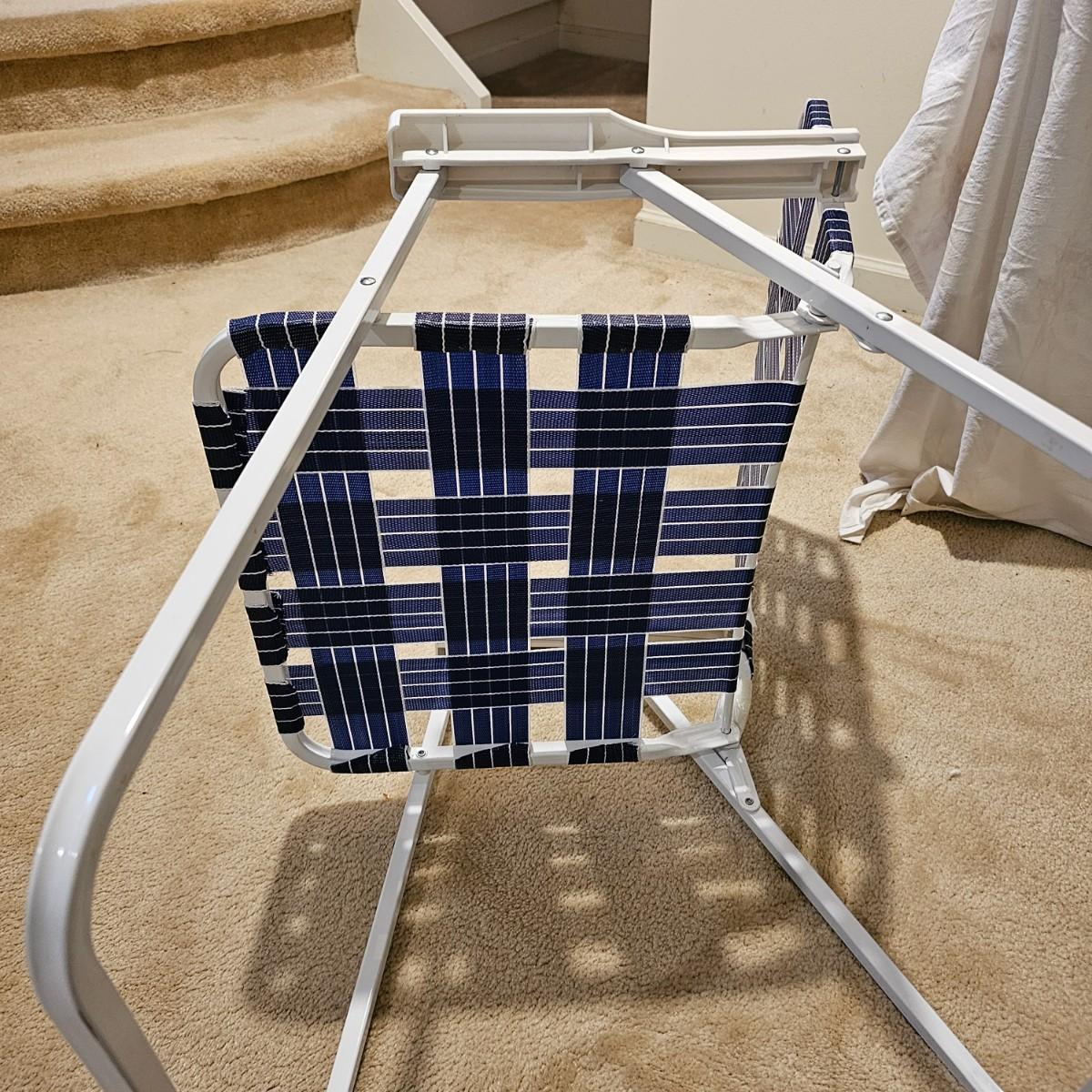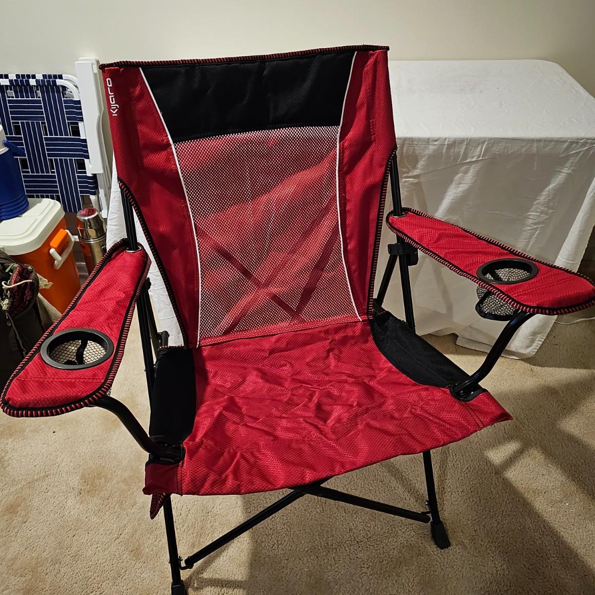 Chairs, coolers, thermos and more. Two blue web folding chairs with white arms, 22.5" x 21" x 31"H, seat height 16". Two fold in bag Kijaro chairs, 24.5" x 27" x 37"H, 18"seat height. One Gott handled cooler. 21" x 12" x 14"H. Small Coleman carry cooler 12" x 8.5" x 9"H. Also includes two thermos containers and a roll up sleeping bag. See photos for details. Local pickup only.