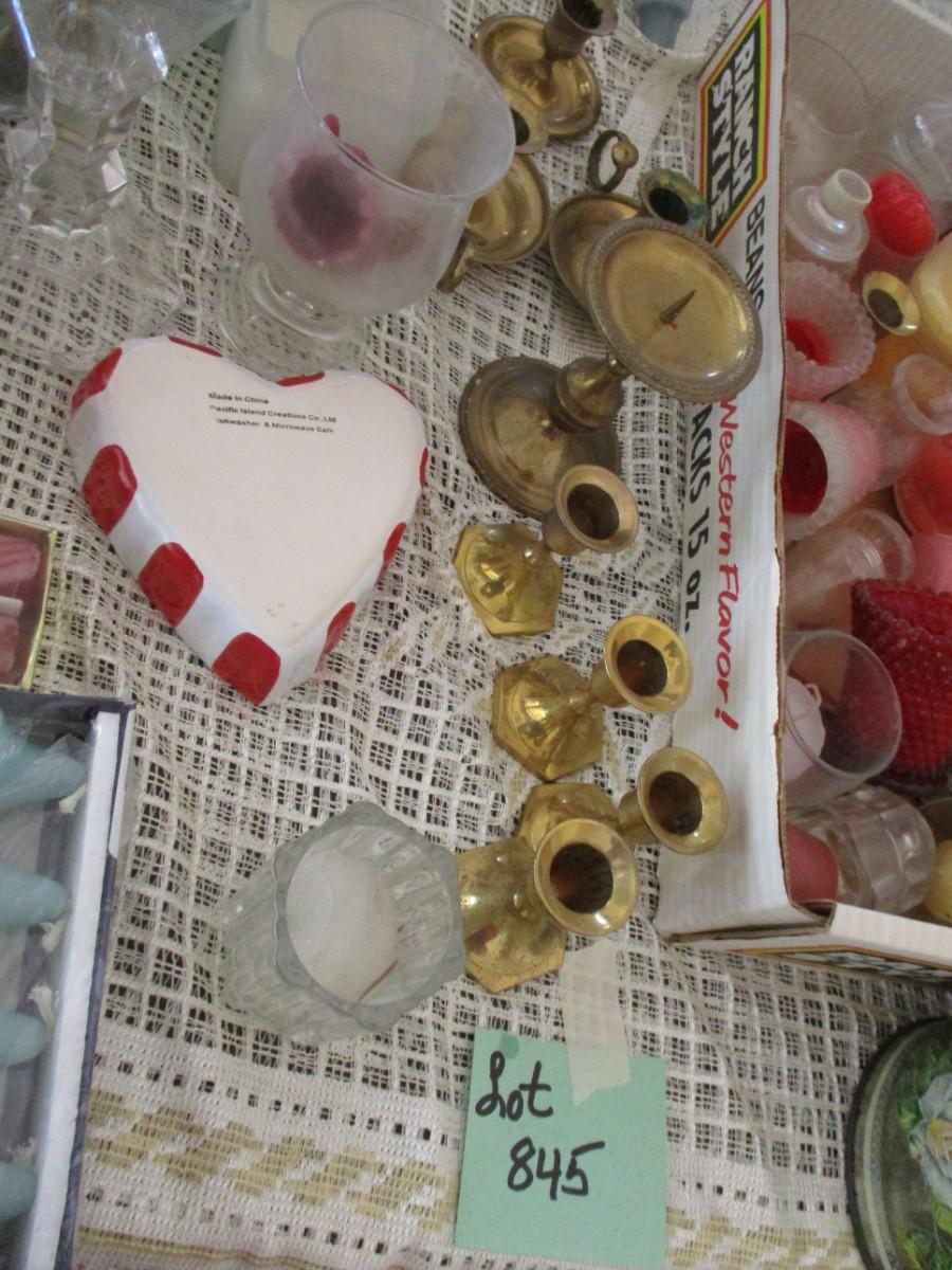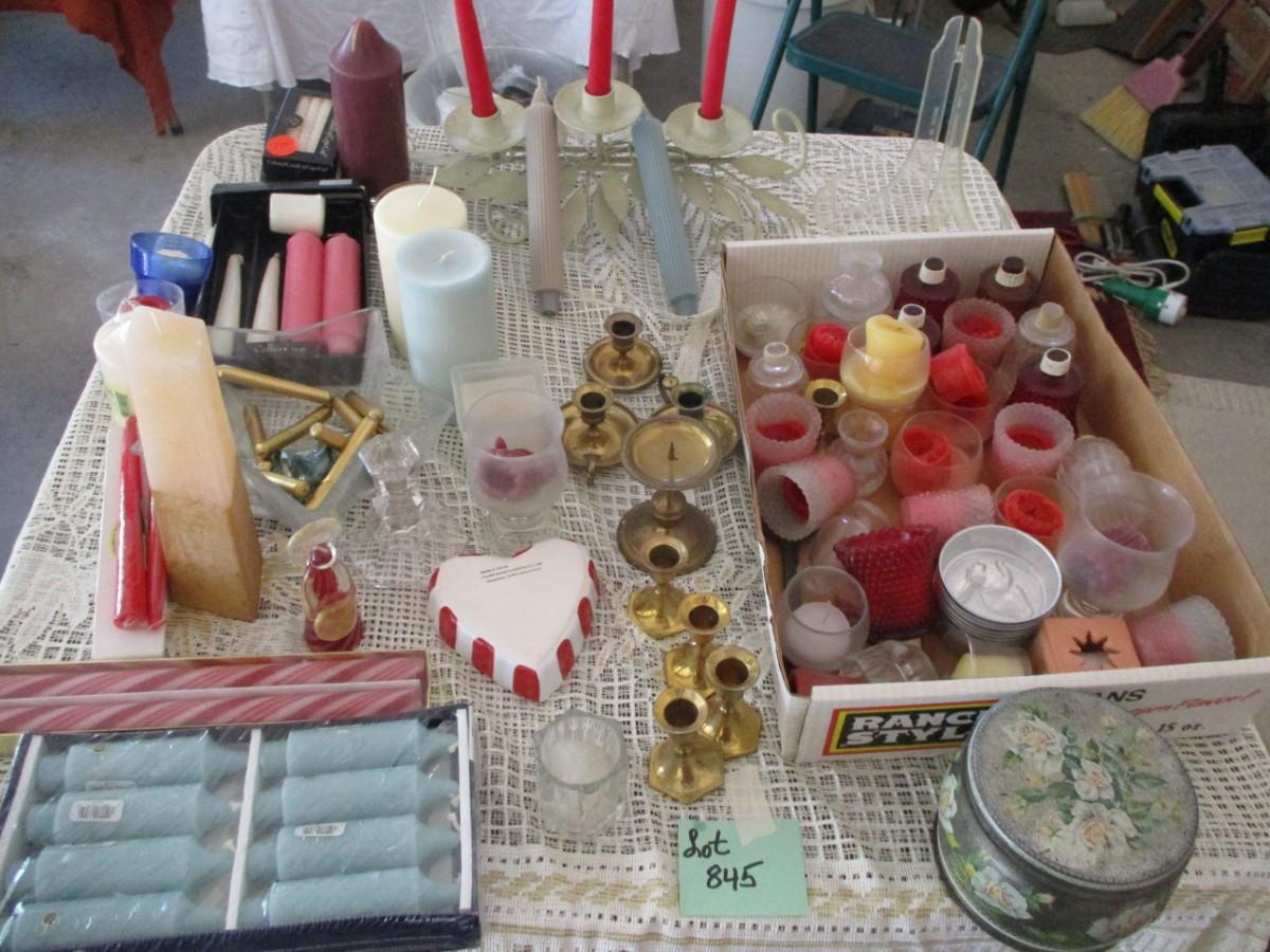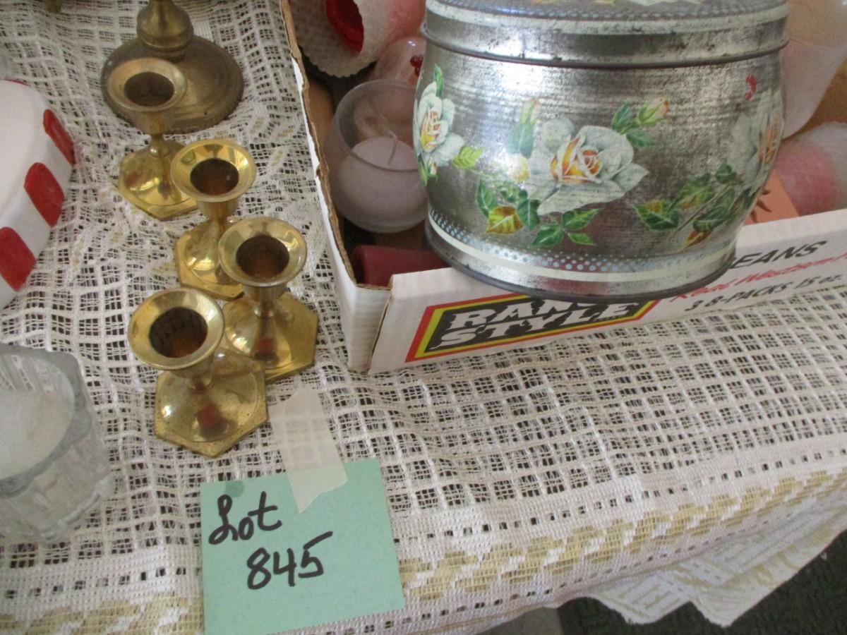 Brass Candle holders, Tin biscuit can, various candles
