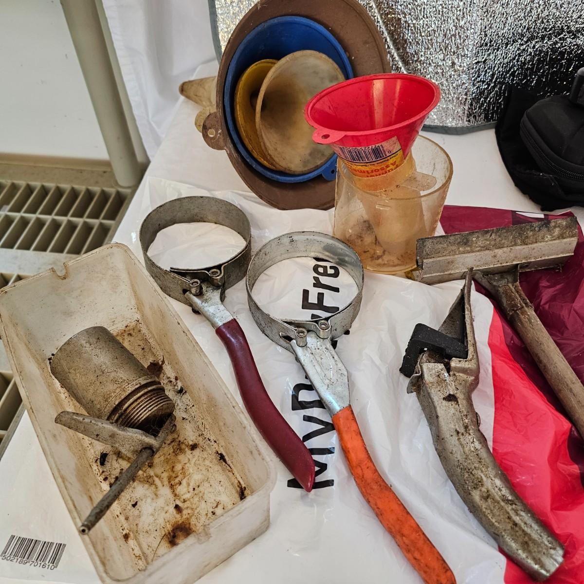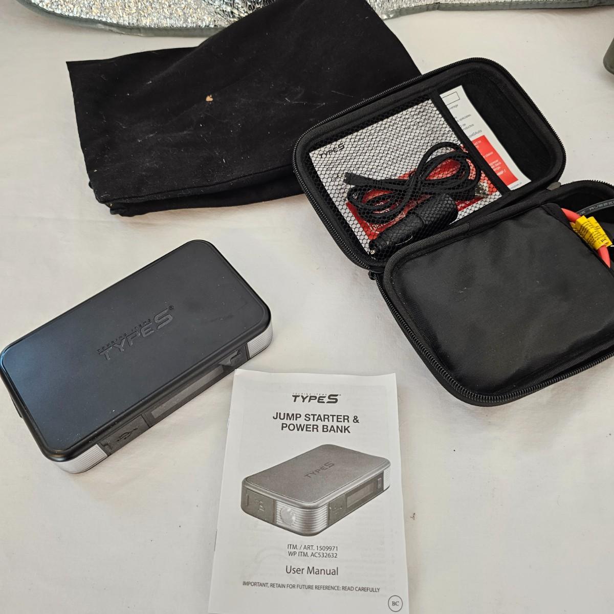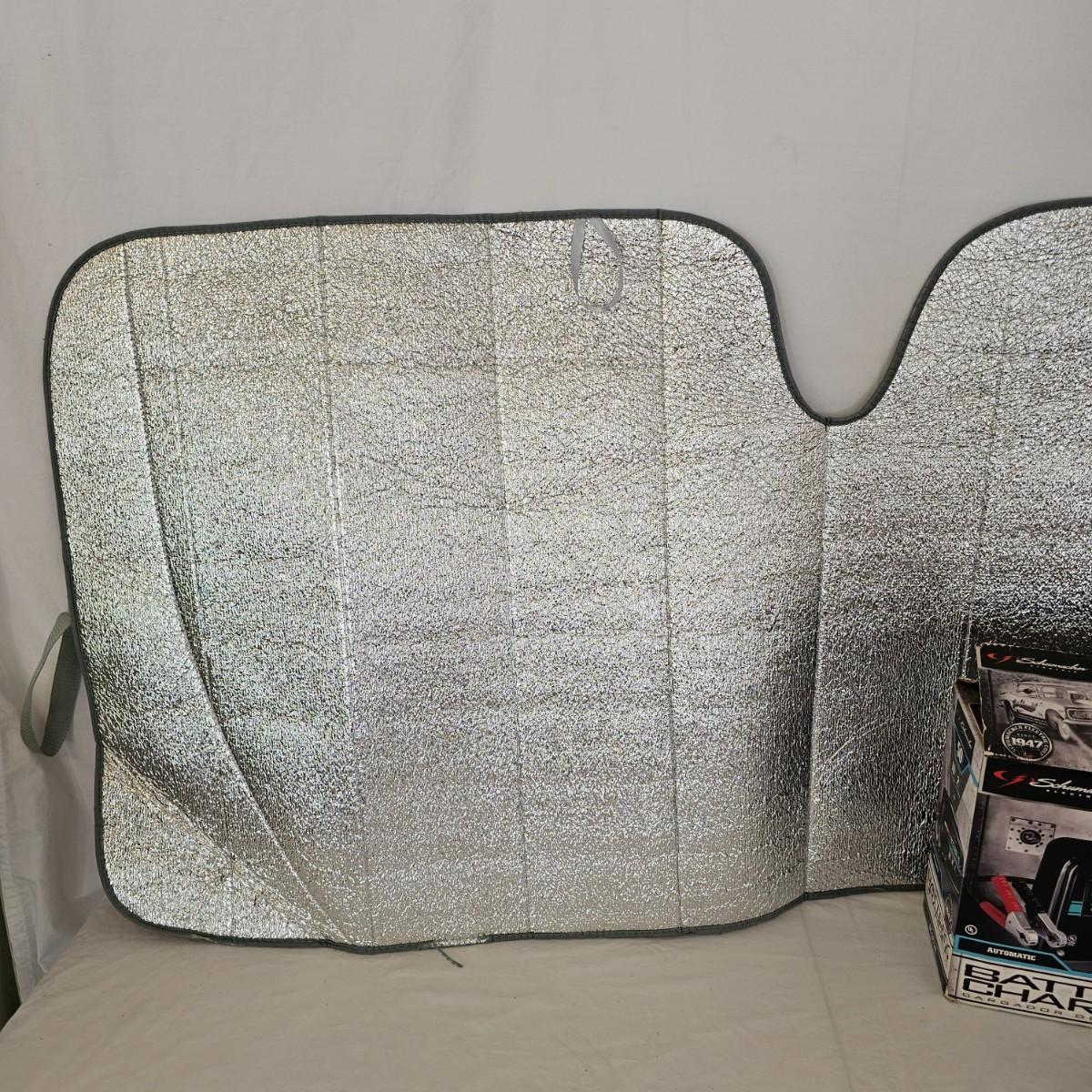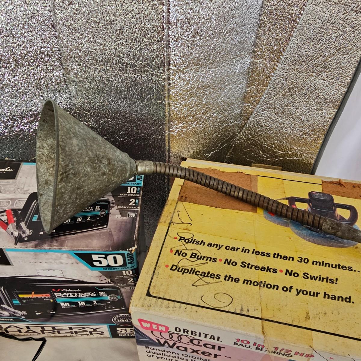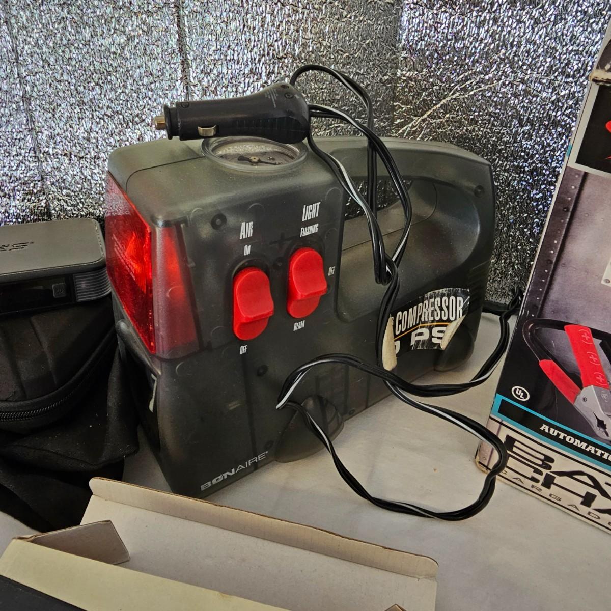 Funnels, oil filter wrenches, sunshade and more. Miscellaneous small tools, a power bank unit, unable to test. One garage parking aid, also unable to test. One 300 psi air compressor, powered on when plugged in, DC. One 50 amp Schumacher battery charger, powered on when plugged in. And one Wen 10" orbital car waxer with extra pads, also powered on when plugged in. See photos for details. Local pickup only.