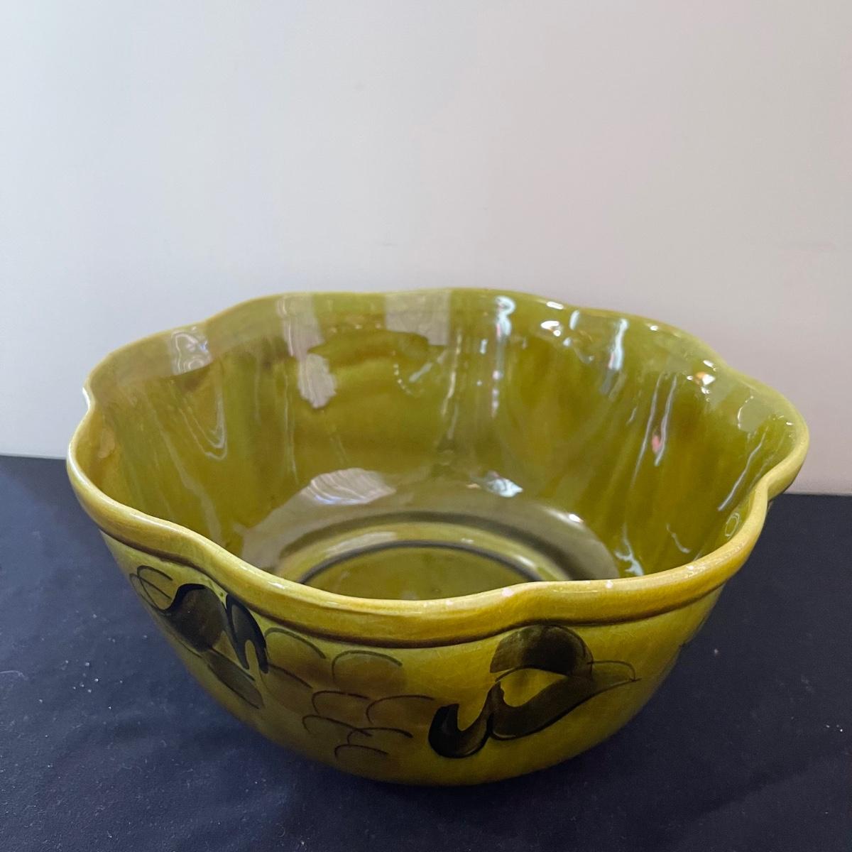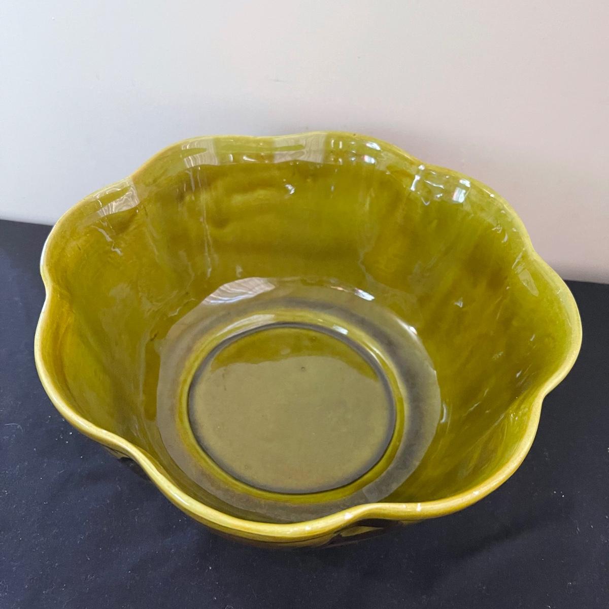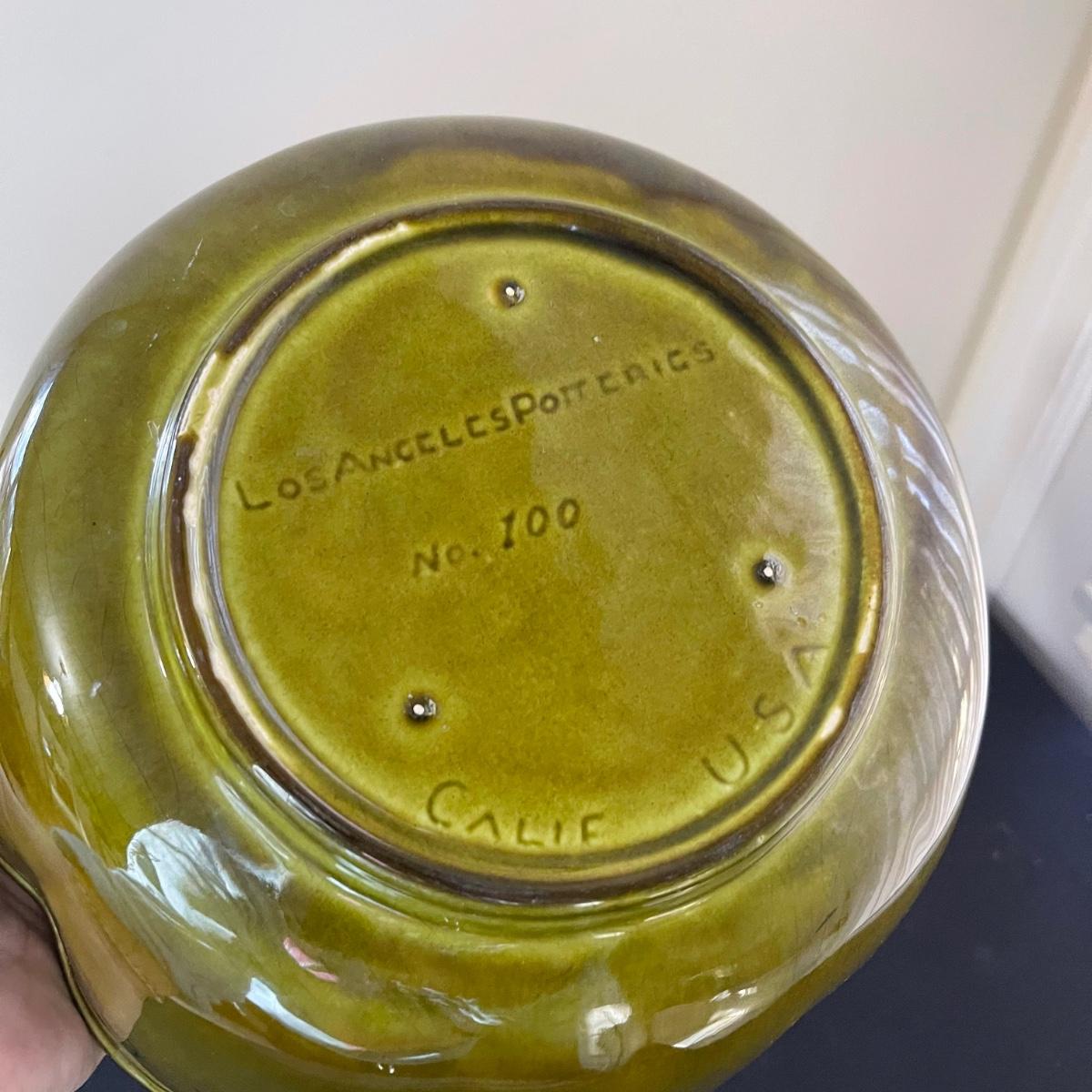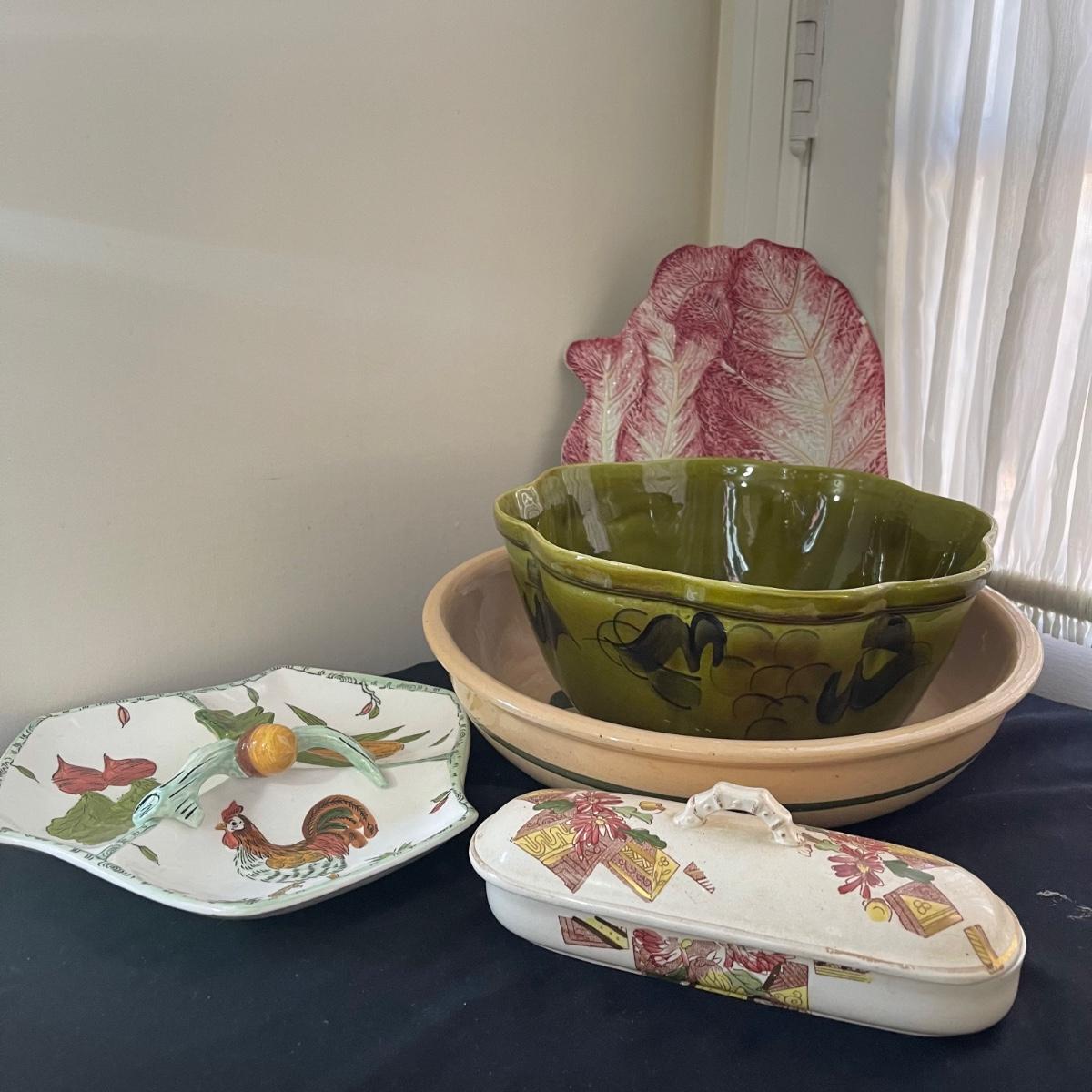 A large green serving bowl by Los Angeles Potteries, a large basin-style bowl with a cherry, a flat pink lettuce plate, a serving dish with three sections, and an Asian-inspired butter dish. All are ceramic.