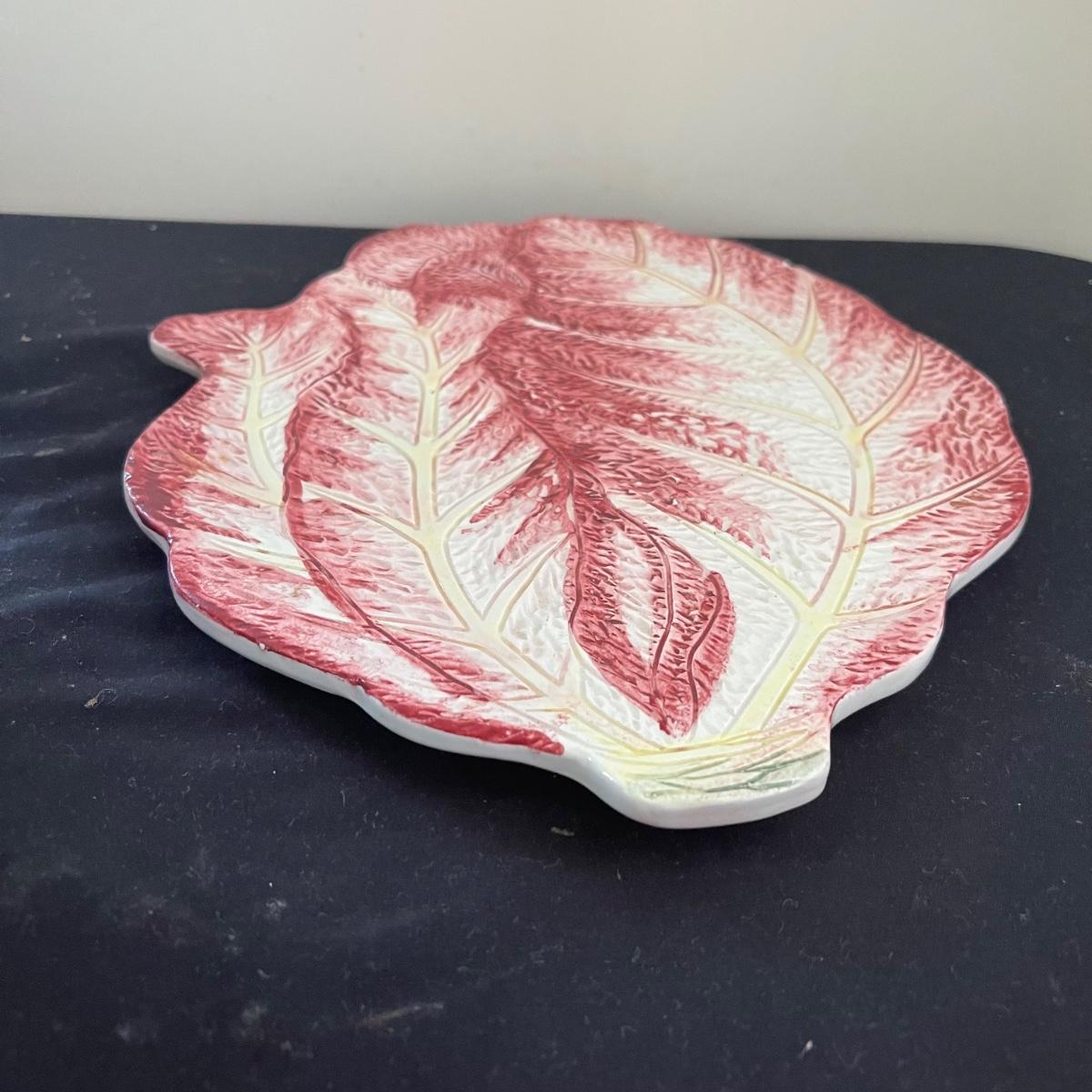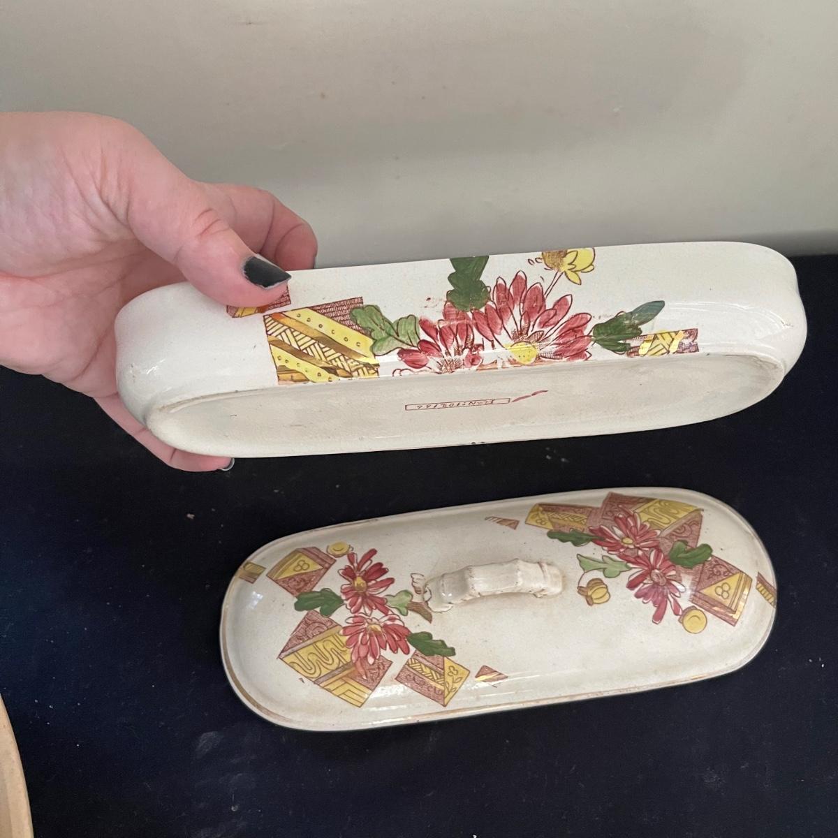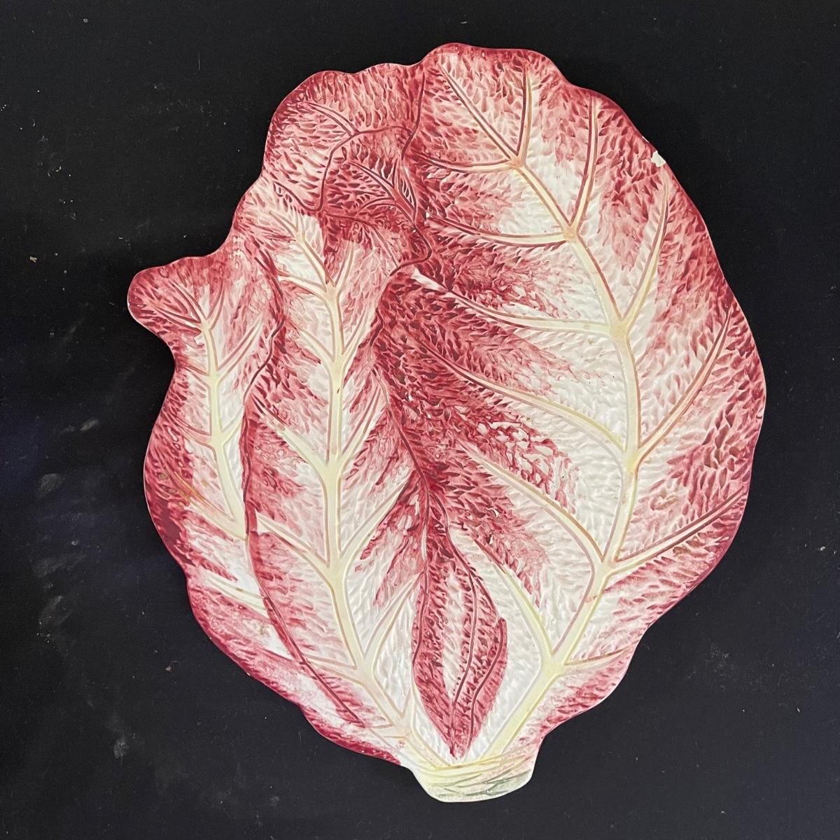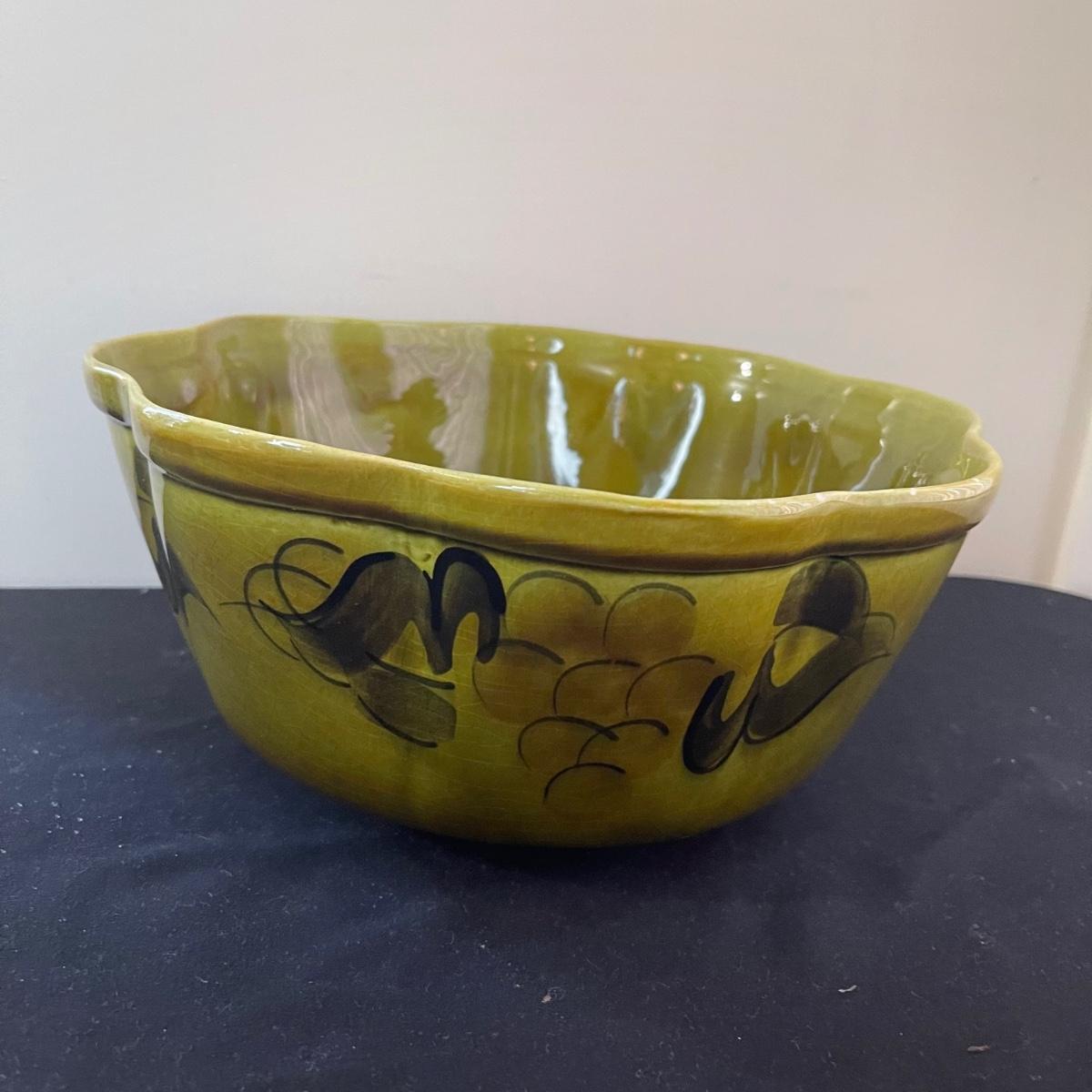 A large green serving bowl by Los Angeles Potteries, a large basin-style bowl with a cherry, a flat pink lettuce plate, a serving dish with three sections, and an Asian-inspired butter dish. All are ceramic.