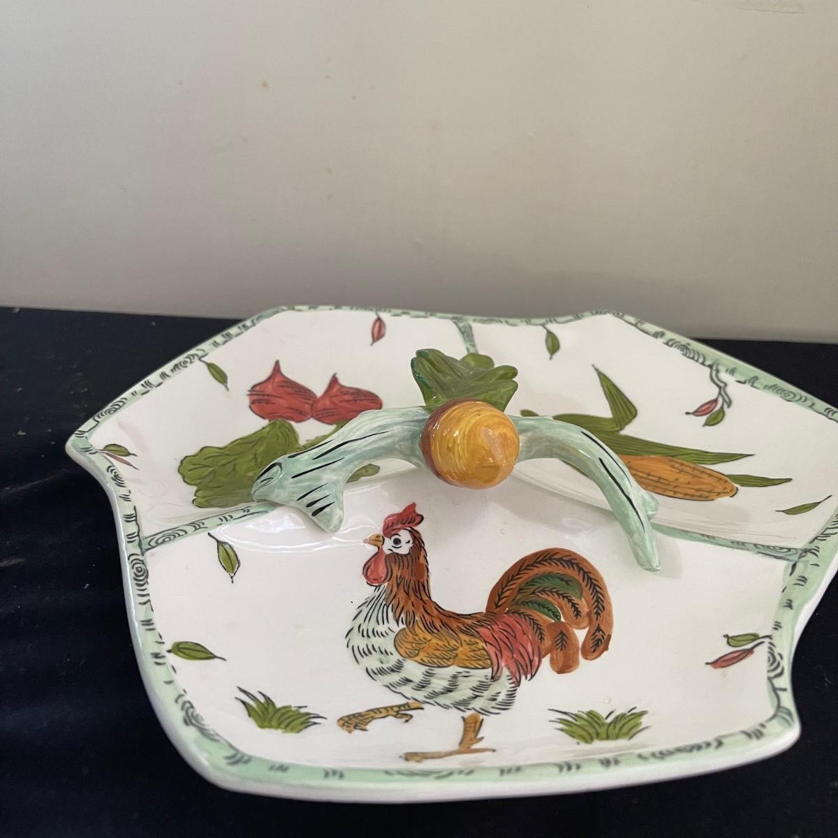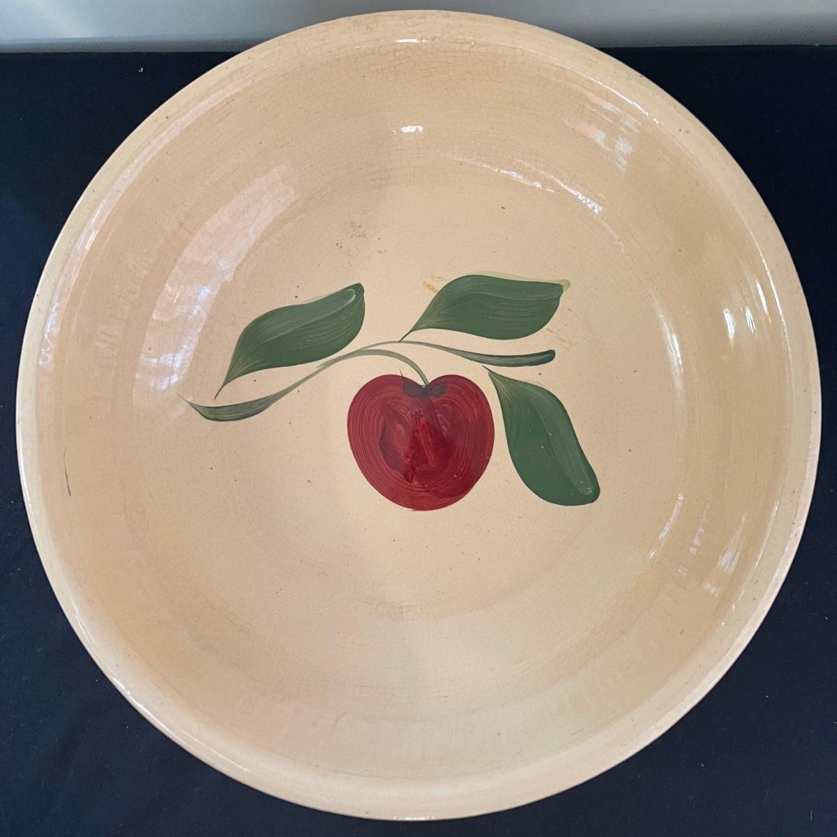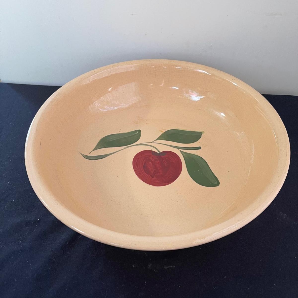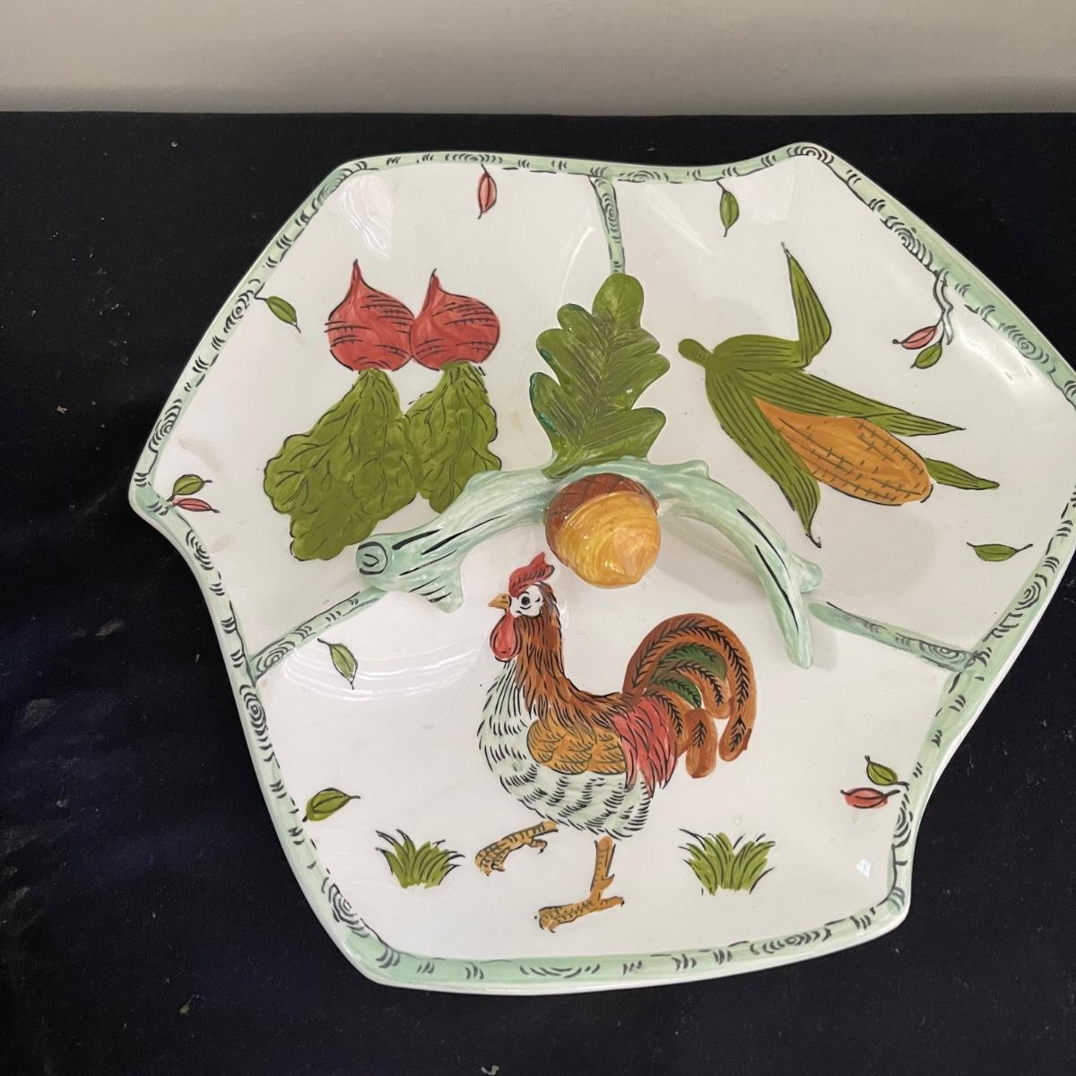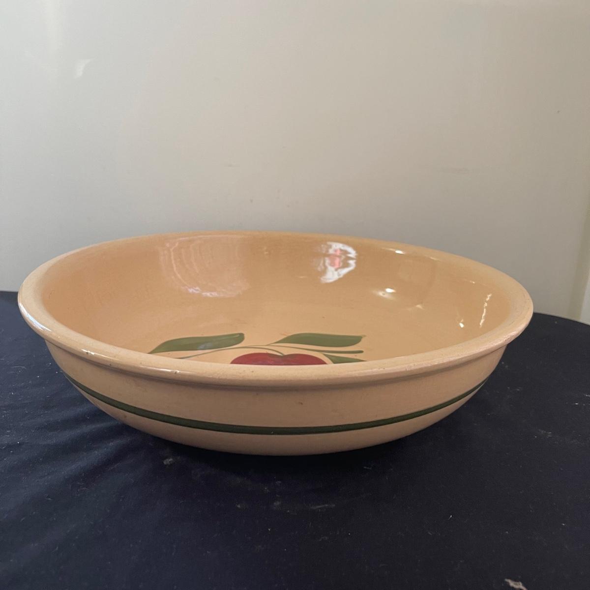 A large green serving bowl by Los Angeles Potteries, a large basin-style bowl with a cherry, a flat pink lettuce plate, a serving dish with three sections, and an Asian-inspired butter dish. All are ceramic.