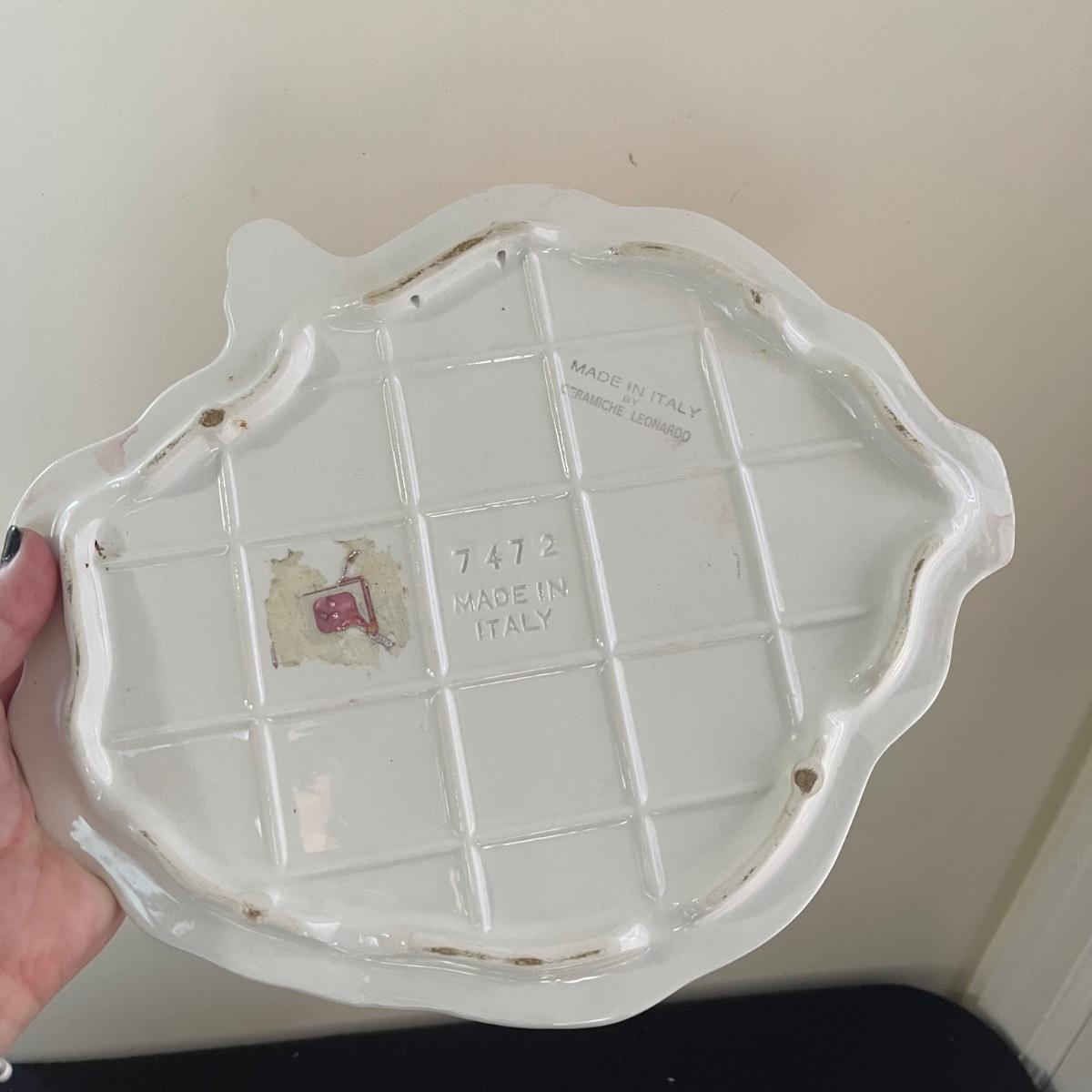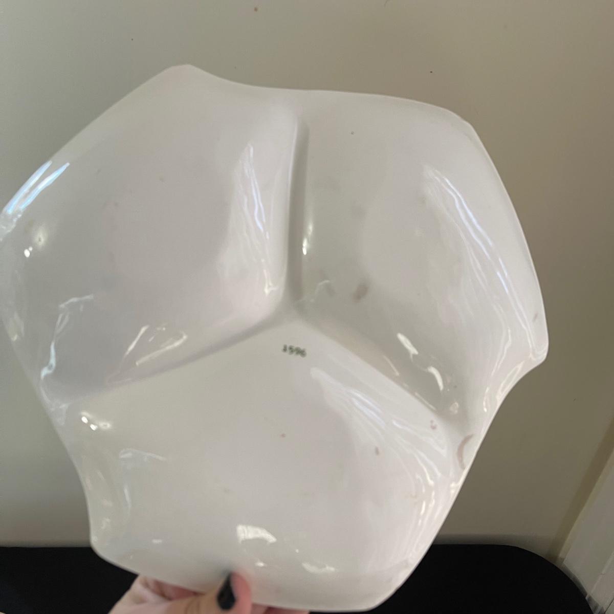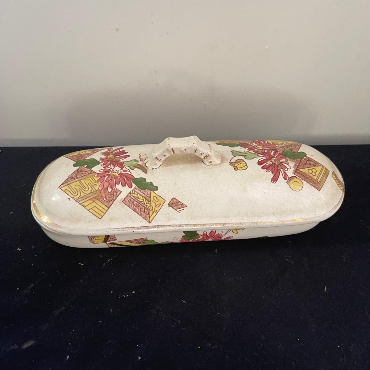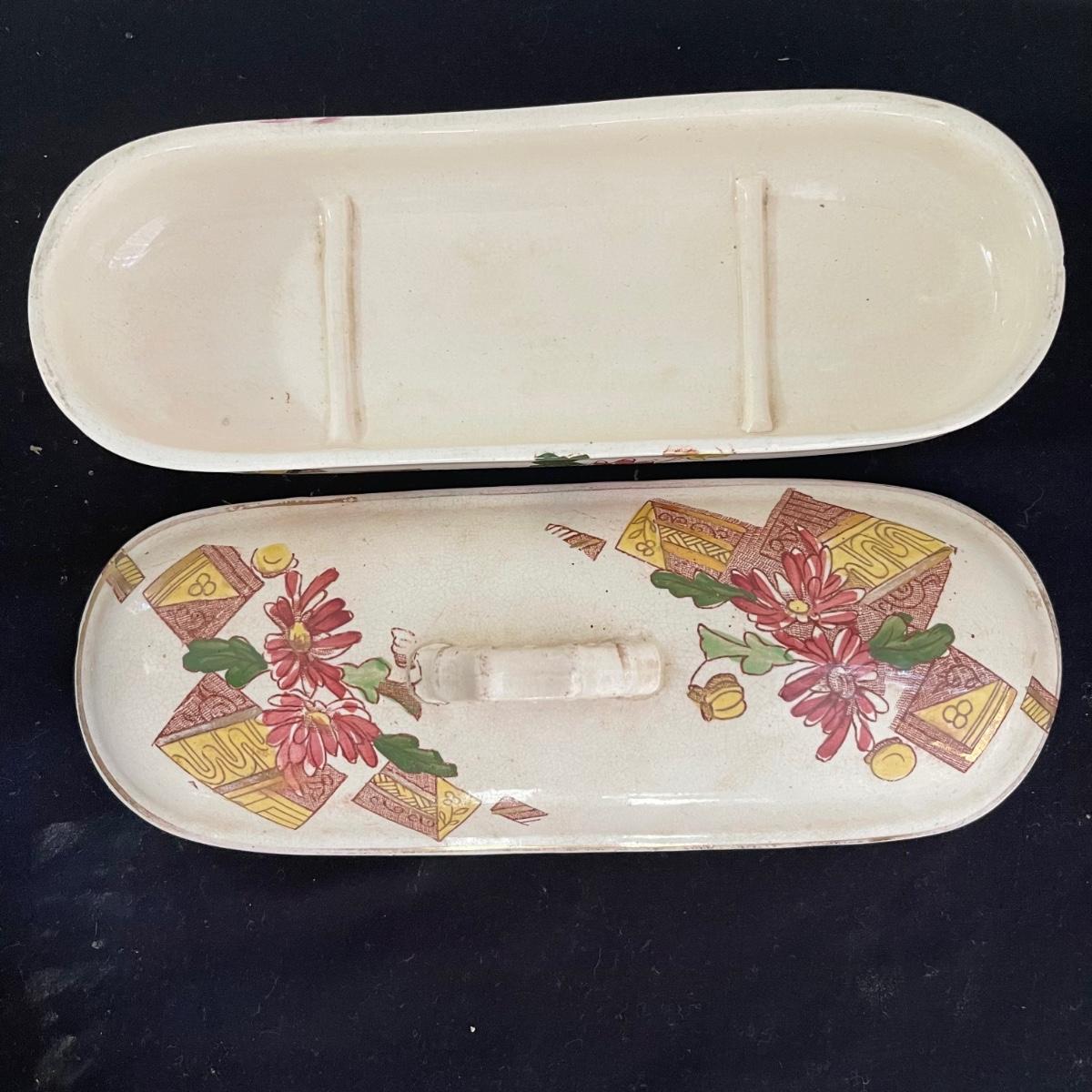 A large green serving bowl by Los Angeles Potteries, a large basin-style bowl with a cherry, a flat pink lettuce plate, a serving dish with three sections, and an Asian-inspired butter dish. All are ceramic.