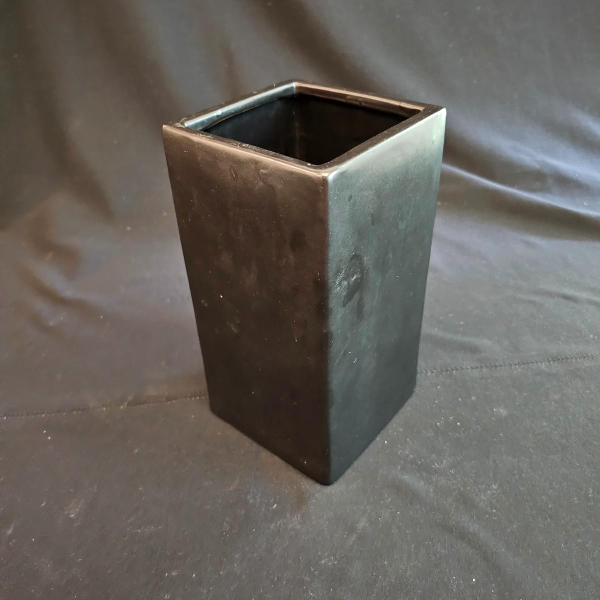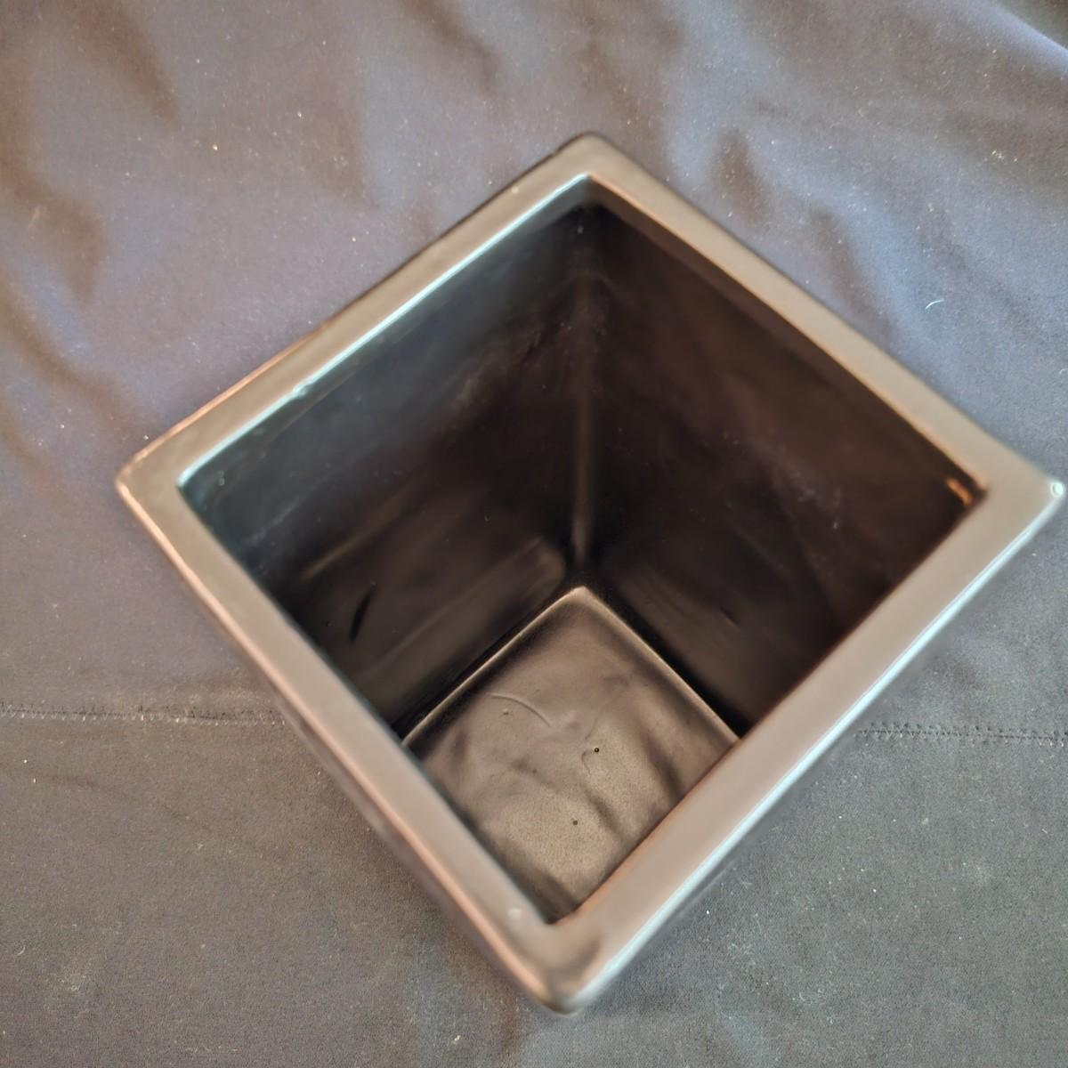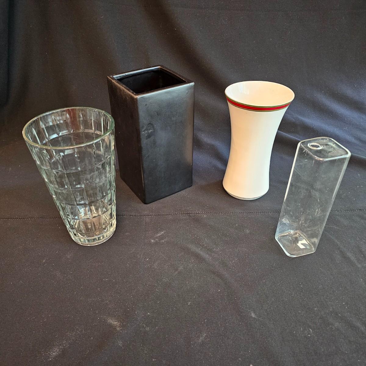 Four distinctly different vases for flowers or other. Tapered clear glass item is 5.5"D x 9"H, black square is 5.5"SQ x 9"H. White piece with ribbon top is Royal Doulton, measures 5"D x 9'H. See photos for details. Shipping available.