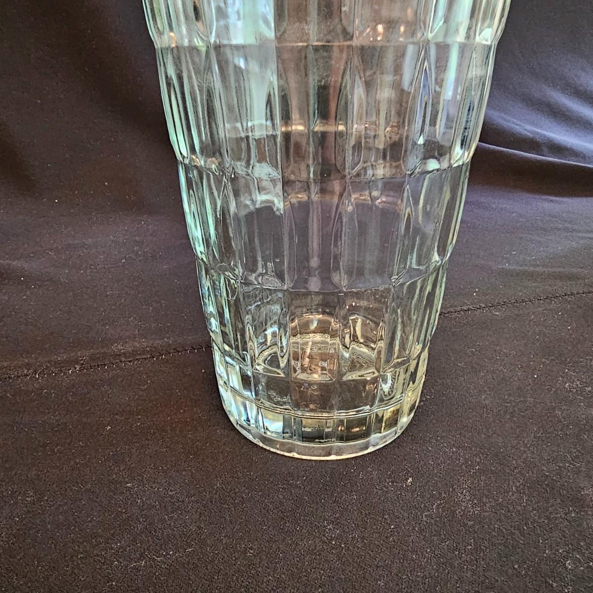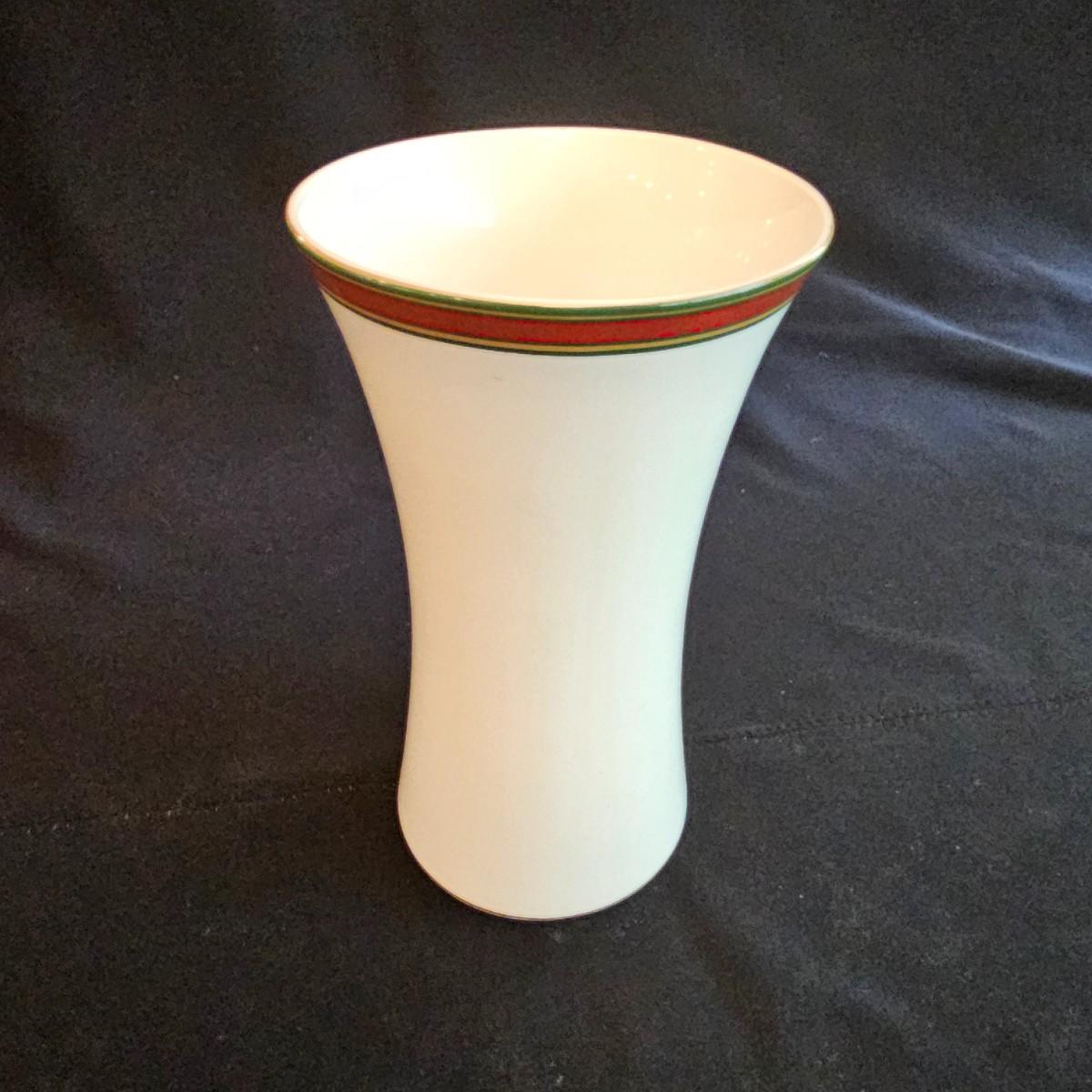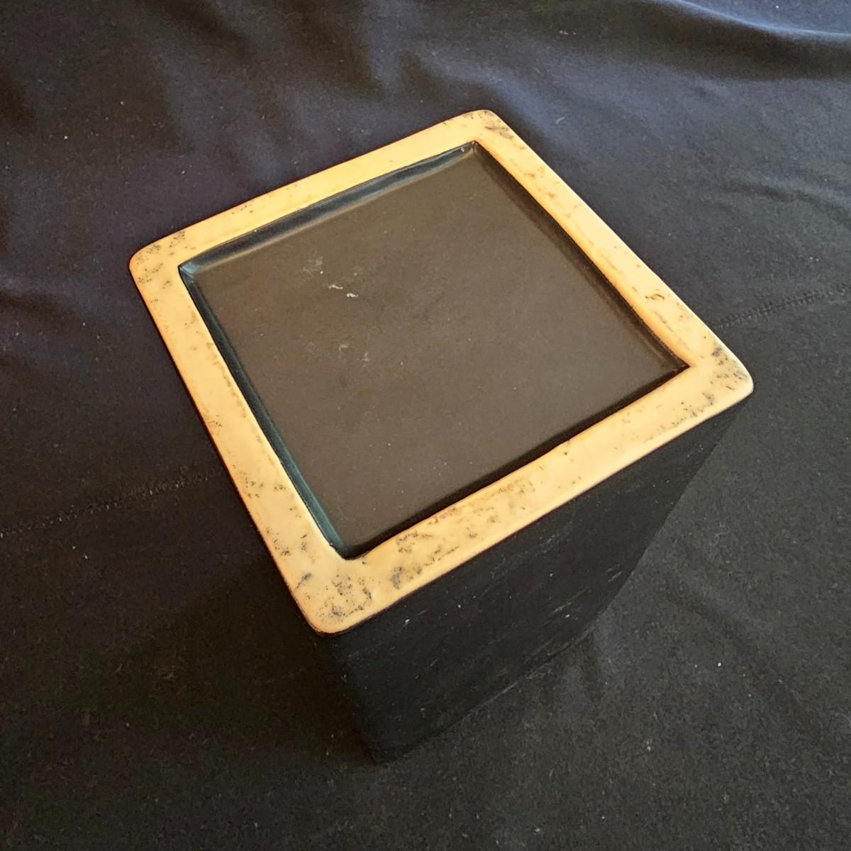 Four distinctly different vases for flowers or other. Tapered clear glass item is 5.5"D x 9"H, black square is 5.5"SQ x 9"H. White piece with ribbon top is Royal Doulton, measures 5"D x 9'H. See photos for details. Shipping available.