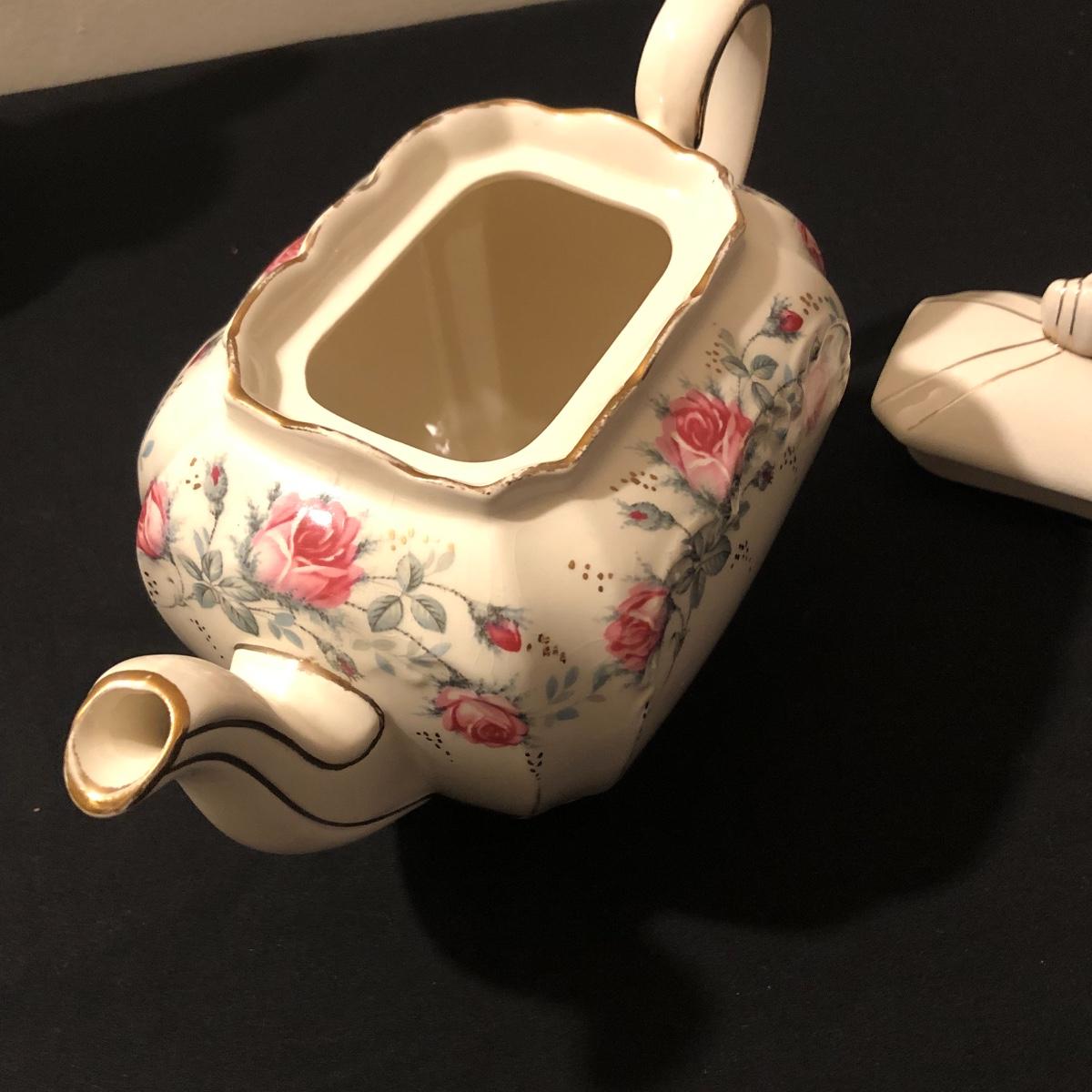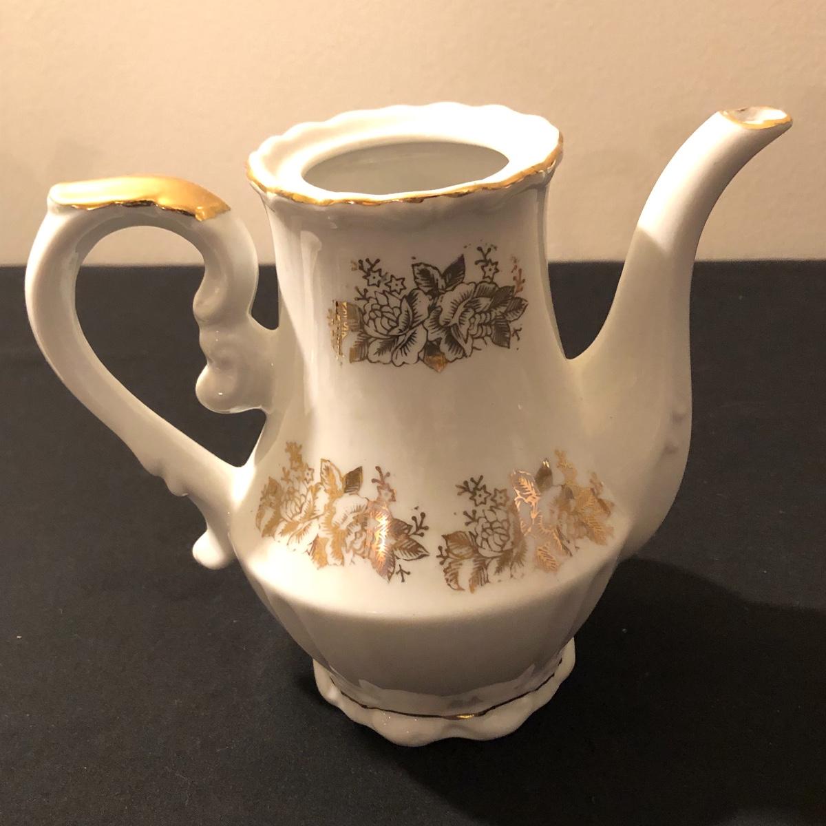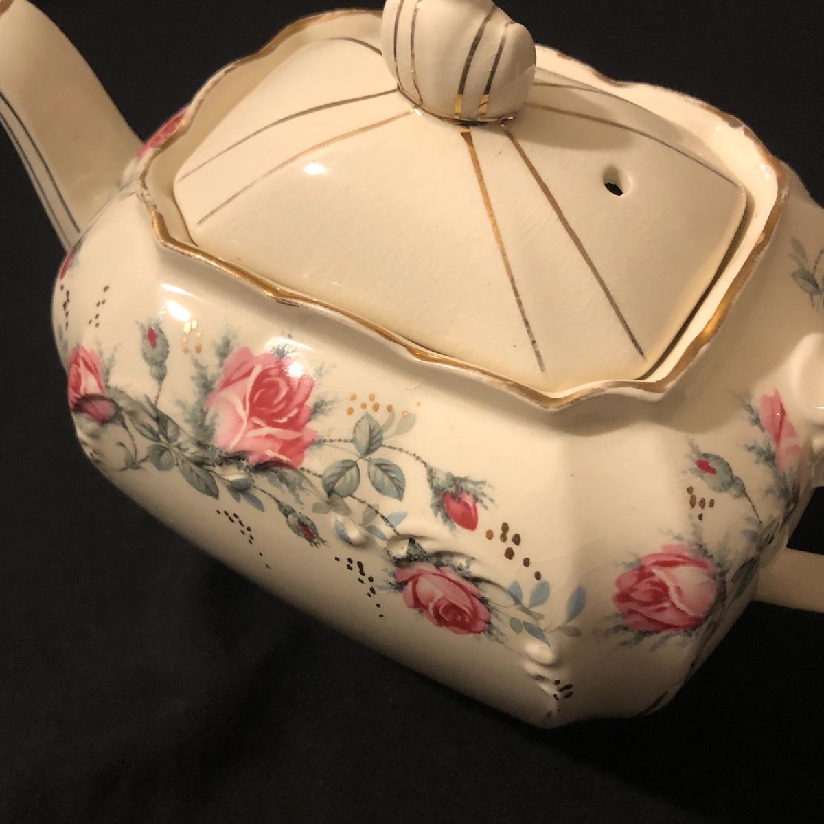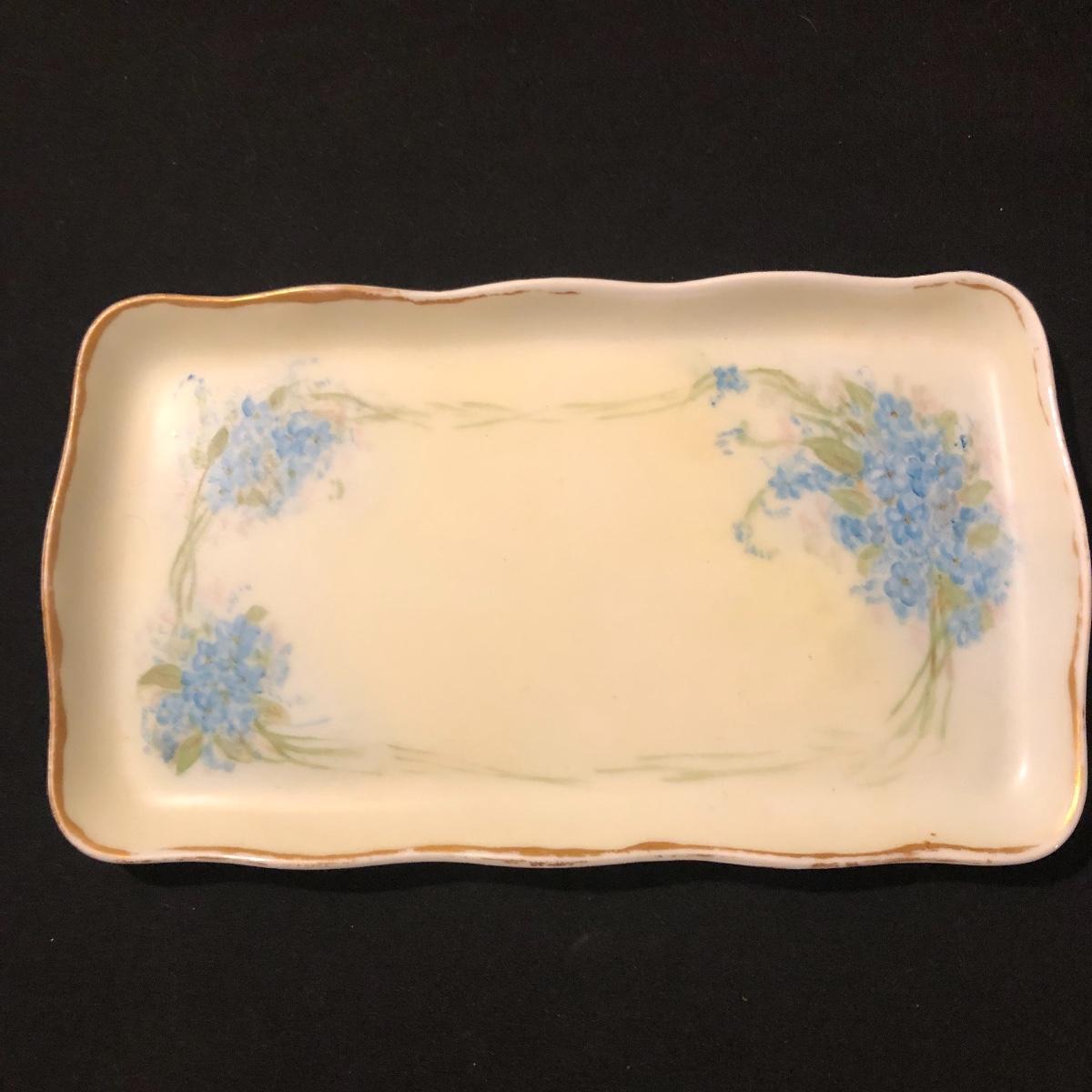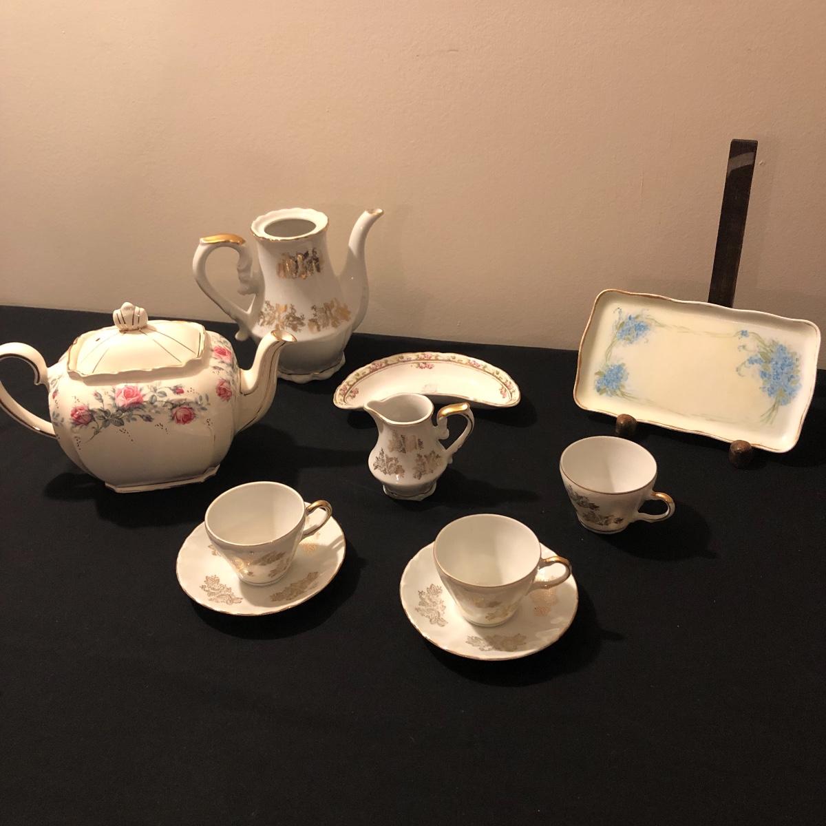 This lot includes three tea cups and two matching saucers, a creamer and teapot from Japan. Note the tea pot is missing its lid. The bone plate is marked “Dresden China.” The rectangle blue plate is from Germany and measures 7.5” x 4.5”. The rose tea pot is from England and measures 9.5” x 4.5” x 7”. Plate stands are not included. Shipping Available.