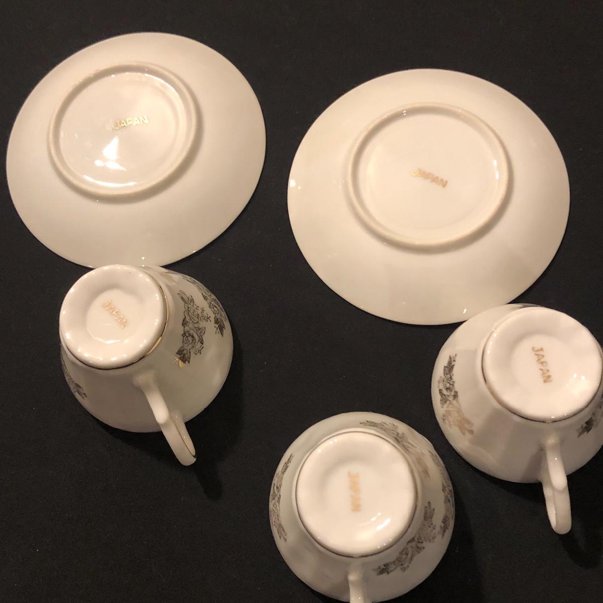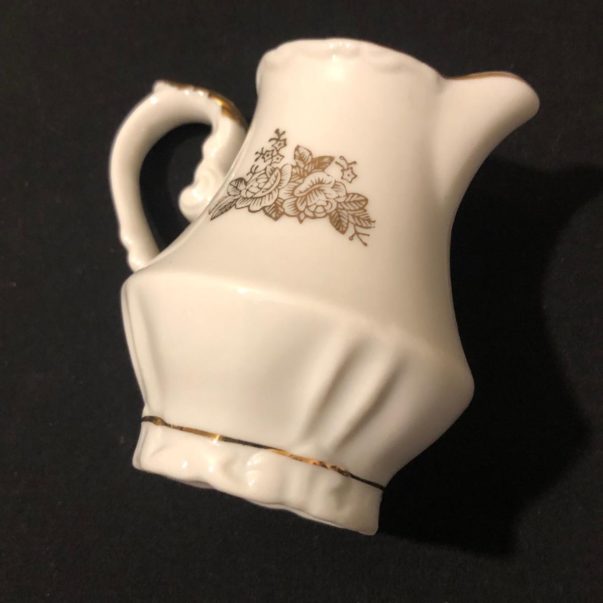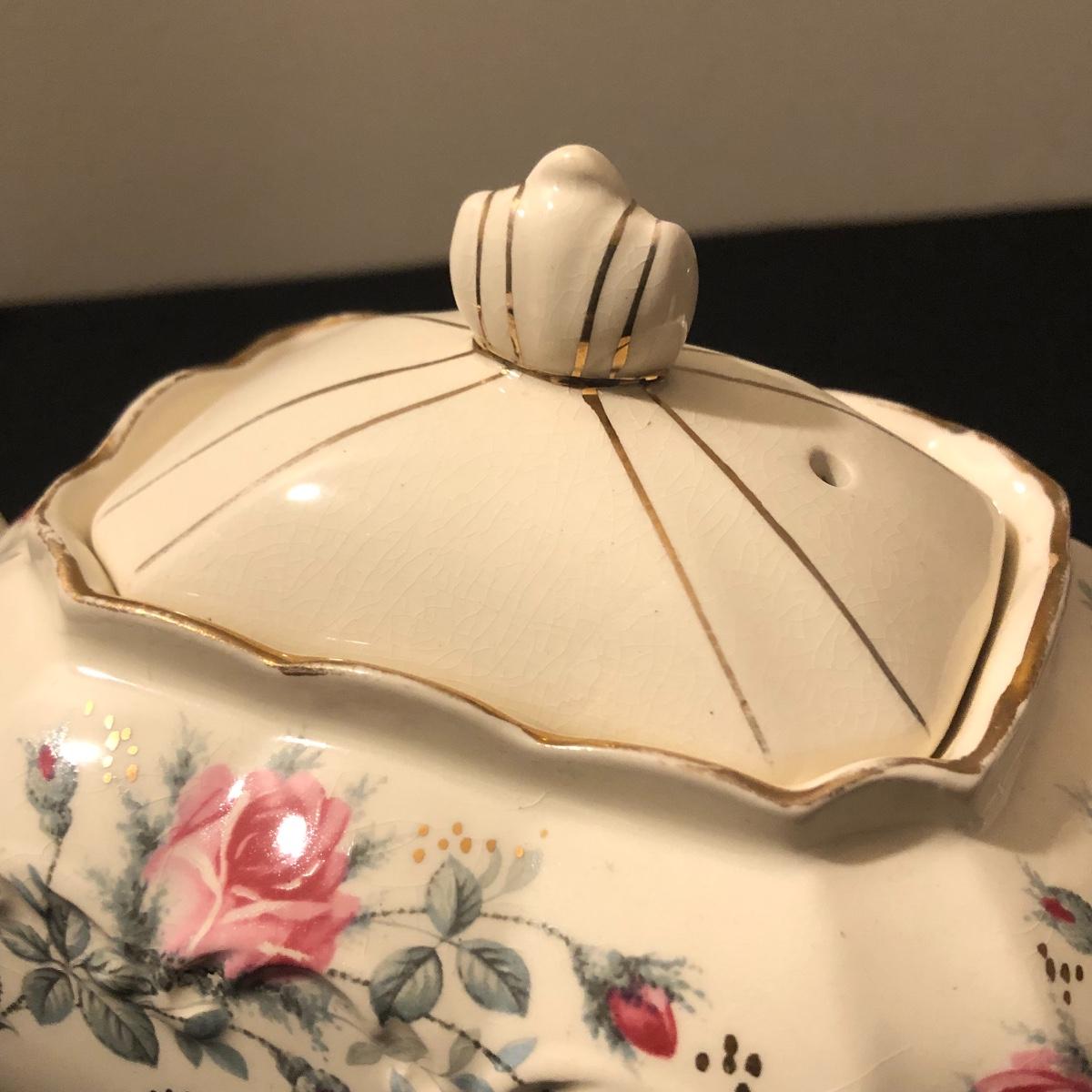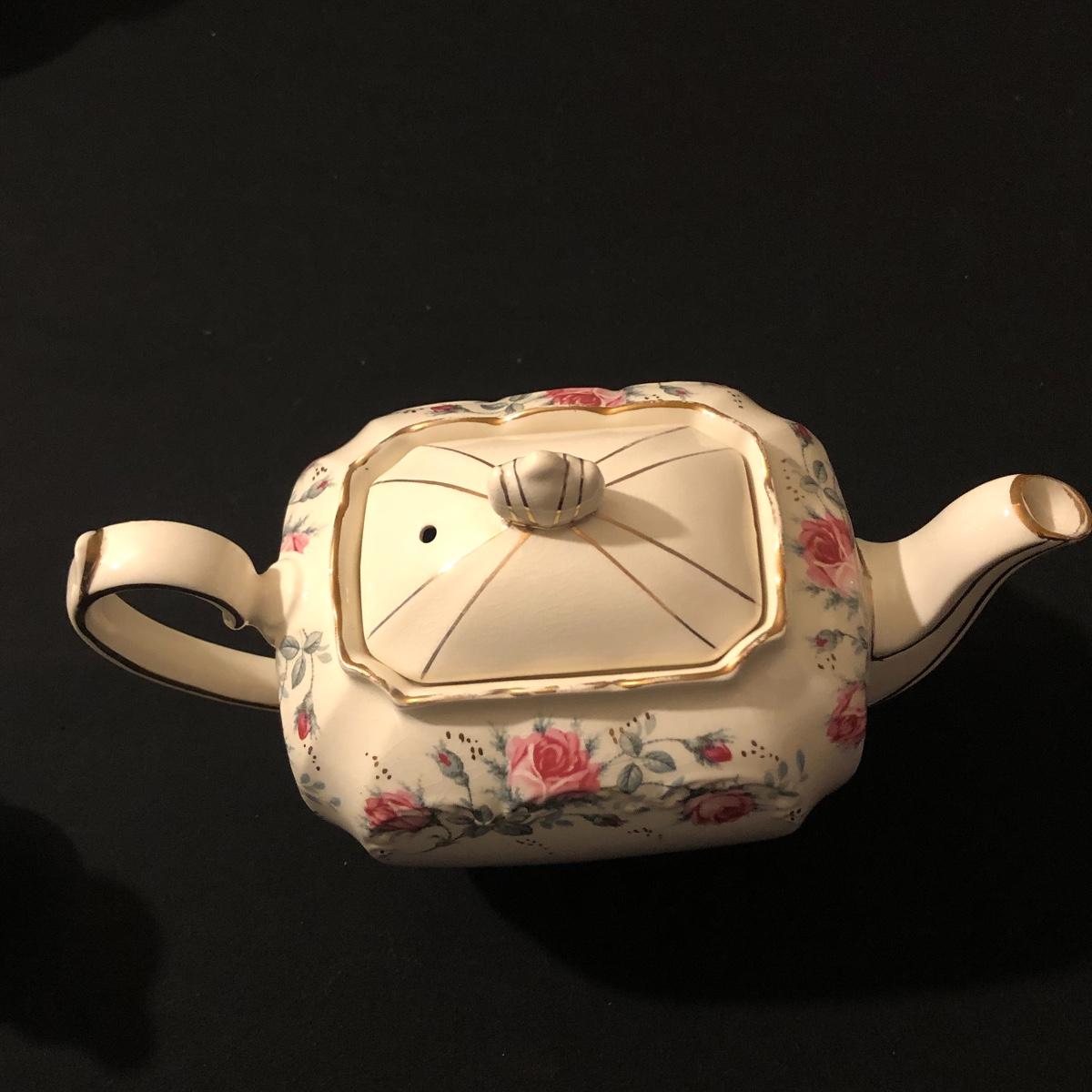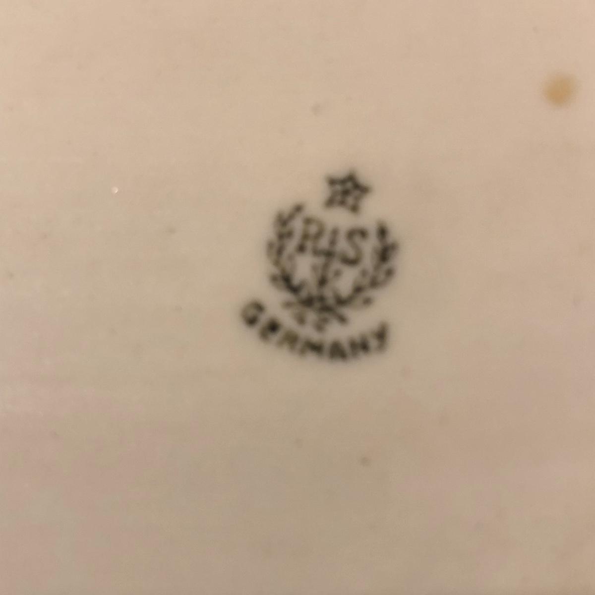 This lot includes three tea cups and two matching saucers, a creamer and teapot from Japan. Note the tea pot is missing its lid. The bone plate is marked “Dresden China.” The rectangle blue plate is from Germany and measures 7.5” x 4.5”. The rose tea pot is from England and measures 9.5” x 4.5” x 7”. Plate stands are not included. Shipping Available.