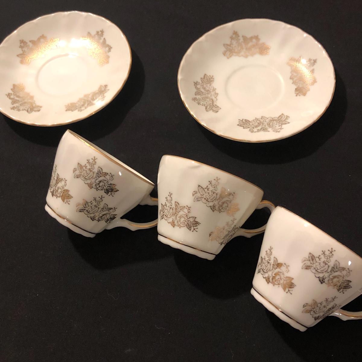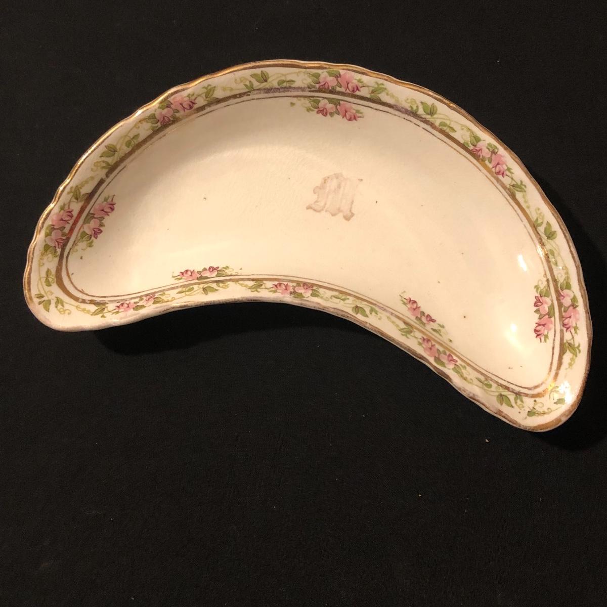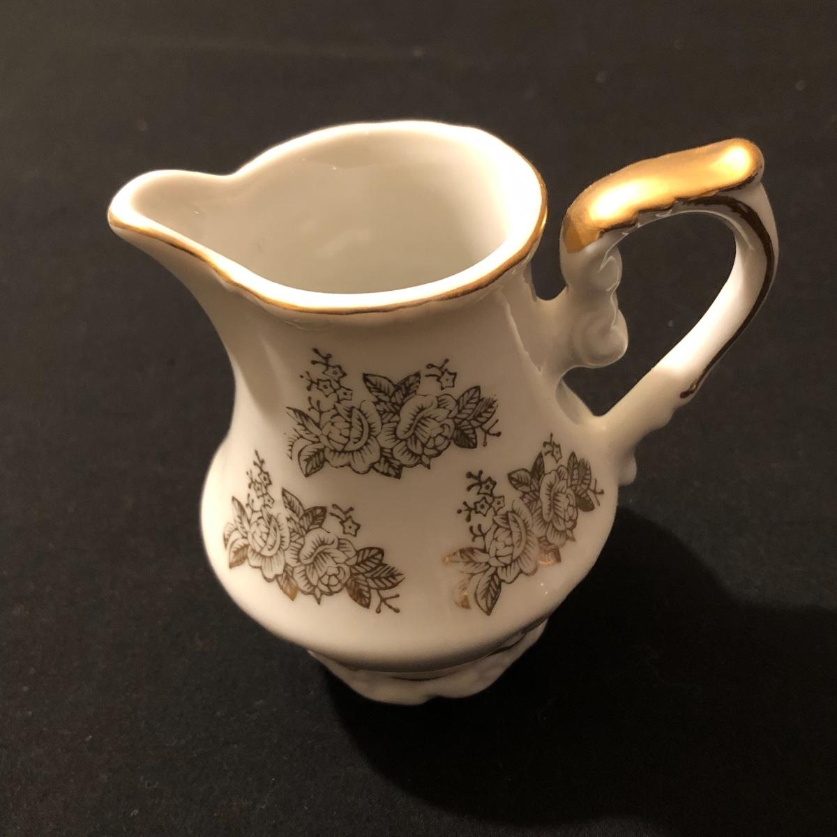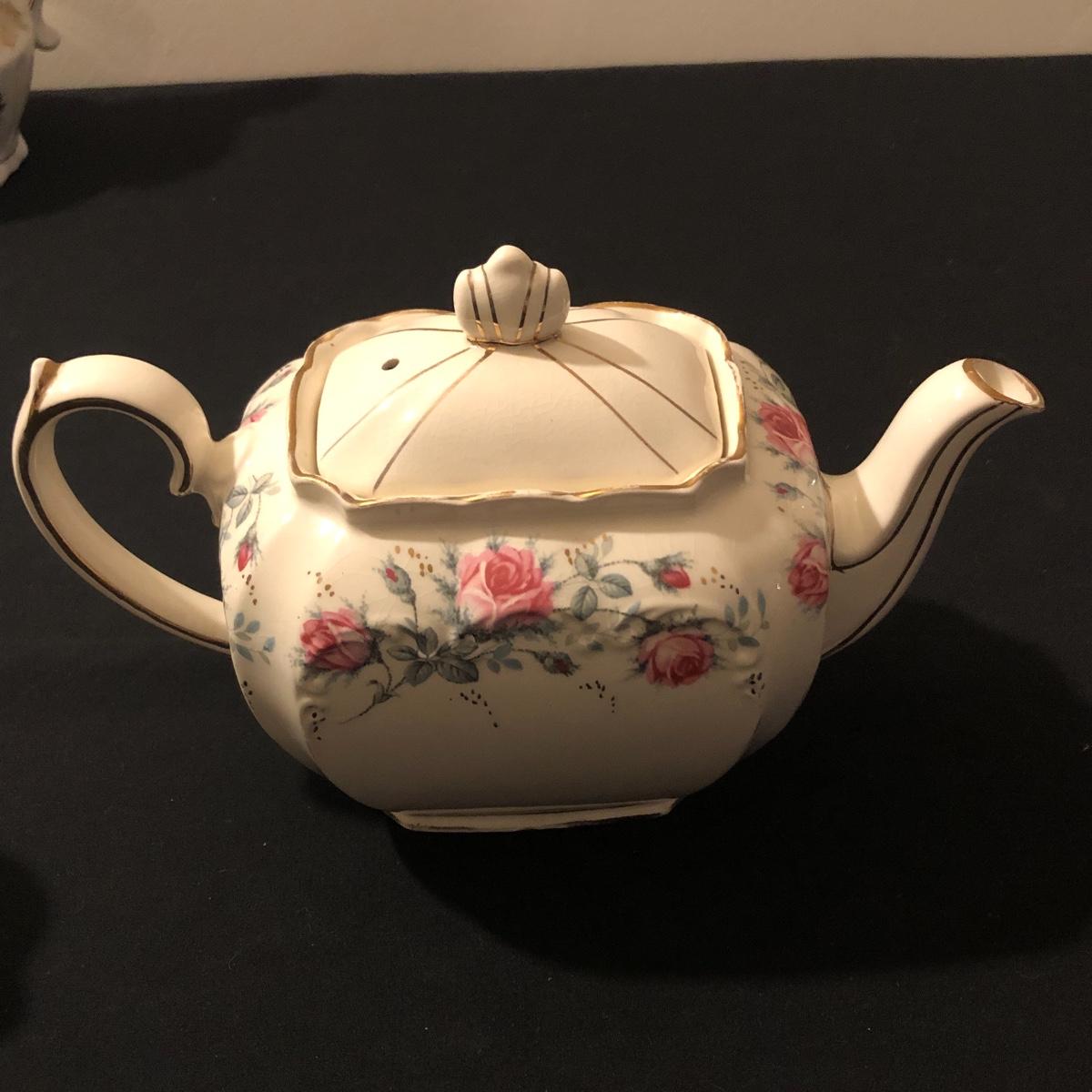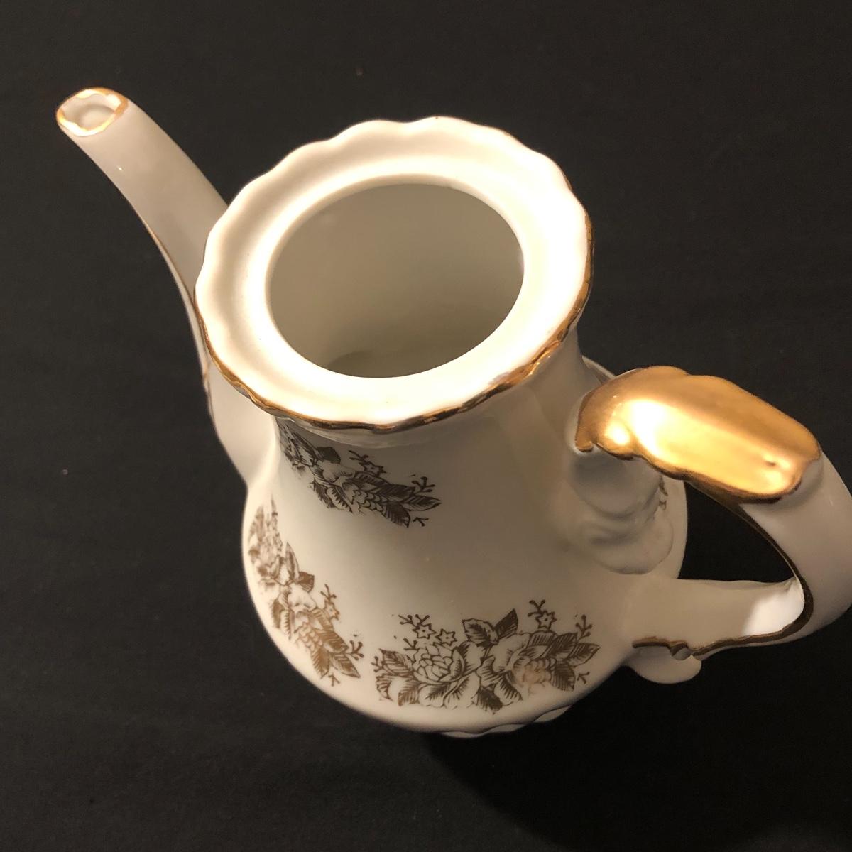 This lot includes three tea cups and two matching saucers, a creamer and teapot from Japan. Note the tea pot is missing its lid. The bone plate is marked “Dresden China.” The rectangle blue plate is from Germany and measures 7.5” x 4.5”. The rose tea pot is from England and measures 9.5” x 4.5” x 7”. Plate stands are not included. Shipping Available.