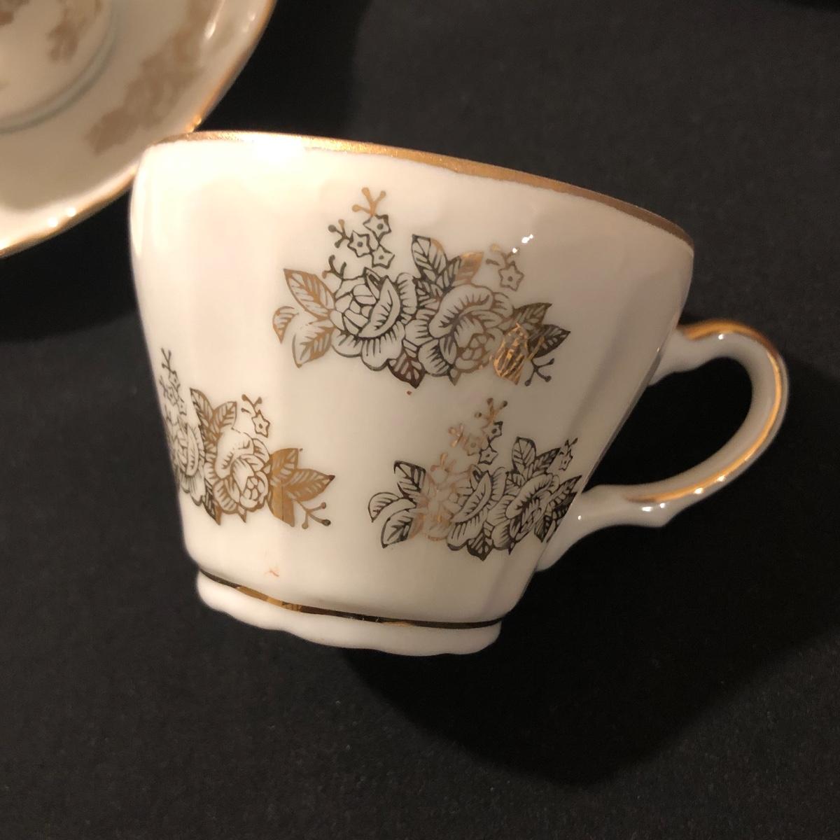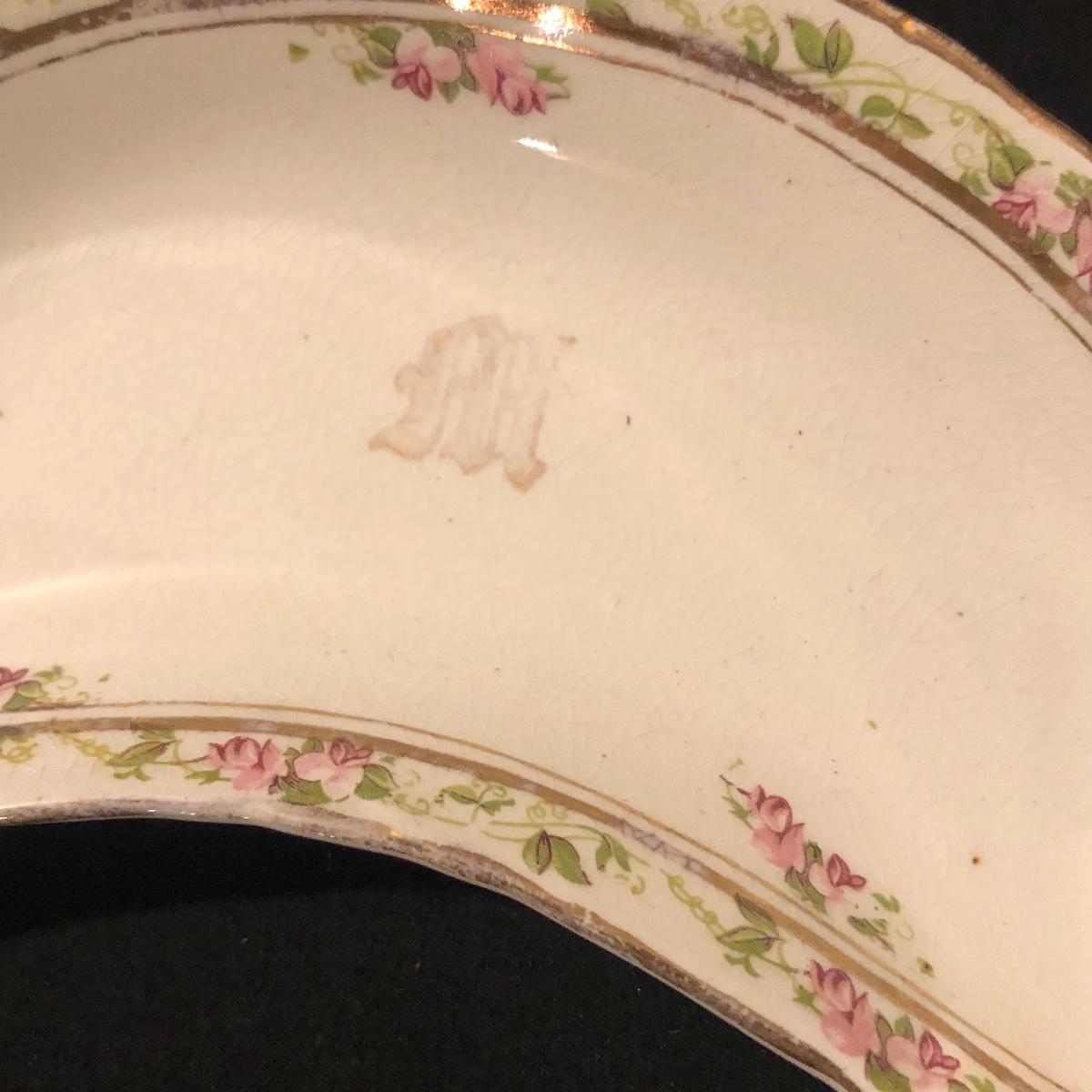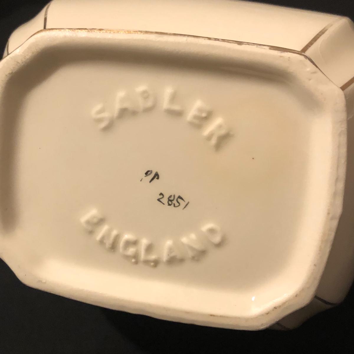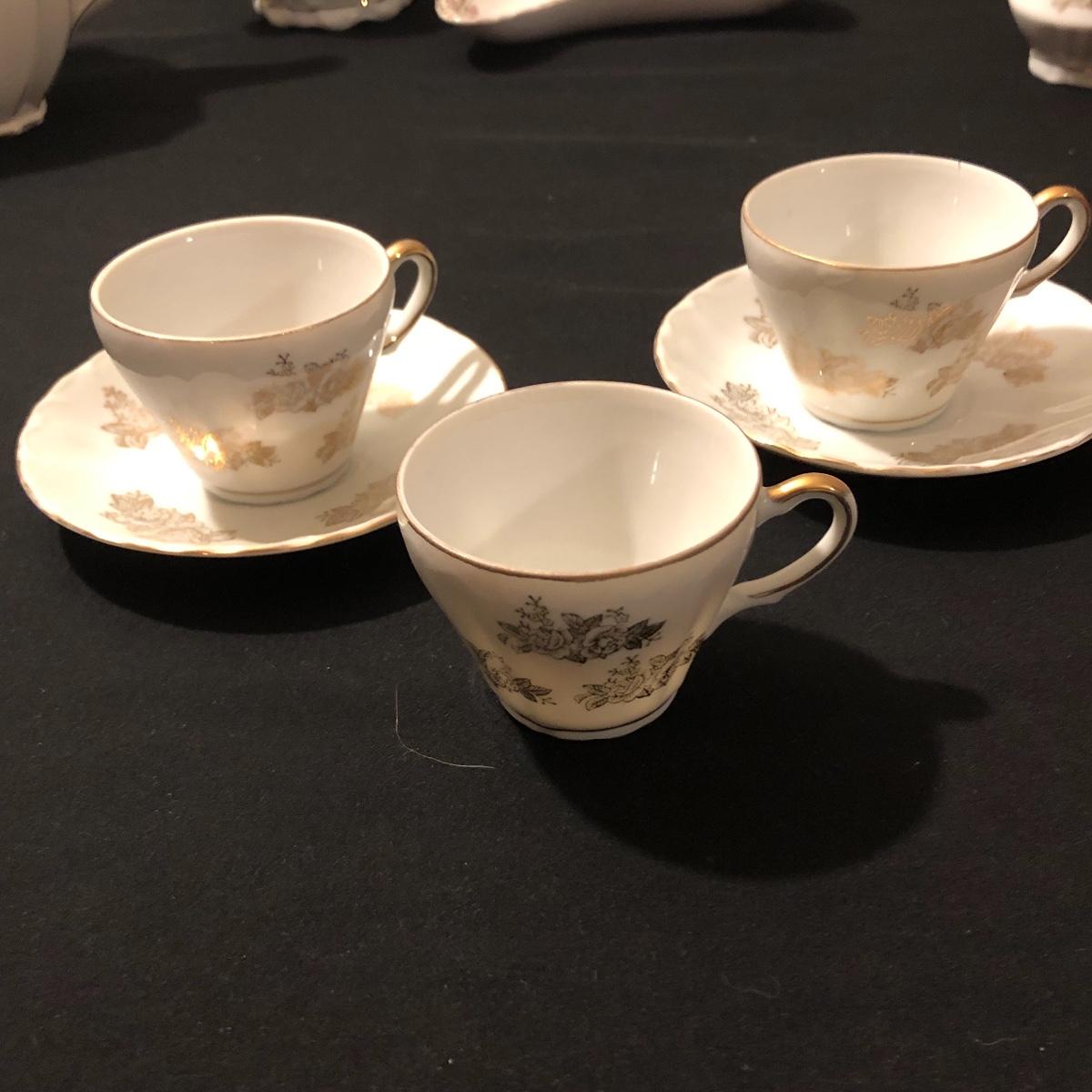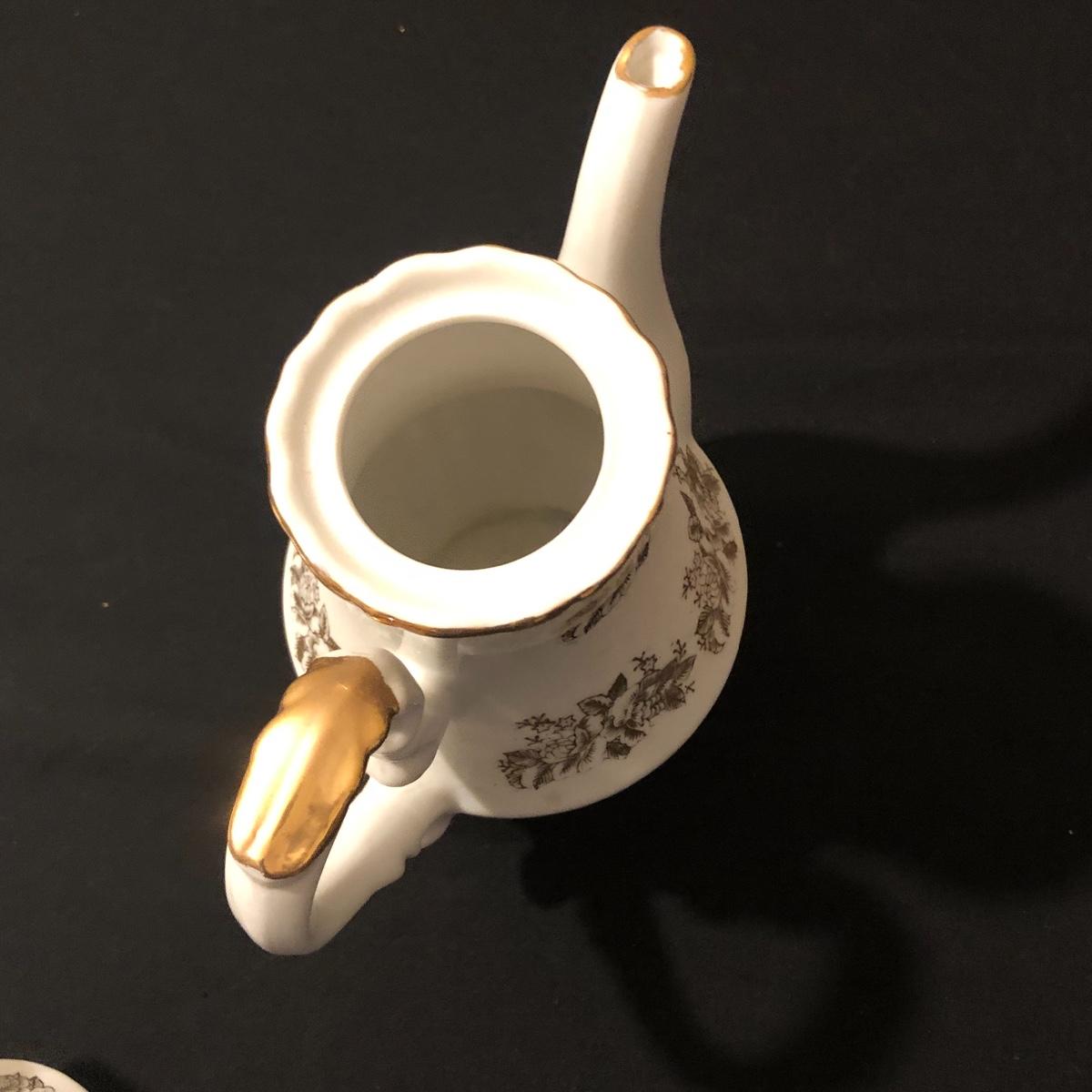 This lot includes three tea cups and two matching saucers, a creamer and teapot from Japan. Note the tea pot is missing its lid. The bone plate is marked “Dresden China.” The rectangle blue plate is from Germany and measures 7.5” x 4.5”. The rose tea pot is from England and measures 9.5” x 4.5” x 7”. Plate stands are not included. Shipping Available.