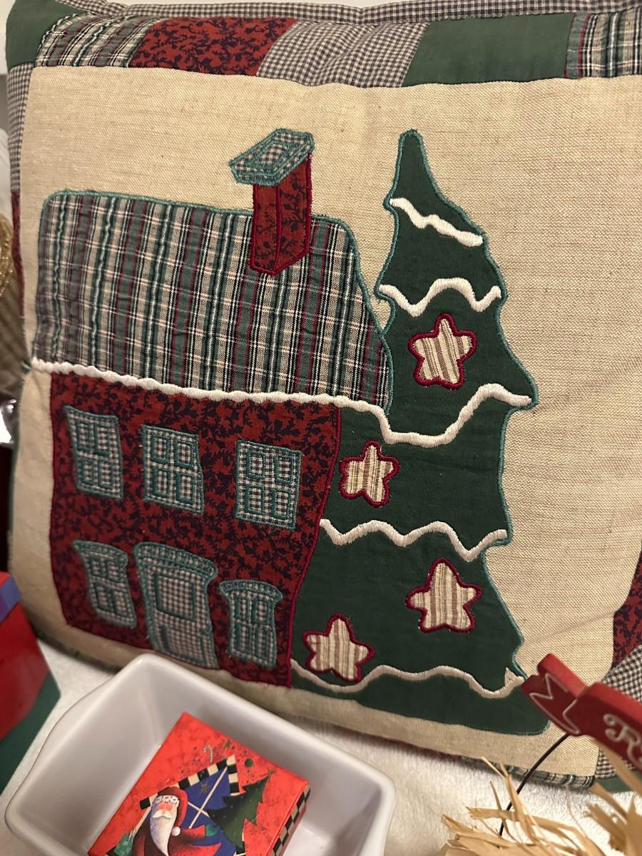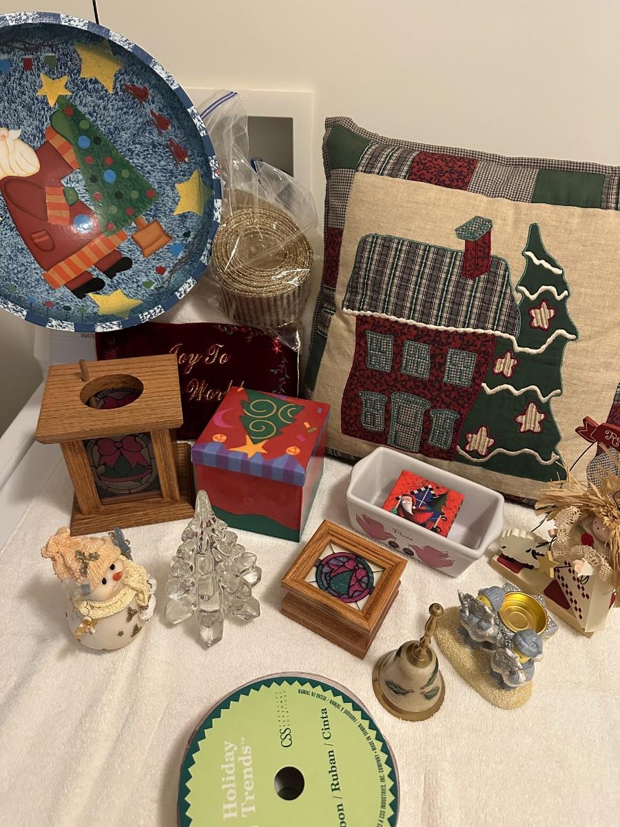 Assorted Christmas Decor & Red Tree Skirt- pillows, bowl, candleholders, etc.