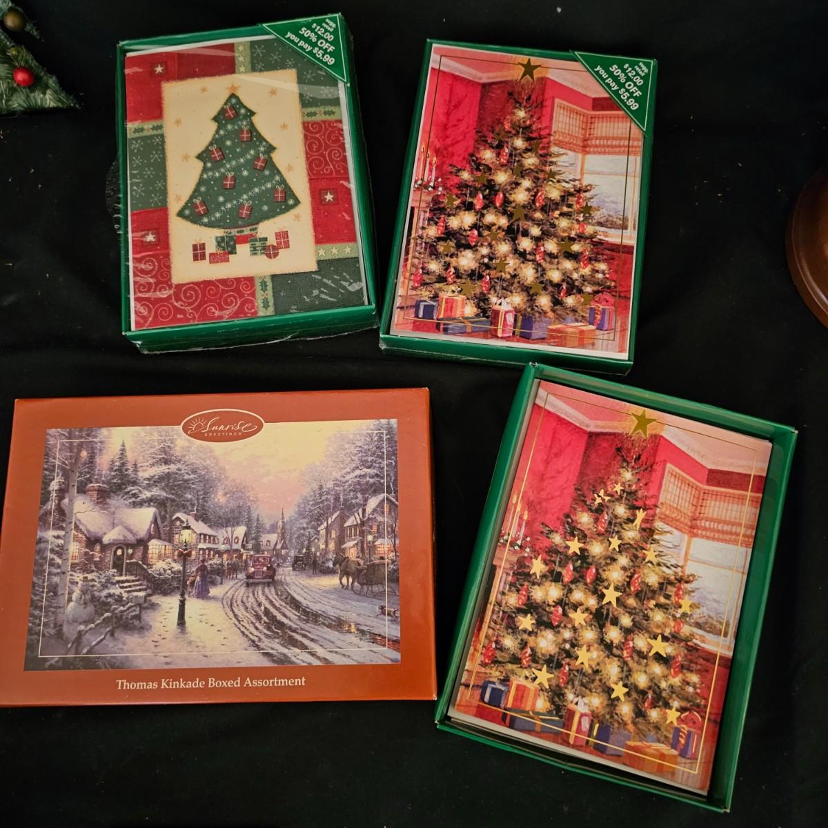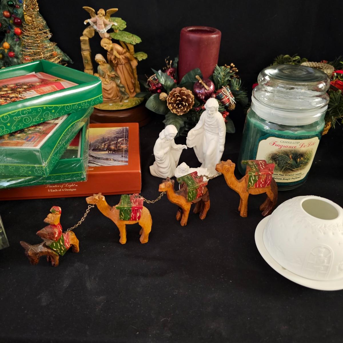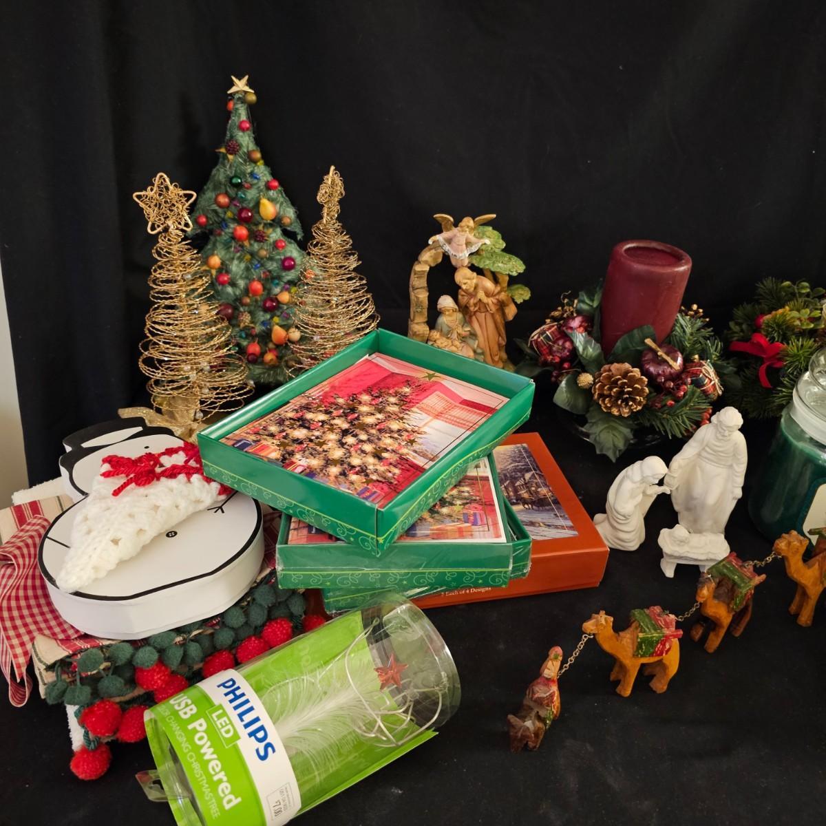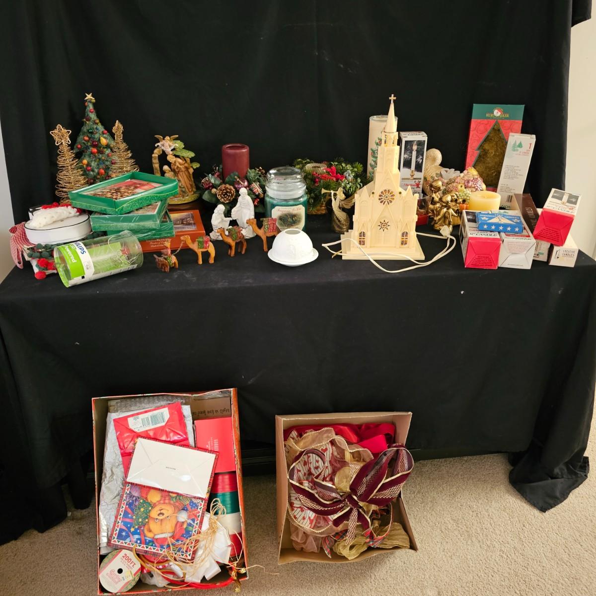 A varied collection of Christmas decor, wrap, ornaments and more. Boxed cards, candles, centerpieces, more. White church powered on when plugged in. Other lights not tested. Includes one fall cornucopia piece, the rest are Christmas. One Limoges porcelain igloo candle holder, one set Goebel nativity figures. See photos for details. Shipping available.