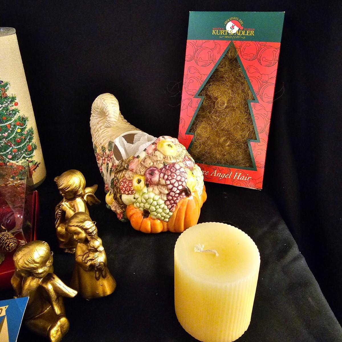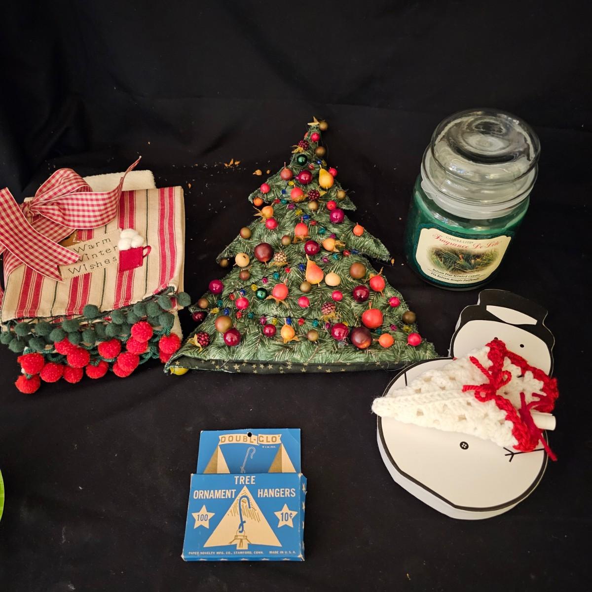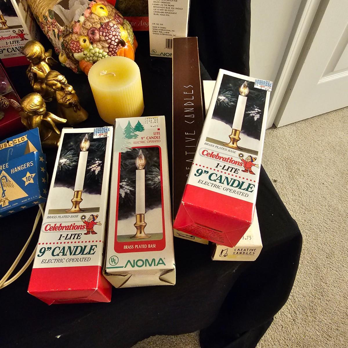 A varied collection of Christmas decor, wrap, ornaments and more. Boxed cards, candles, centerpieces, more. White church powered on when plugged in. Other lights not tested. Includes one fall cornucopia piece, the rest are Christmas. One Limoges porcelain igloo candle holder, one set Goebel nativity figures. See photos for details. Shipping available.