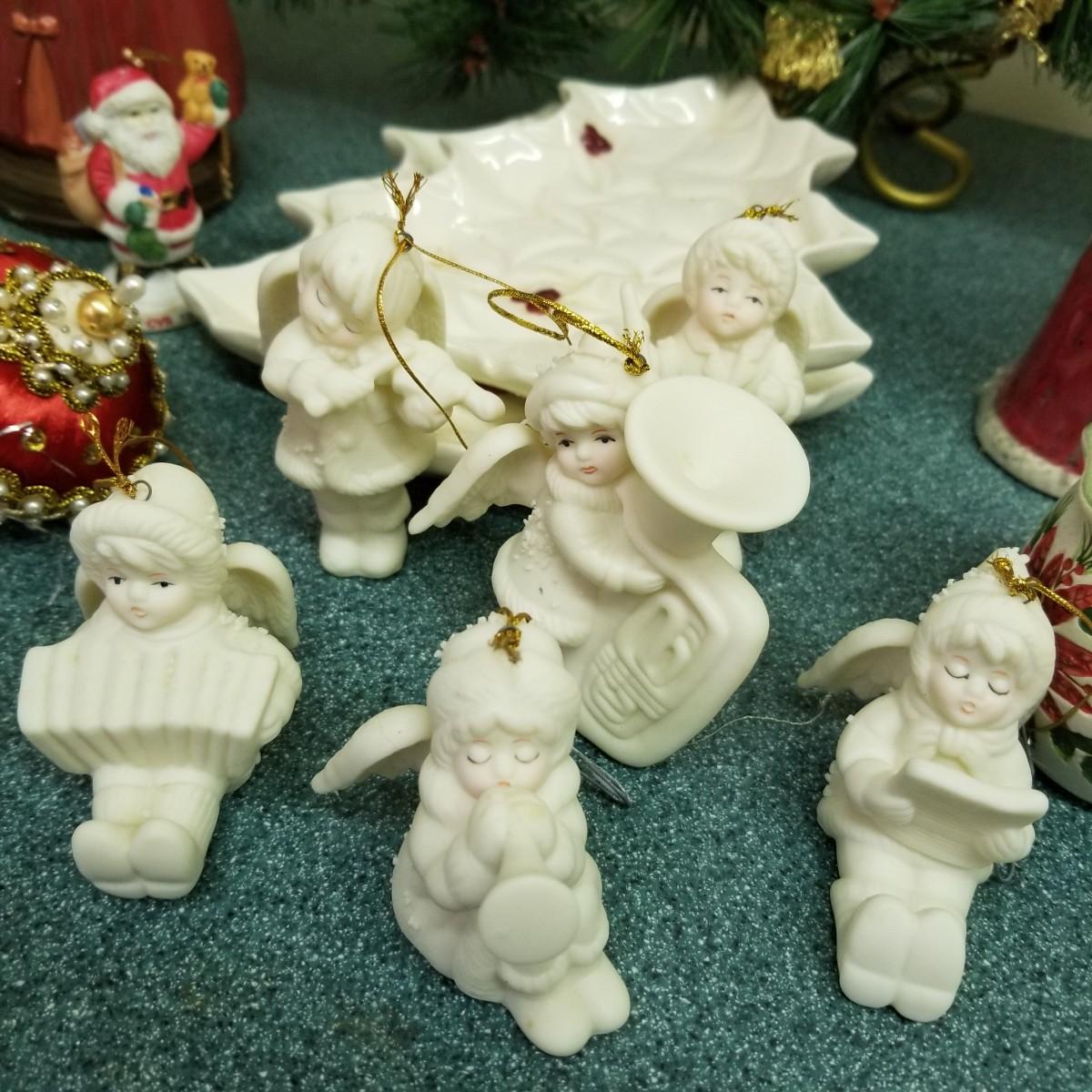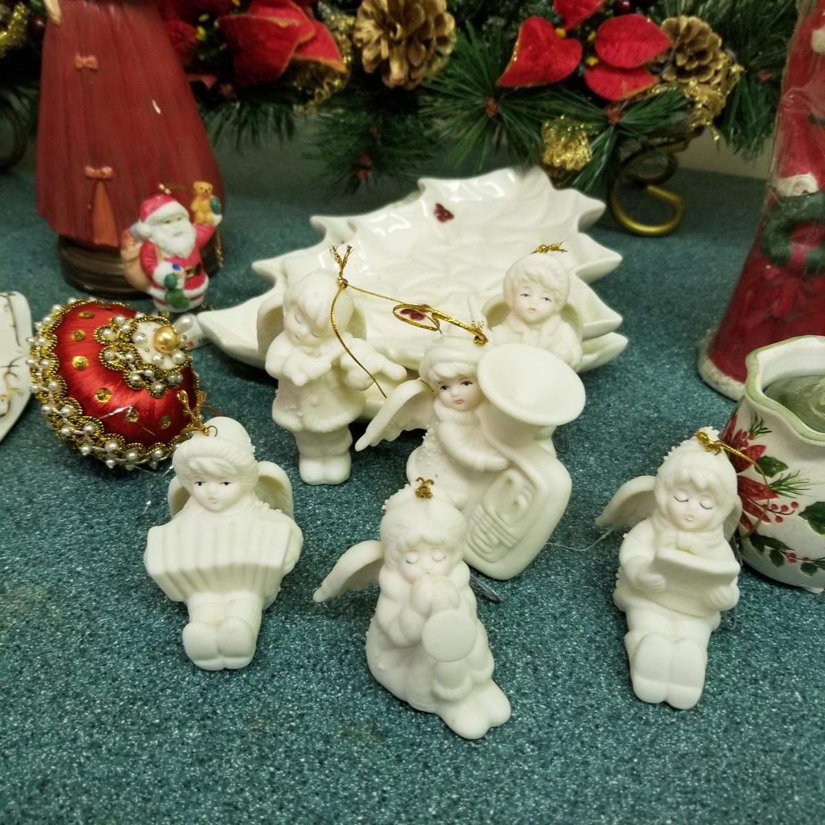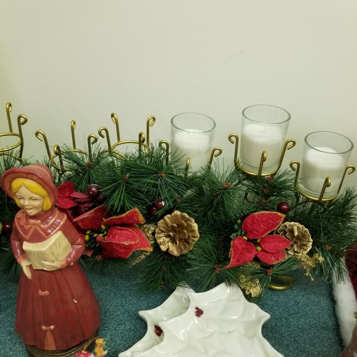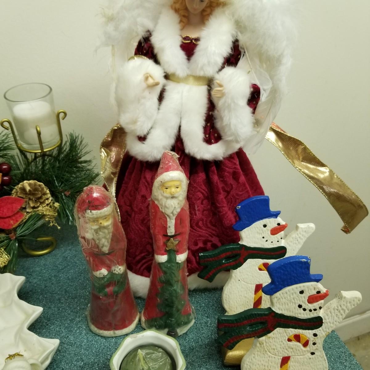 A small collection of joyful Christmas decorations. Two tree stands, 16" and 14", playful angel musician statuettes, a Mrs. Claus tree topper. Also includes two Grandeur Noel pieces, Santa and his sleigh. Trays, stocking hangers, three Currier & Ives plates that are7”D and more. Joyful lighted snowman is 17" high. Longer candle stand is missing some candle holders. See photos for details. Shipping available.