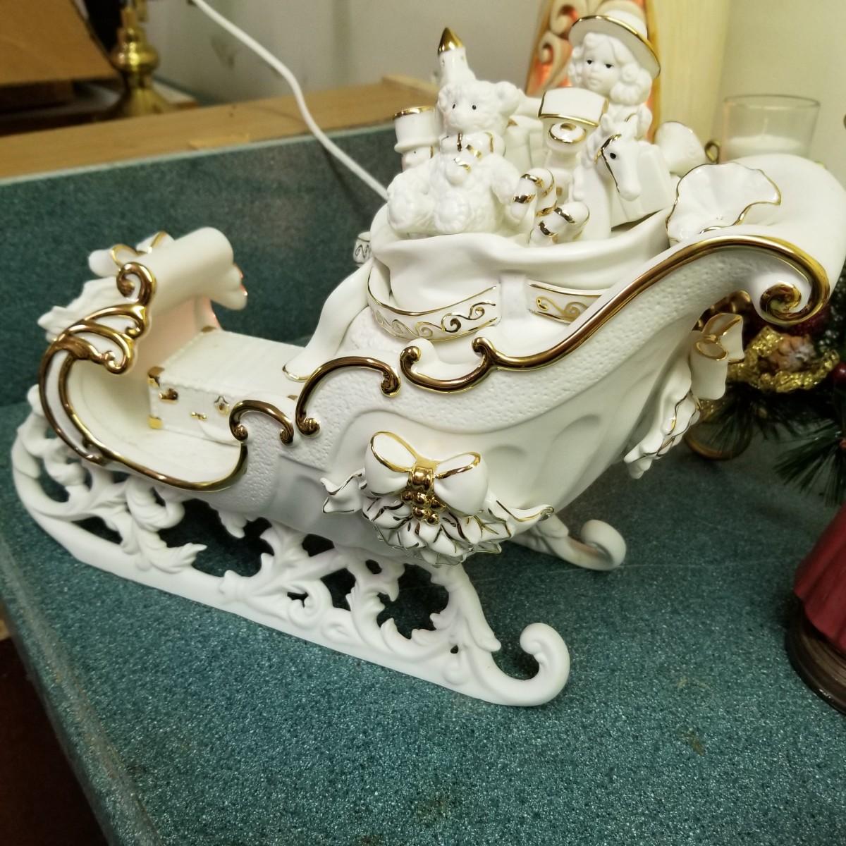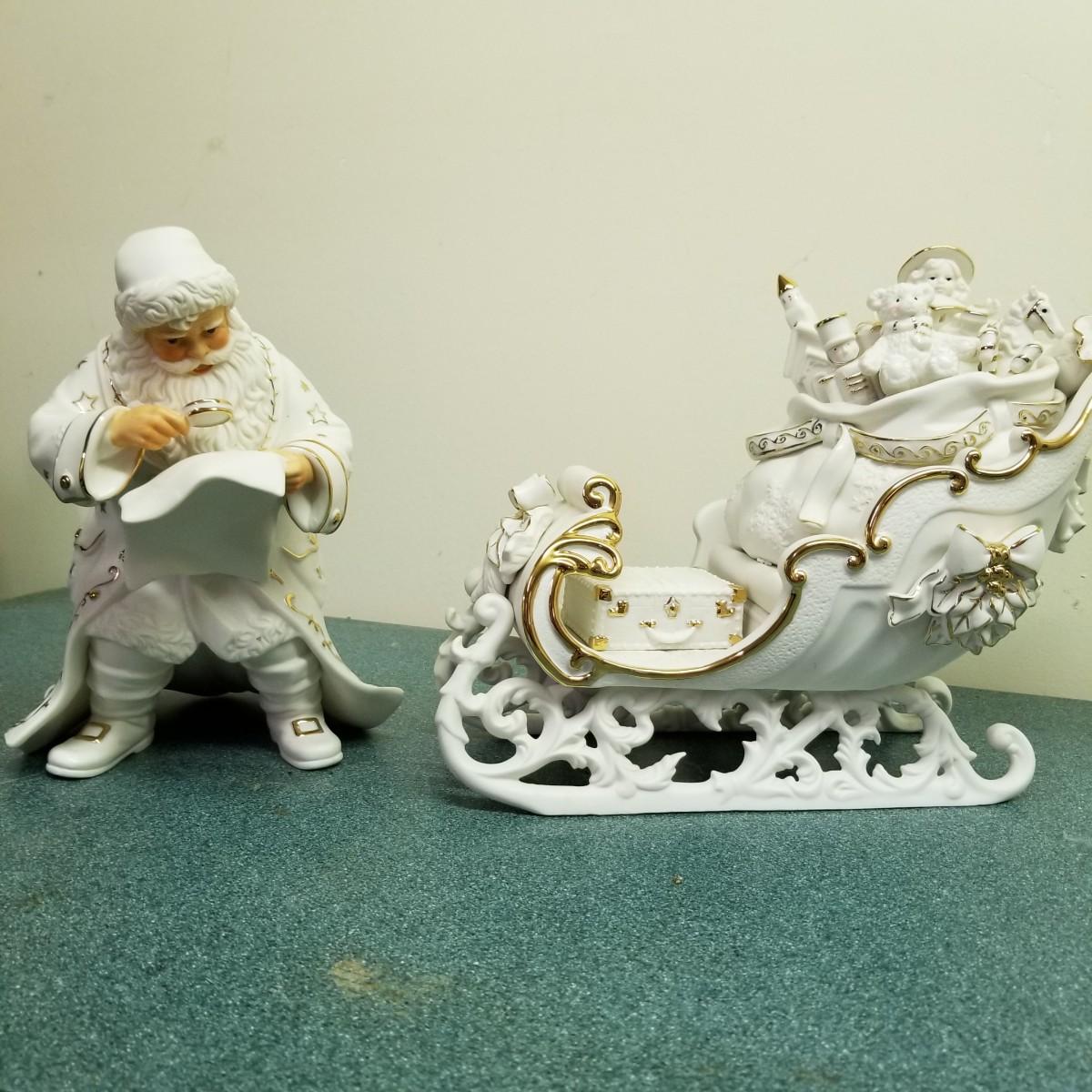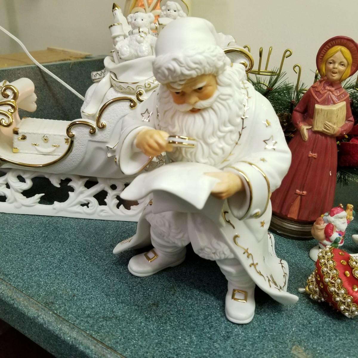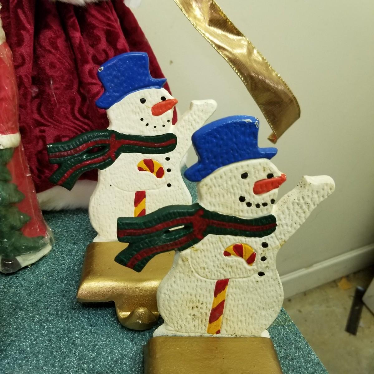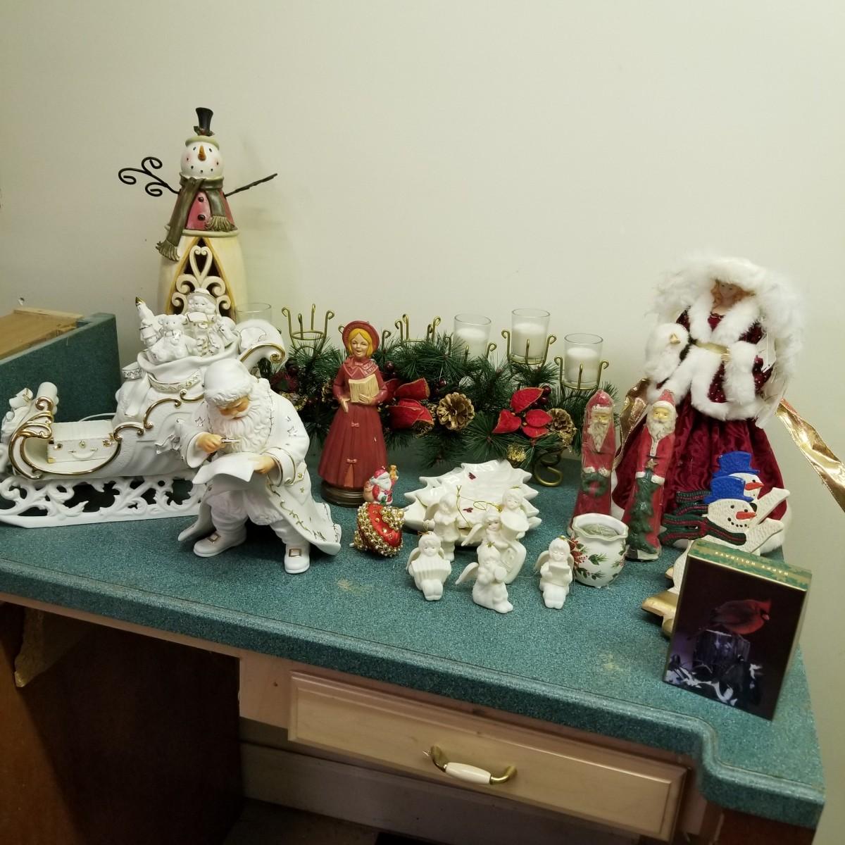 A small collection of joyful Christmas decorations. Two tree stands, 16" and 14", playful angel musician statuettes, a Mrs. Claus tree topper. Also includes two Grandeur Noel pieces, Santa and his sleigh. Trays, stocking hangers, three Currier & Ives plates that are7”D and more. Joyful lighted snowman is 17" high. Longer candle stand is missing some candle holders. See photos for details. Shipping available.