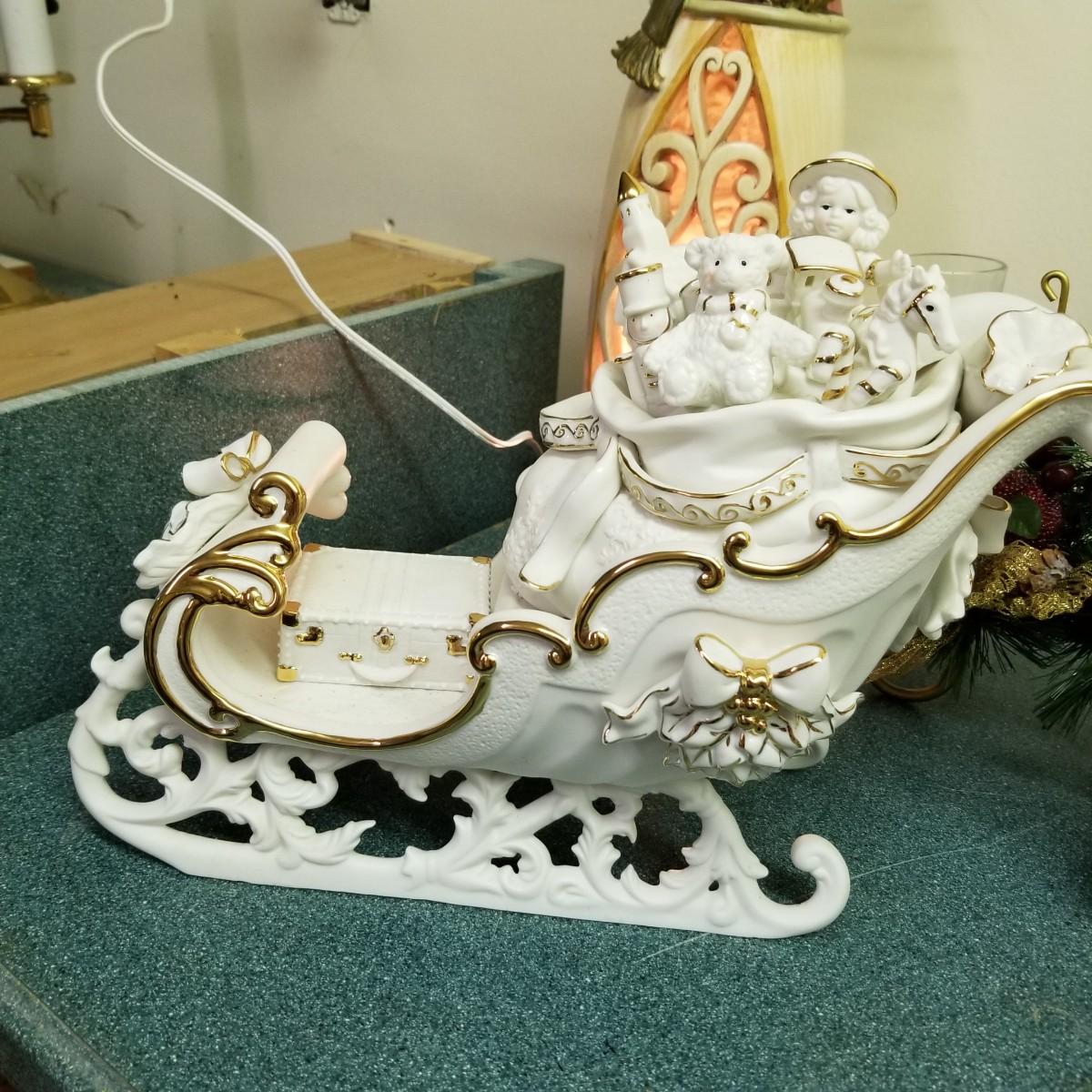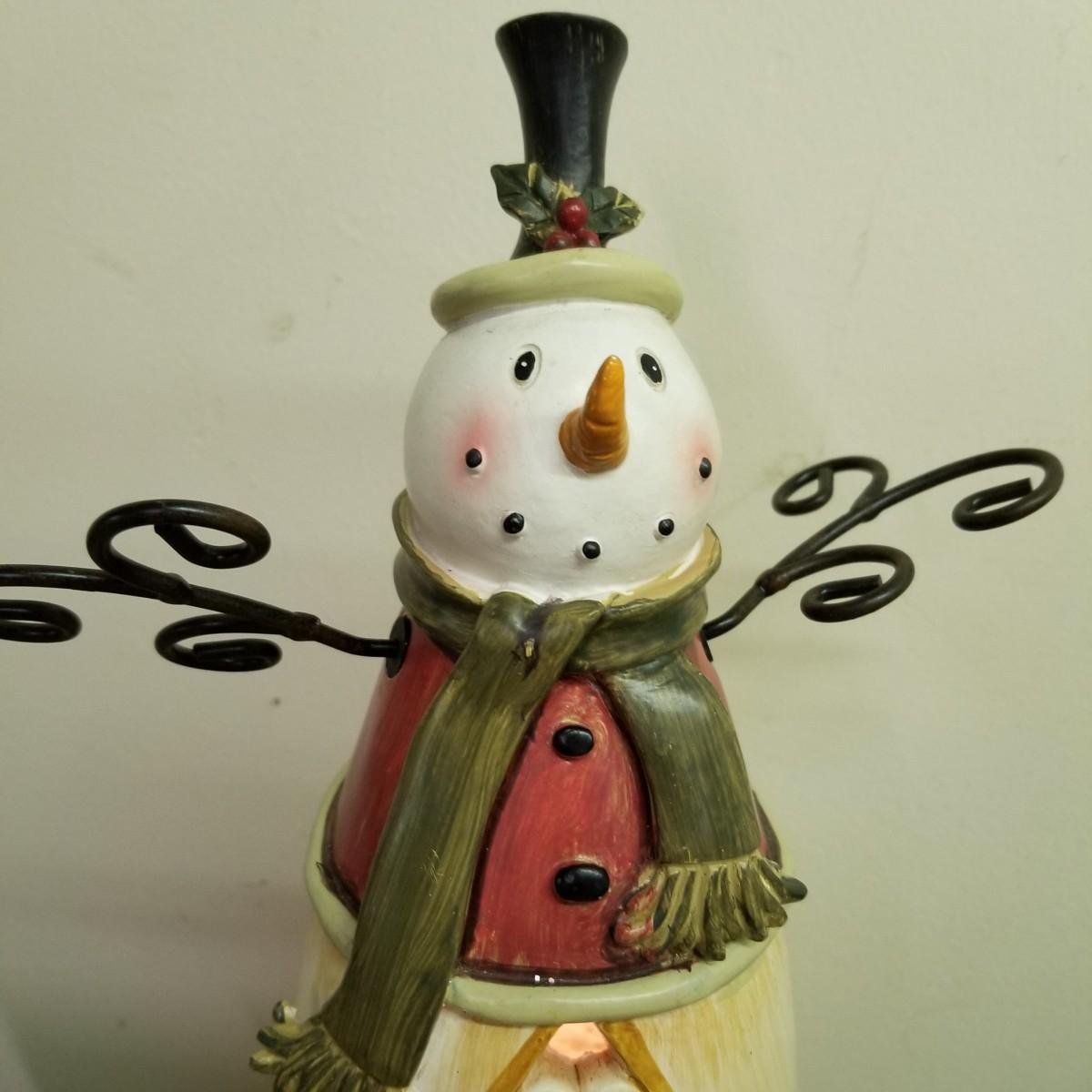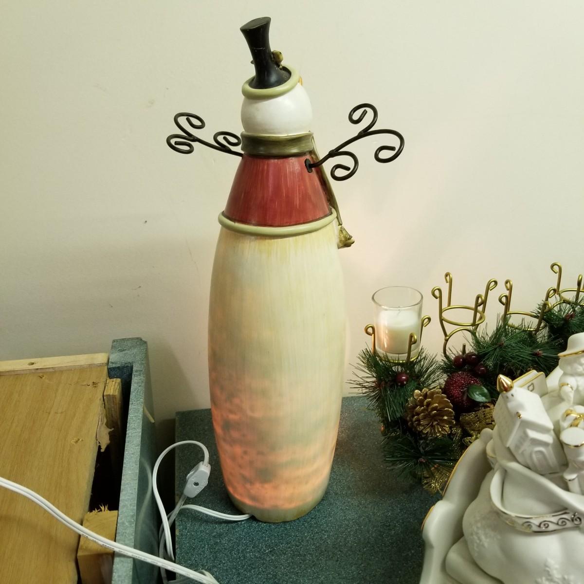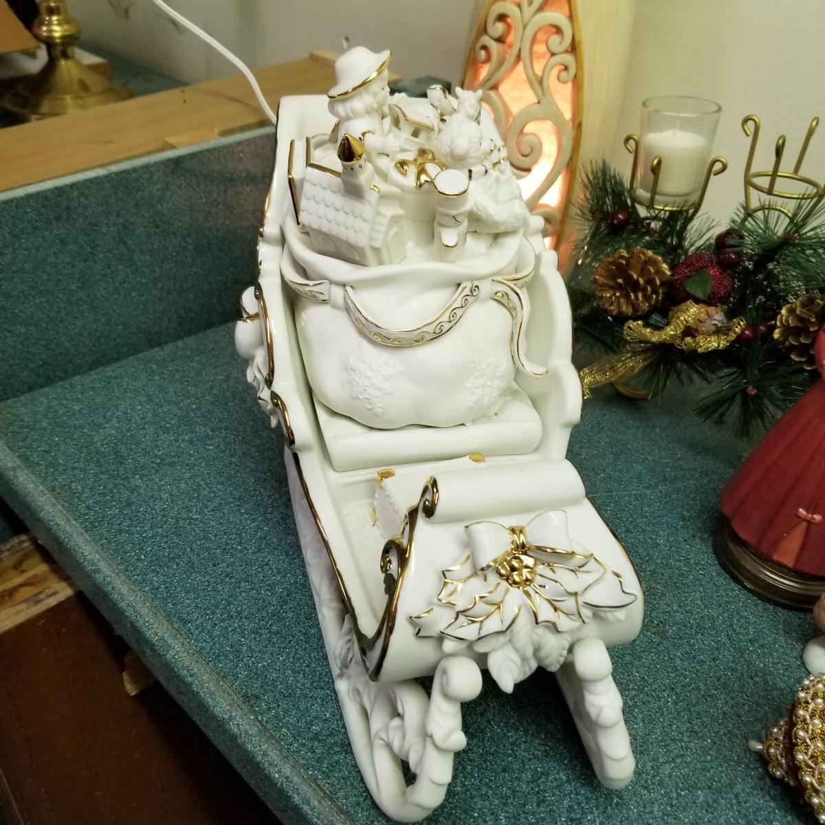 A small collection of joyful Christmas decorations. Two tree stands, 16" and 14", playful angel musician statuettes, a Mrs. Claus tree topper. Also includes two Grandeur Noel pieces, Santa and his sleigh. Trays, stocking hangers, three Currier & Ives plates that are7”D and more. Joyful lighted snowman is 17" high. Longer candle stand is missing some candle holders. See photos for details. Shipping available.