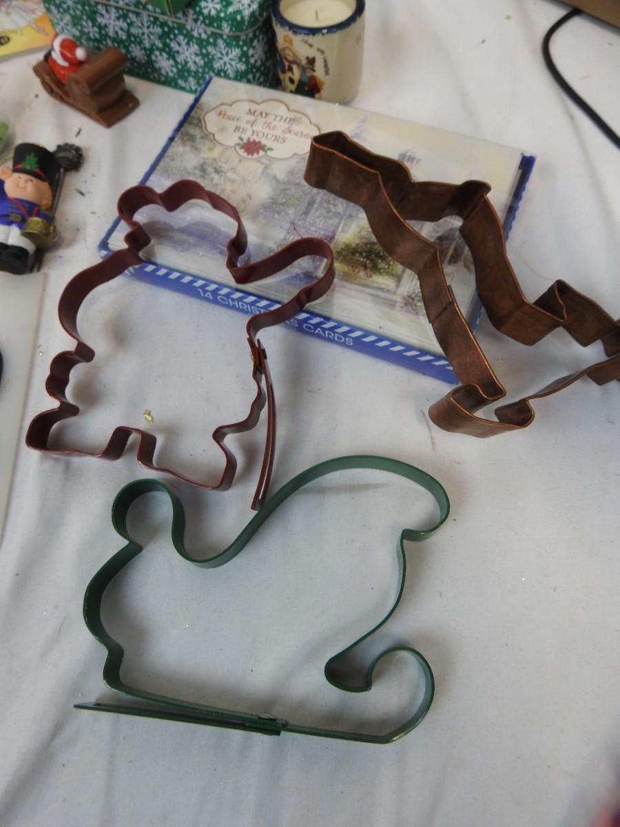 Assorted Christmas Lot: Cookie Cutters, Green Candles, Note Pads, Candle Holders