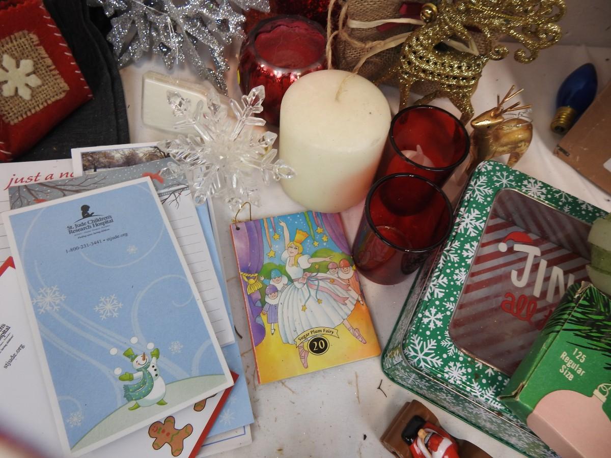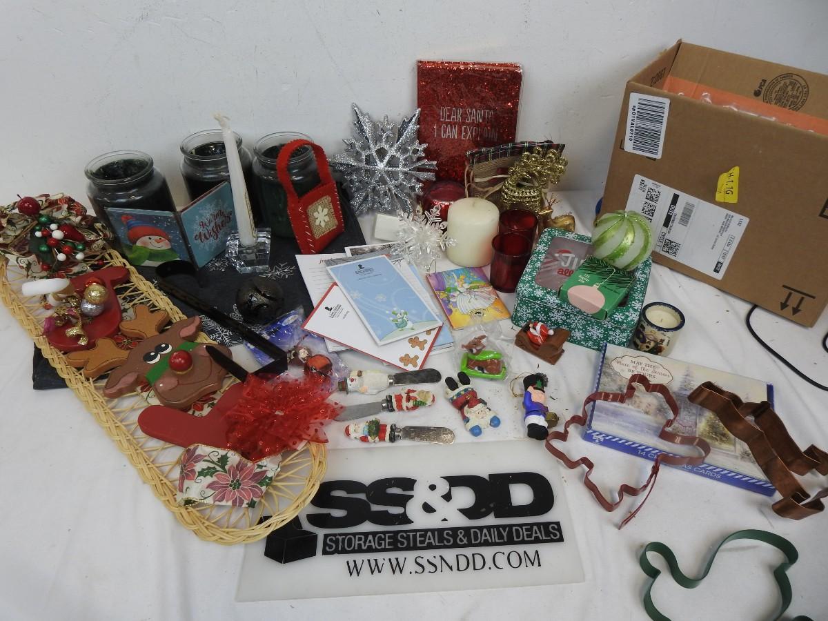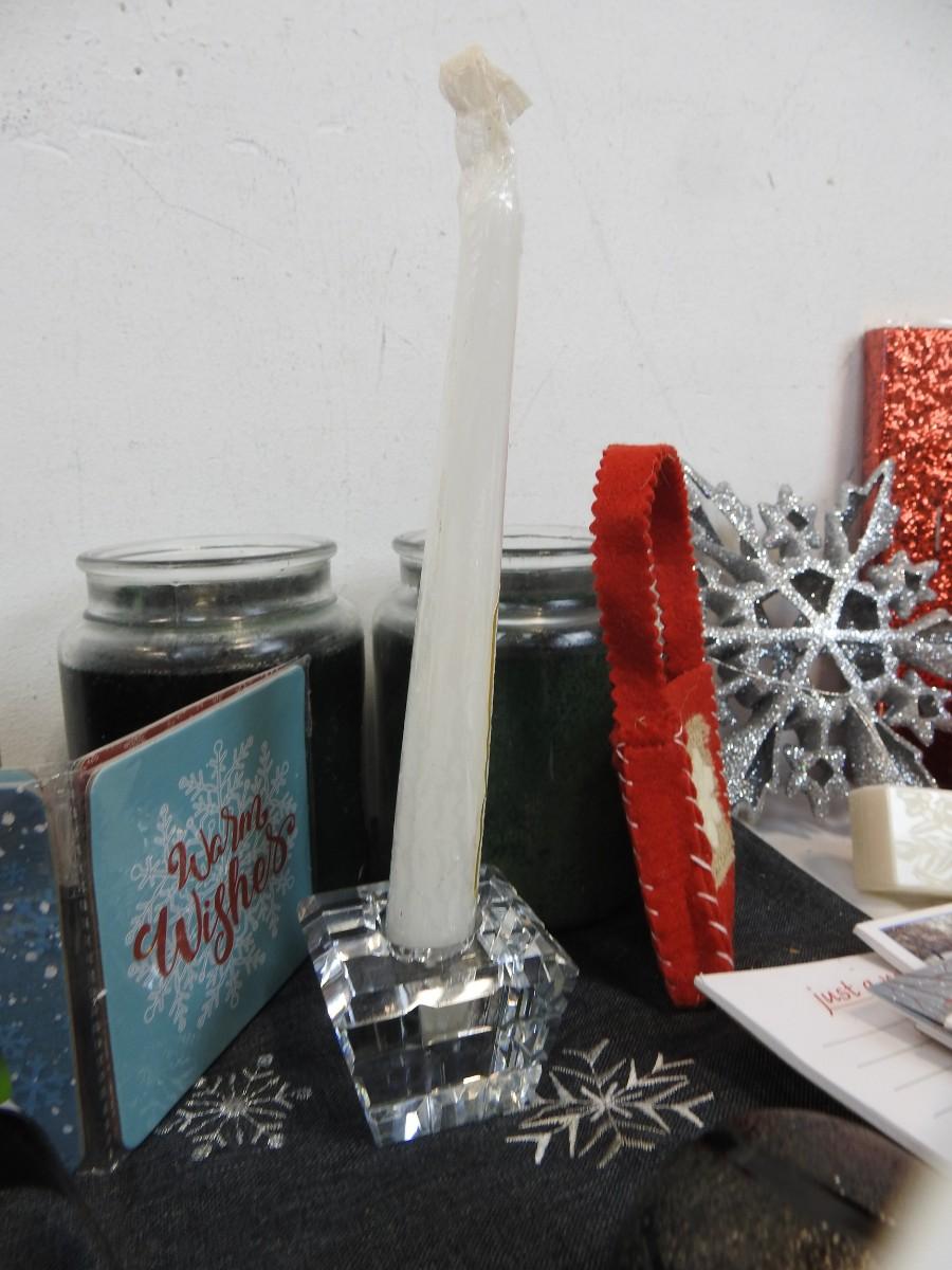 Assorted Christmas Lot: Cookie Cutters, Green Candles, Note Pads, Candle Holders, Stocking Holders