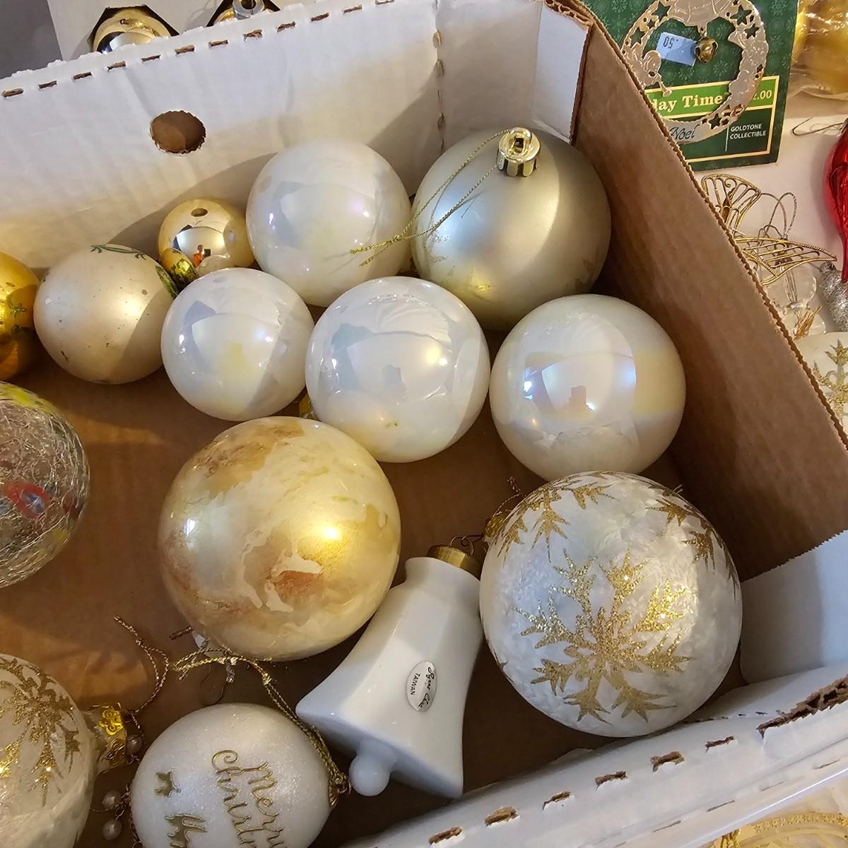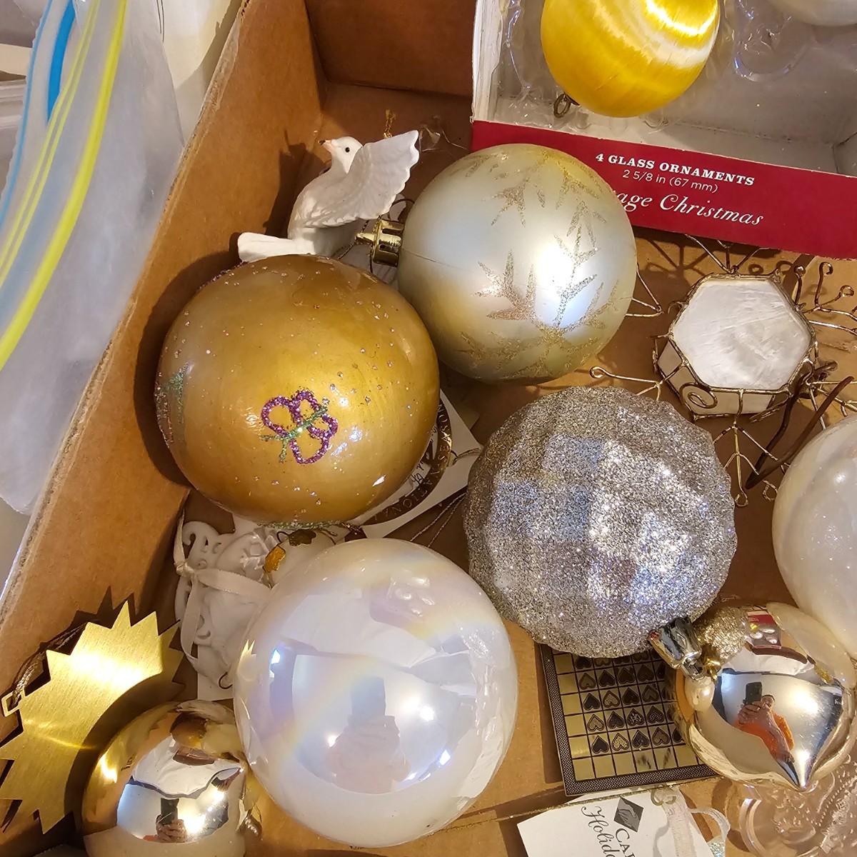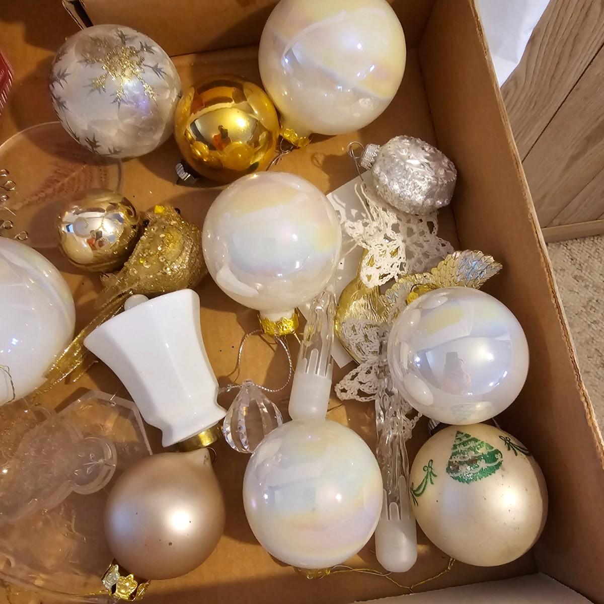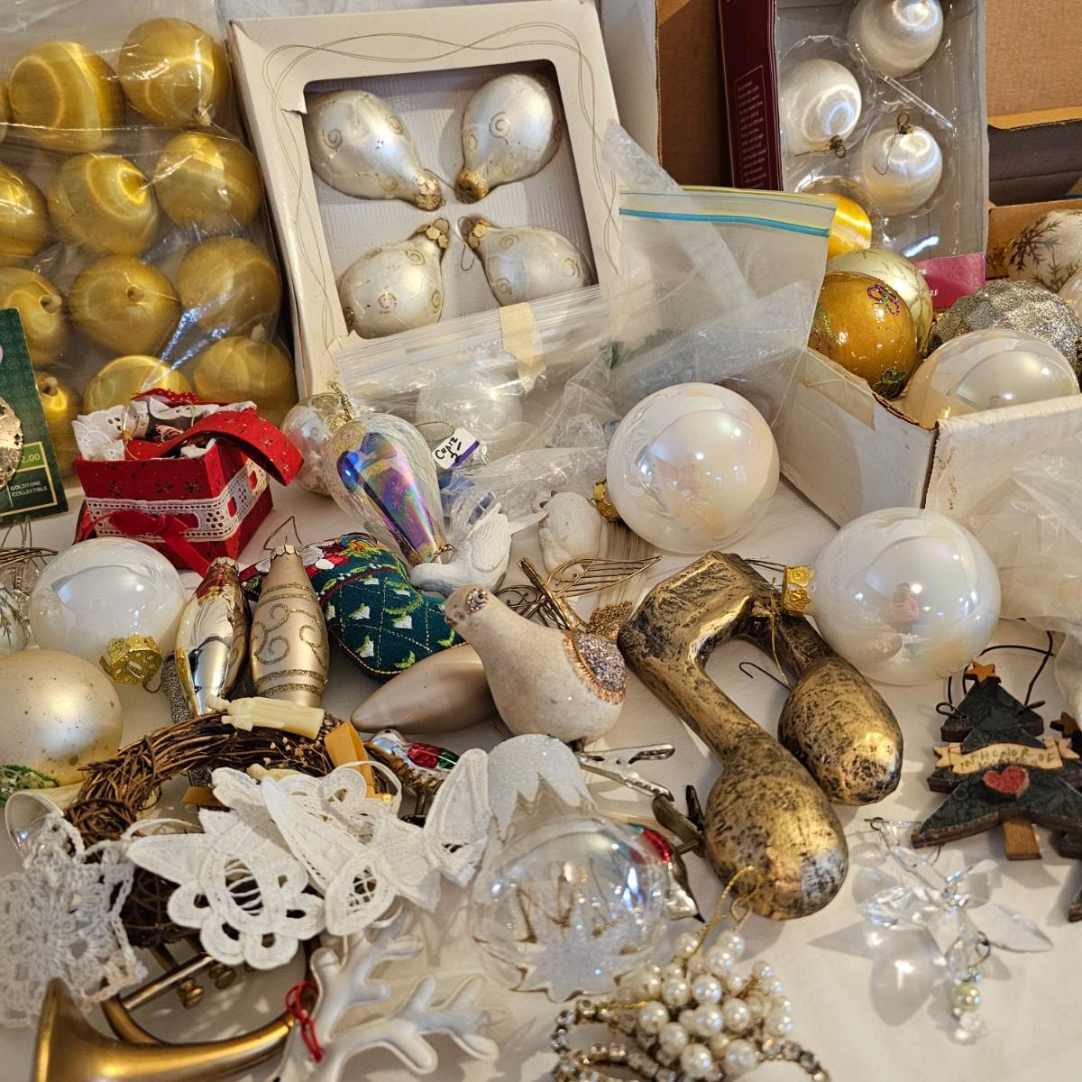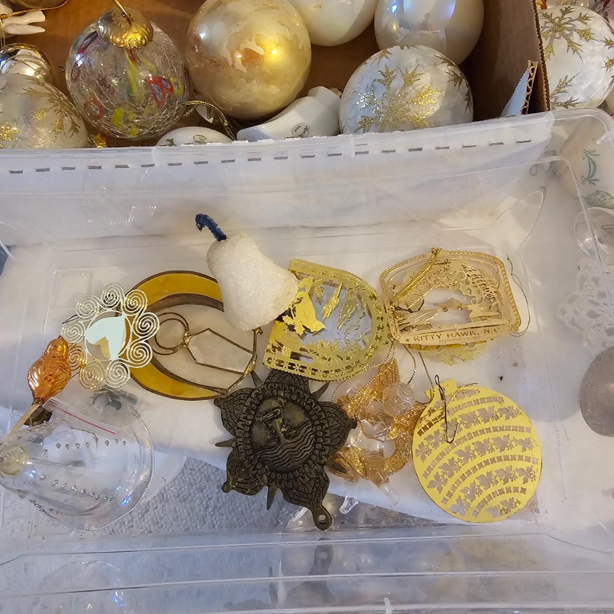 Many different kinds and styles of Christmas ornaments and decorations. Glass, plastic, brass, pewter, more. Round balls, birds, flat brass cutouts, clip ons. Color mostly gold and white but some variations. See photos for details. Shipping available.