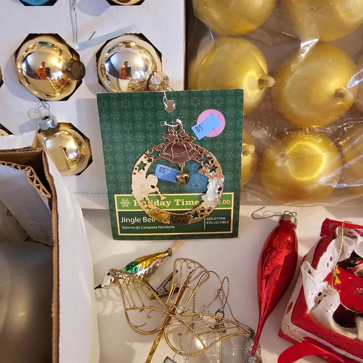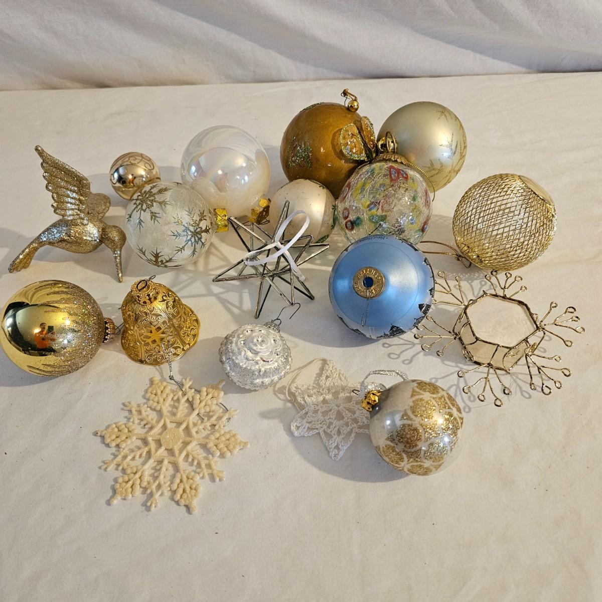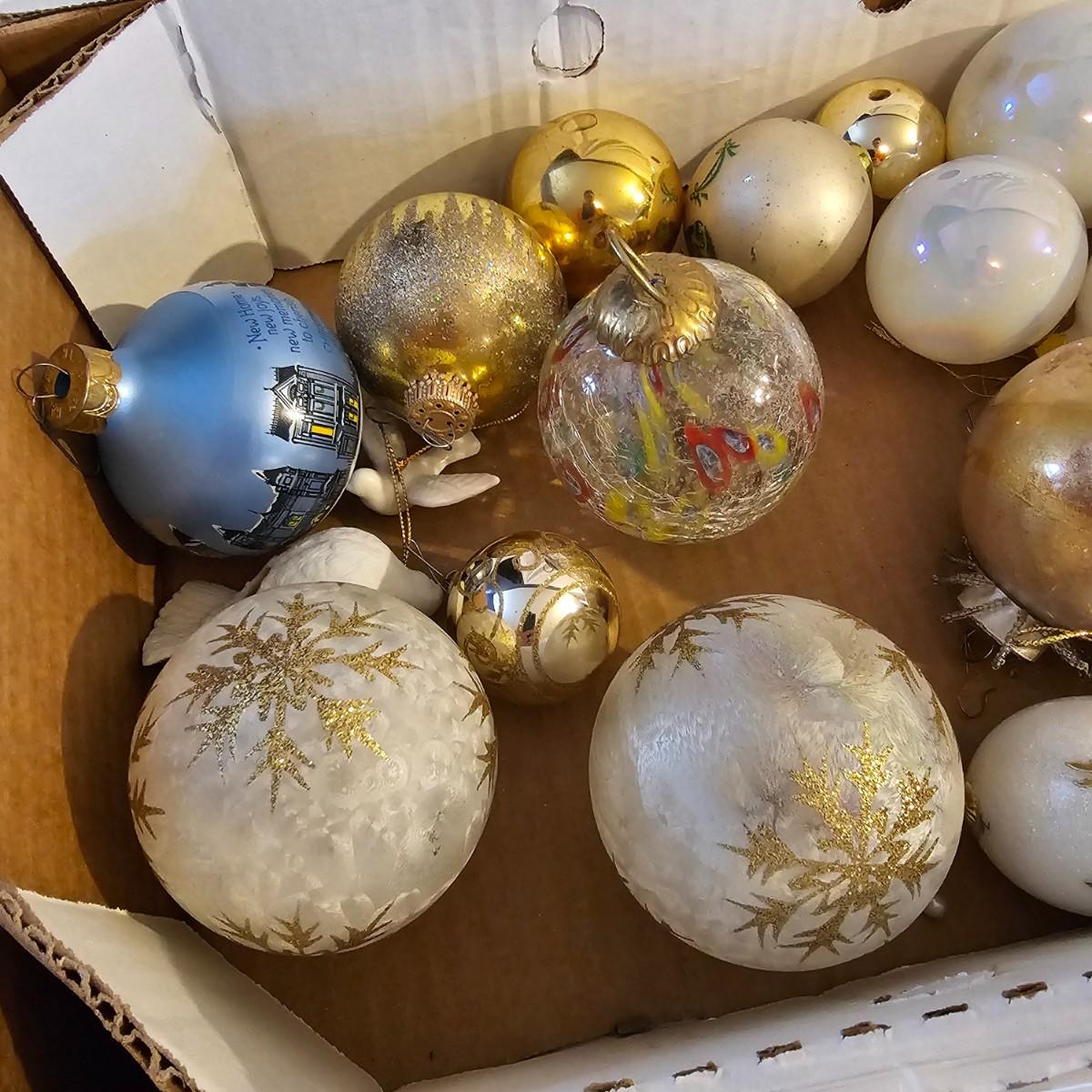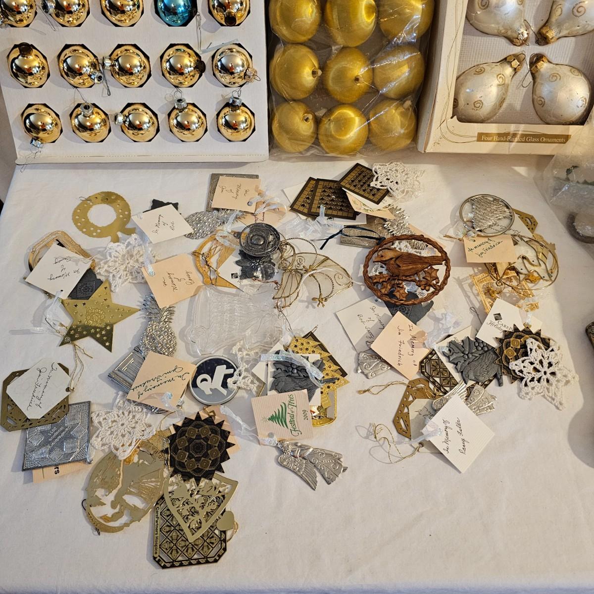 Many different kinds and styles of Christmas ornaments and decorations. Glass, plastic, brass, pewter, more. Round balls, birds, flat brass cutouts, clip ons. Color mostly gold and white but some variations. See photos for details. Shipping available.