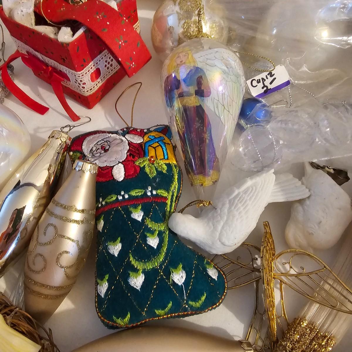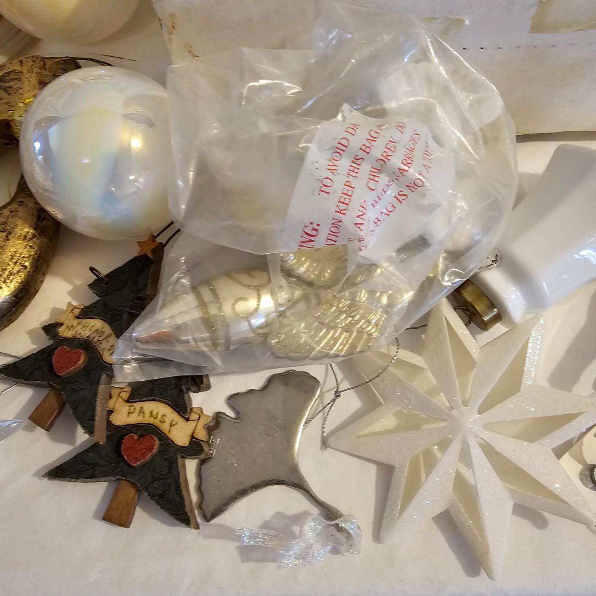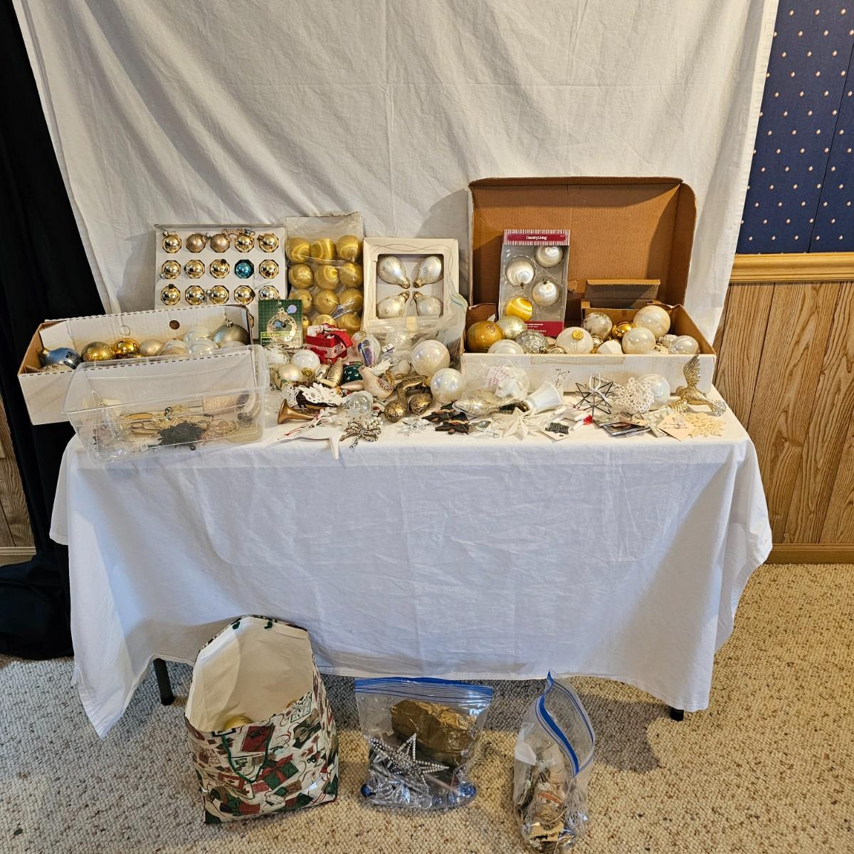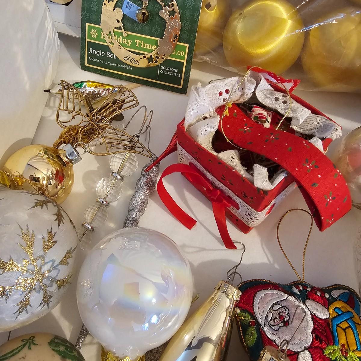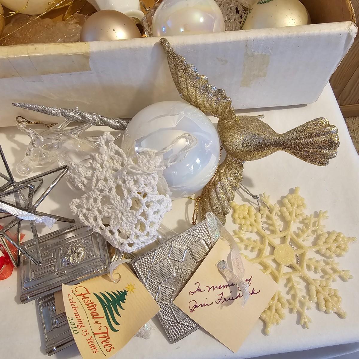 Many different kinds and styles of Christmas ornaments and decorations. Glass, plastic, brass, pewter, more. Round balls, birds, flat brass cutouts, clip ons. Color mostly gold and white but some variations. See photos for details. Shipping available.
