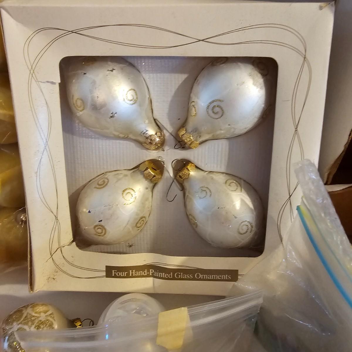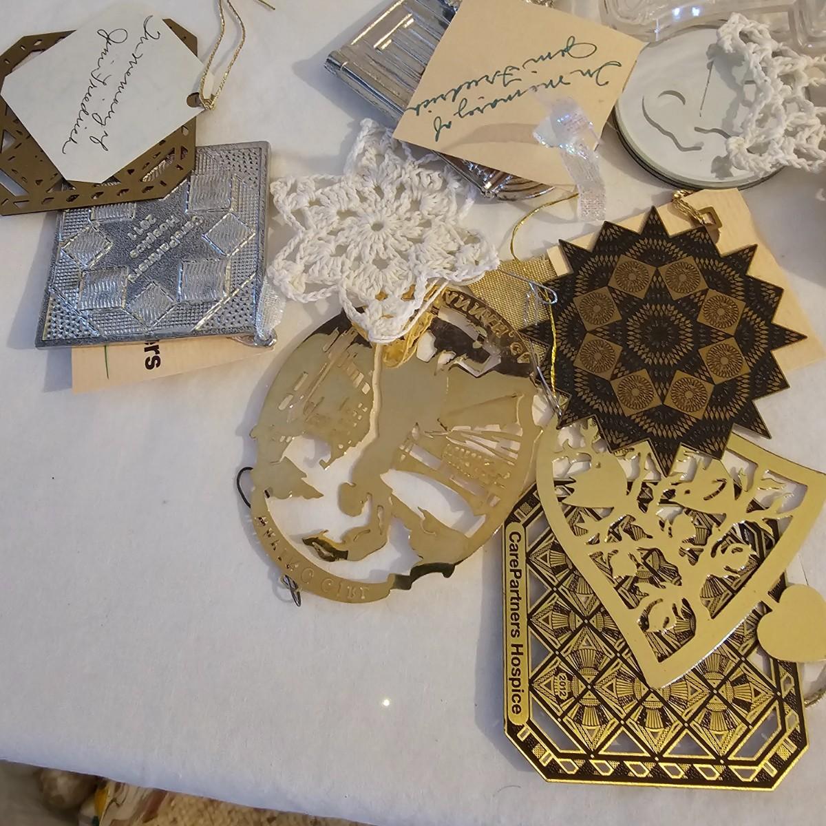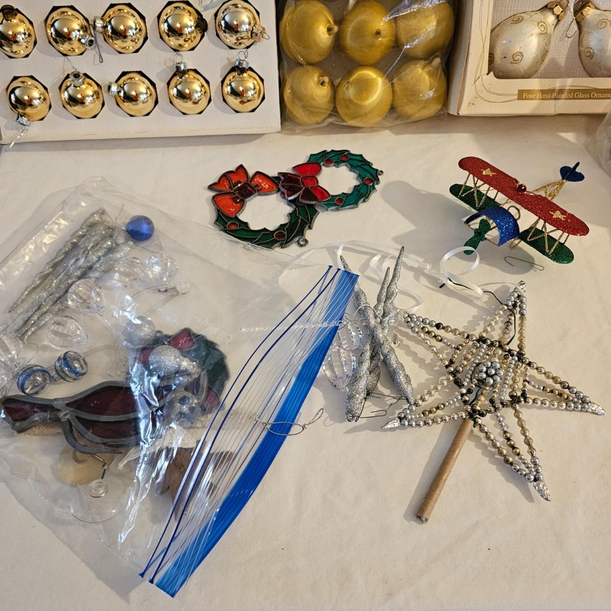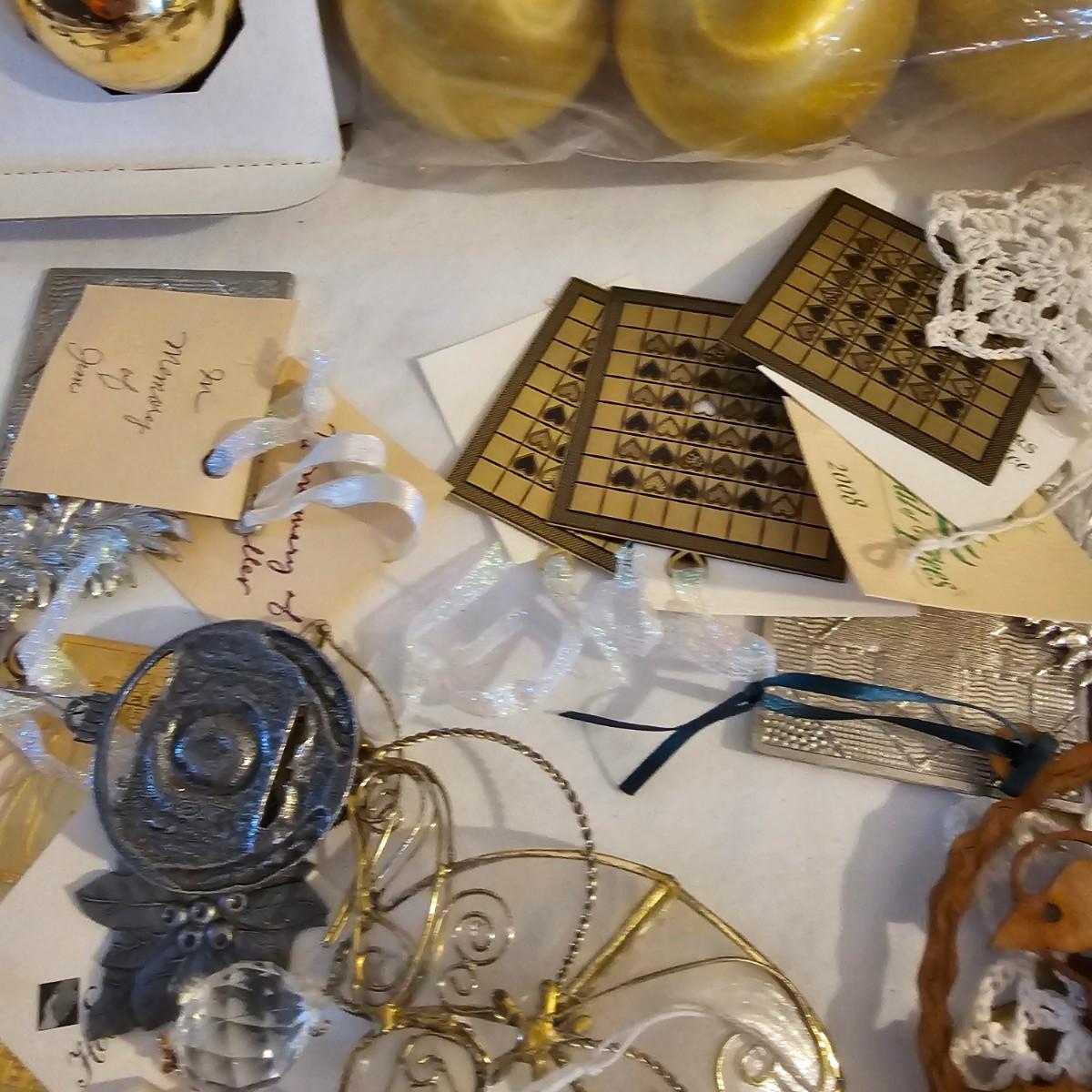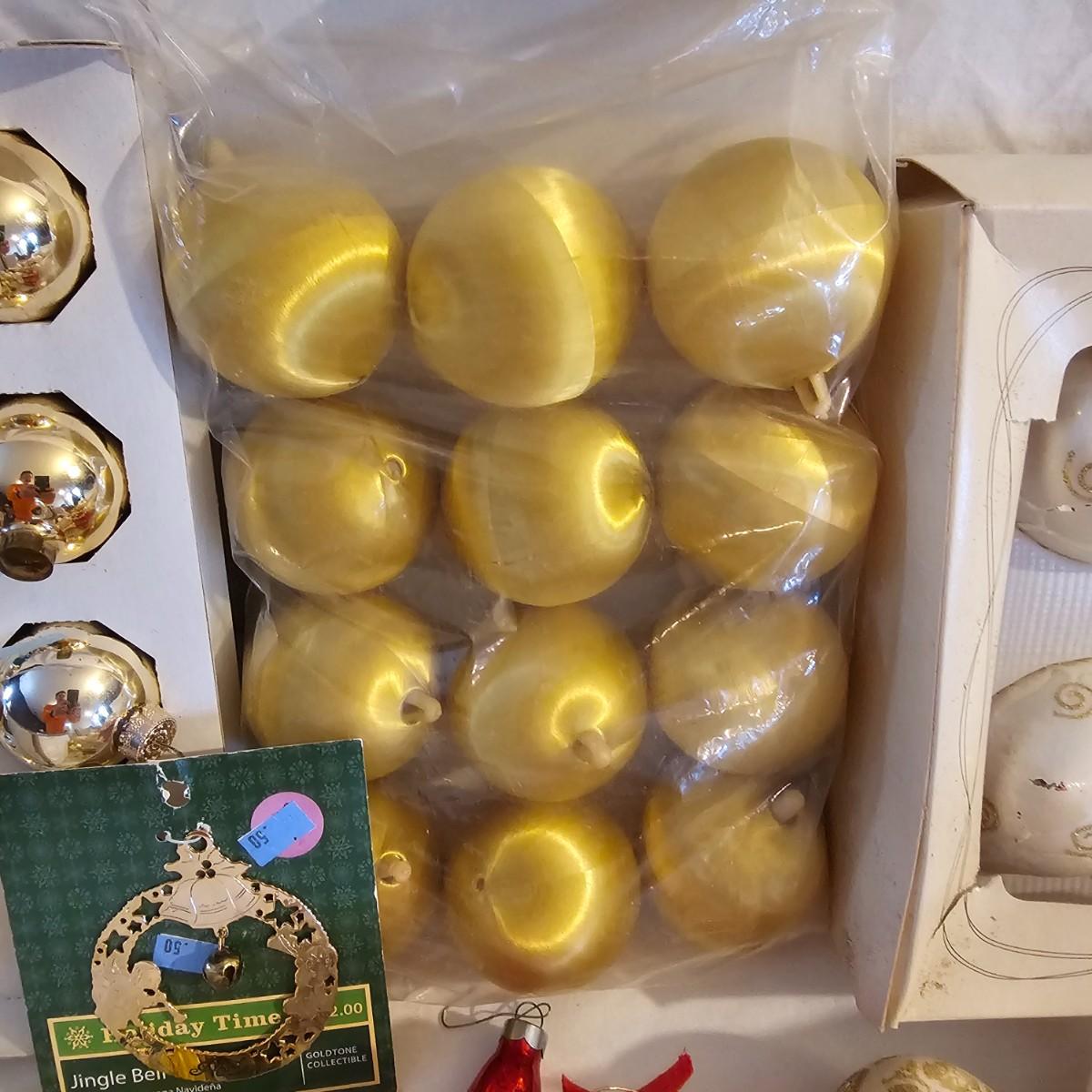 Many different kinds and styles of Christmas ornaments and decorations. Glass, plastic, brass, pewter, more. Round balls, birds, flat brass cutouts, clip ons. Color mostly gold and white but some variations. See photos for details. Shipping available.