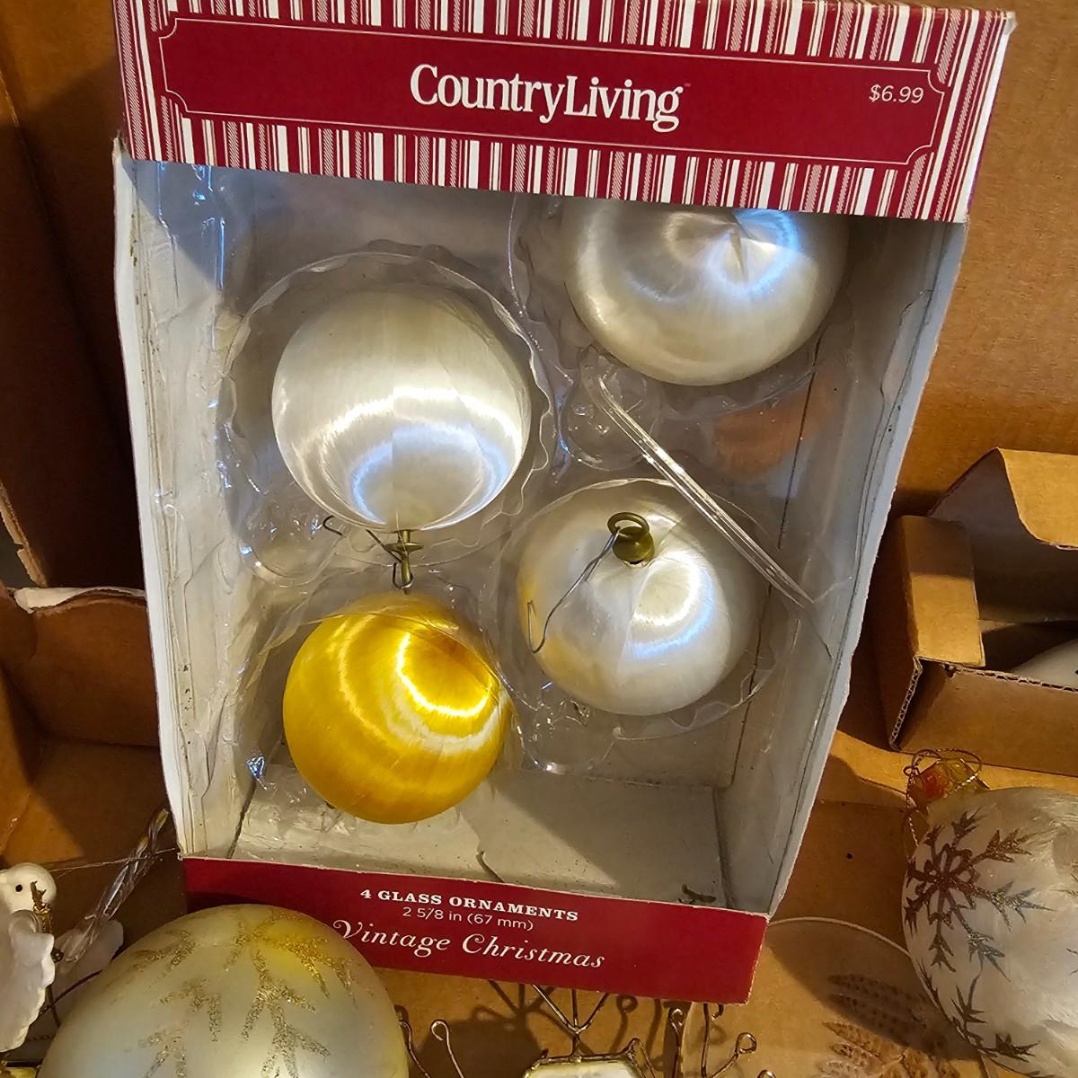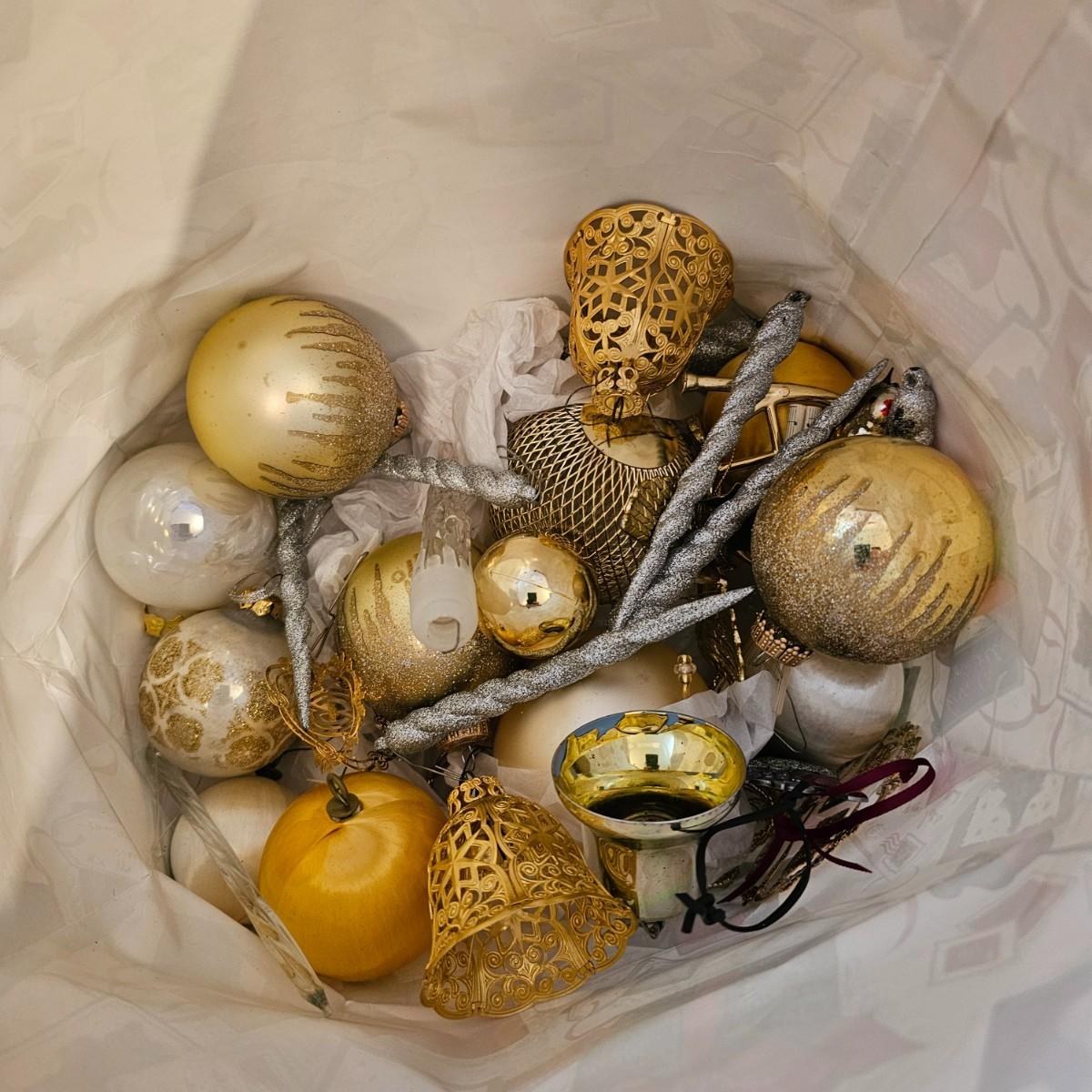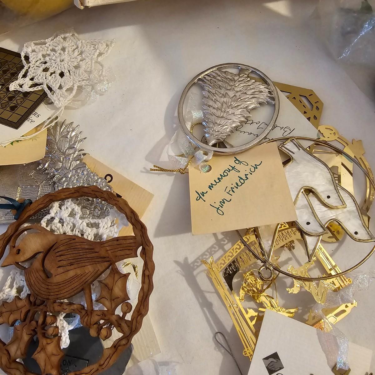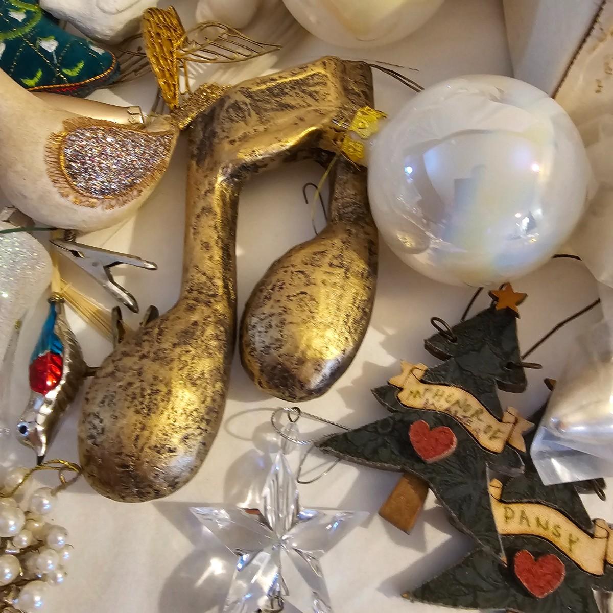 Many different kinds and styles of Christmas ornaments and decorations. Glass, plastic, brass, pewter, more. Round balls, birds, flat brass cutouts, clip ons. Color mostly gold and white but some variations. See photos for details. Shipping available.